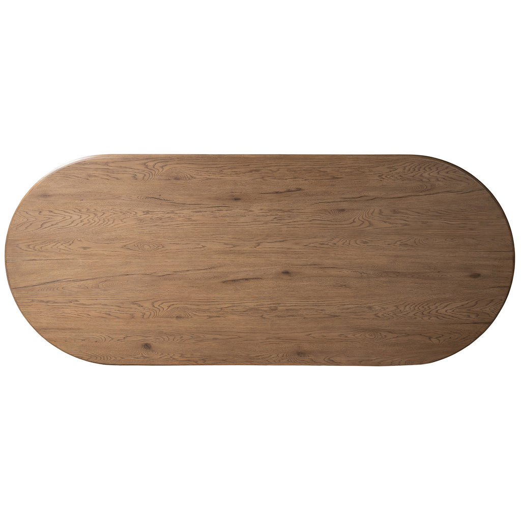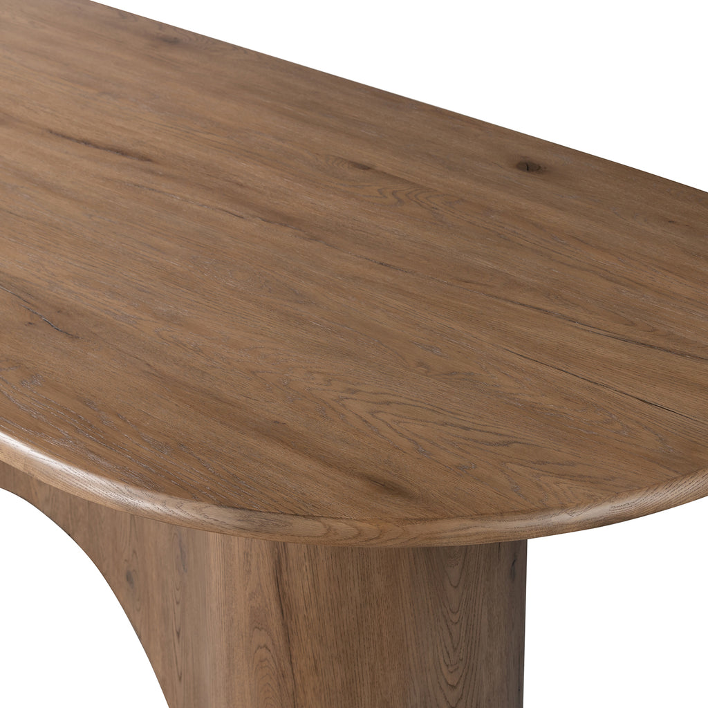 Unique and shape-driven, a dining table of light-finished oak features a curved, sculptural base for a fluid look. Seats 10.
