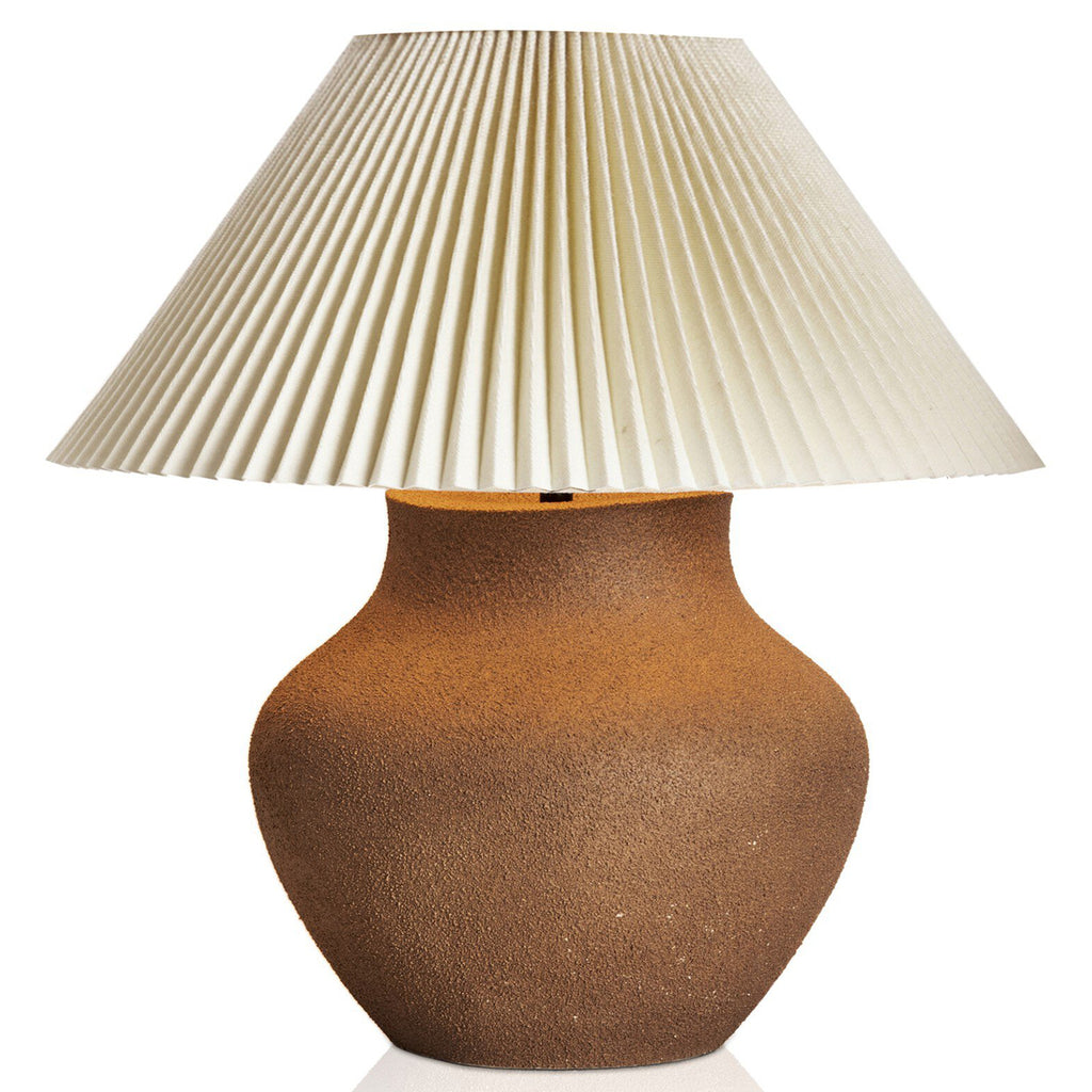 Sculpted like a vintage vase, the ceramic lamp has a dark, textured sand finish for organic character. Topped with a pleated linen shade.