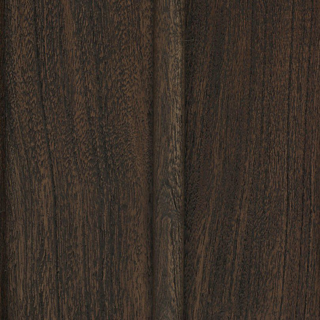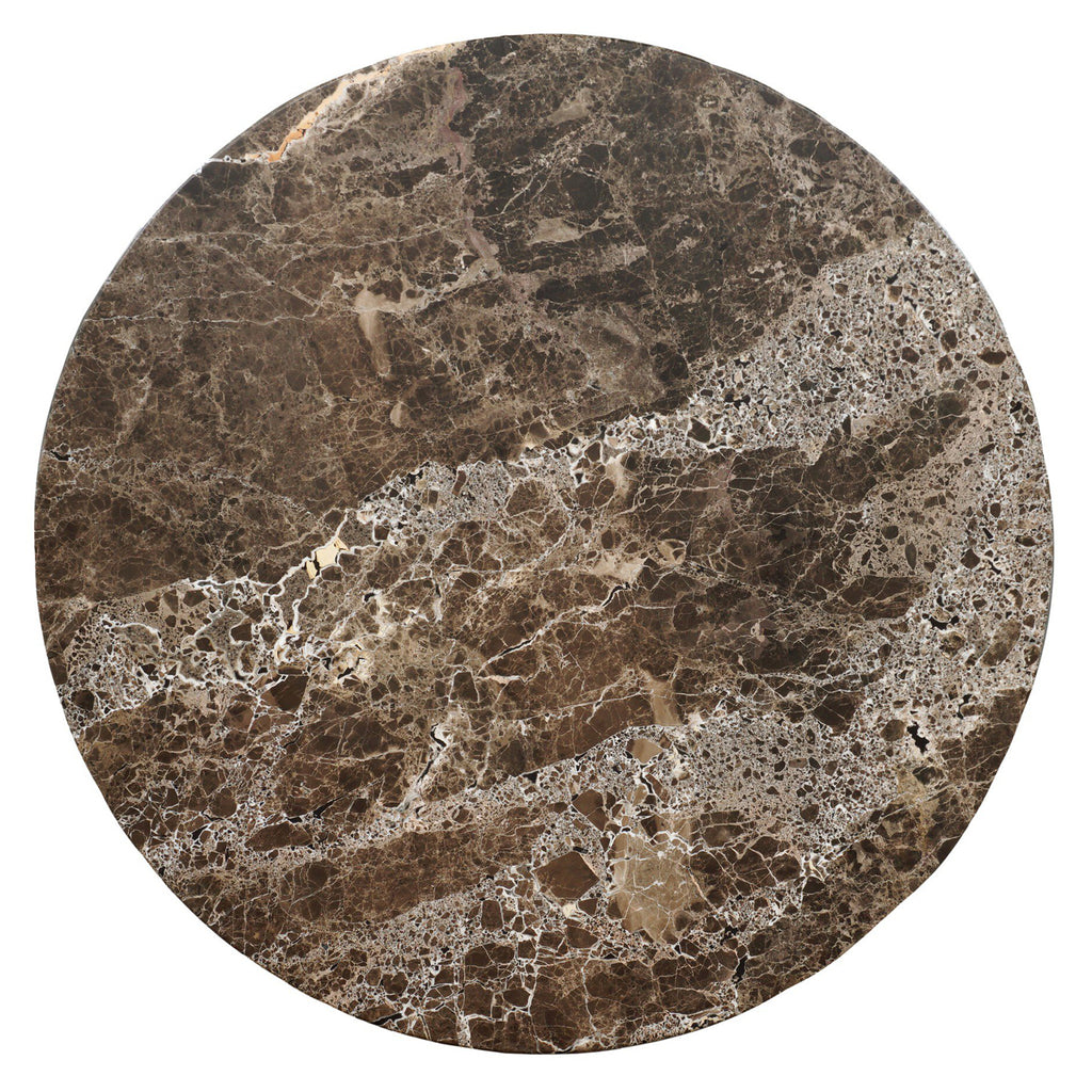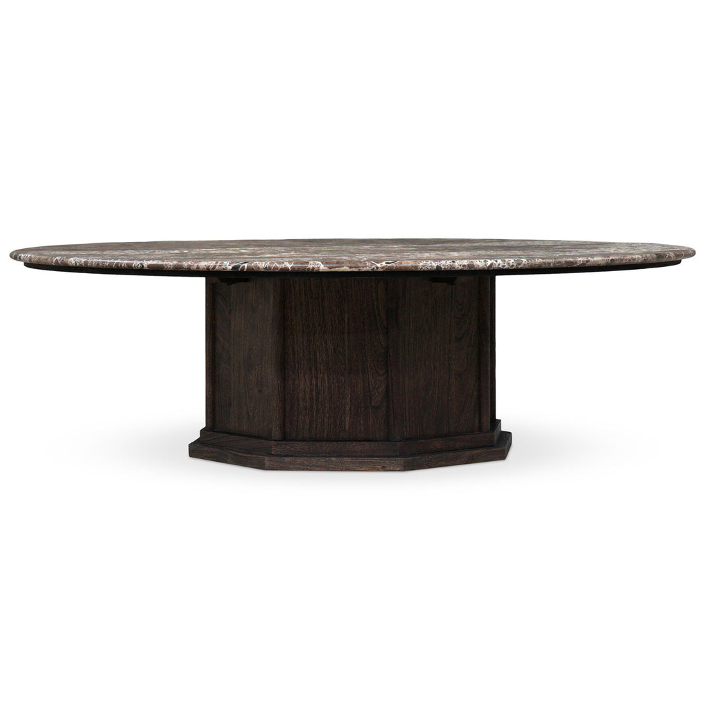 Mixed materials refresh this traditional dining style, pairing a thick, wide base of dark brown acacia with brown marble rich with natural veining. Two-step detailing on the base elevates the whole look.