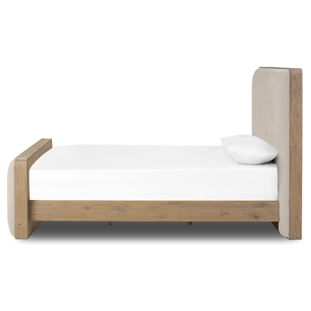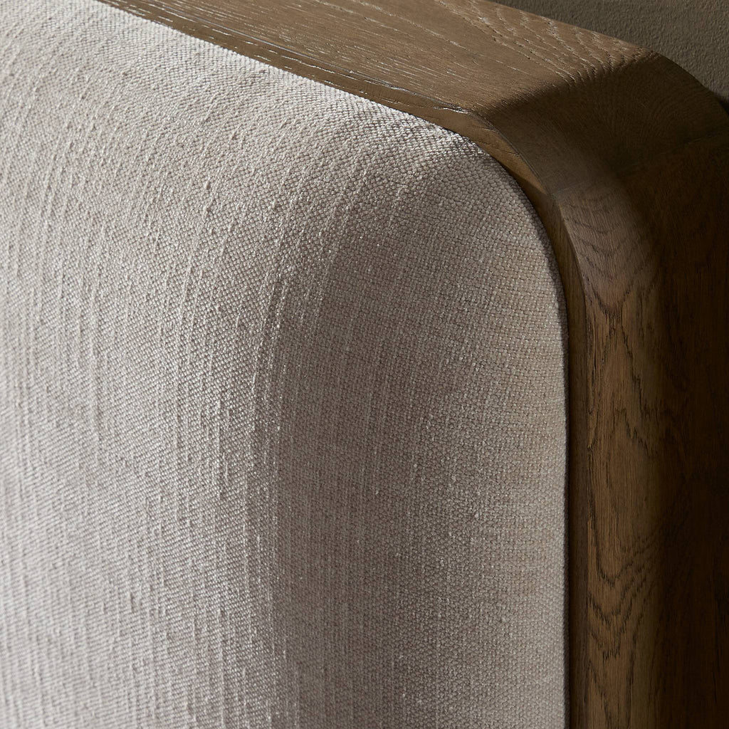 Settle in with the soft contours of a timeless bedroom style. With subtly rounded corners, aged solid oak frames upholstered head and foot boards, for an inviting look that moves between spaces and styles with ease.