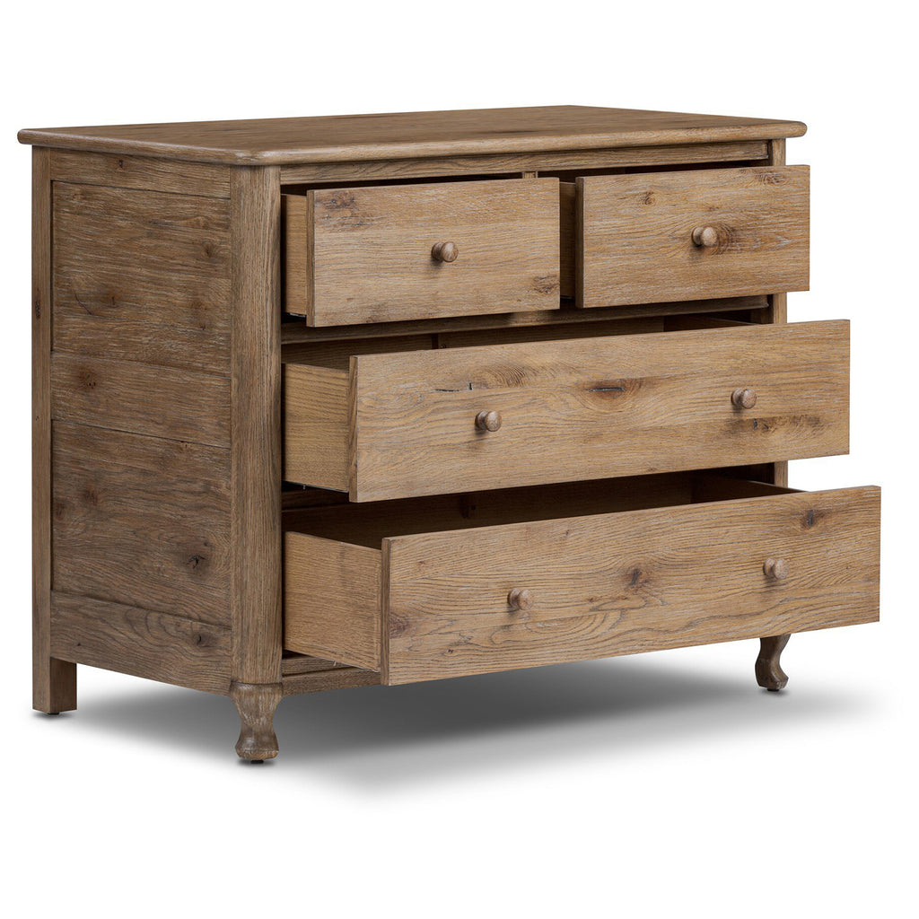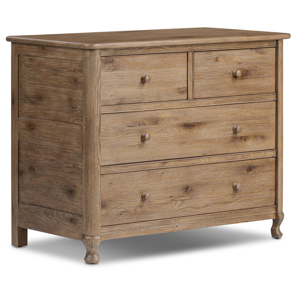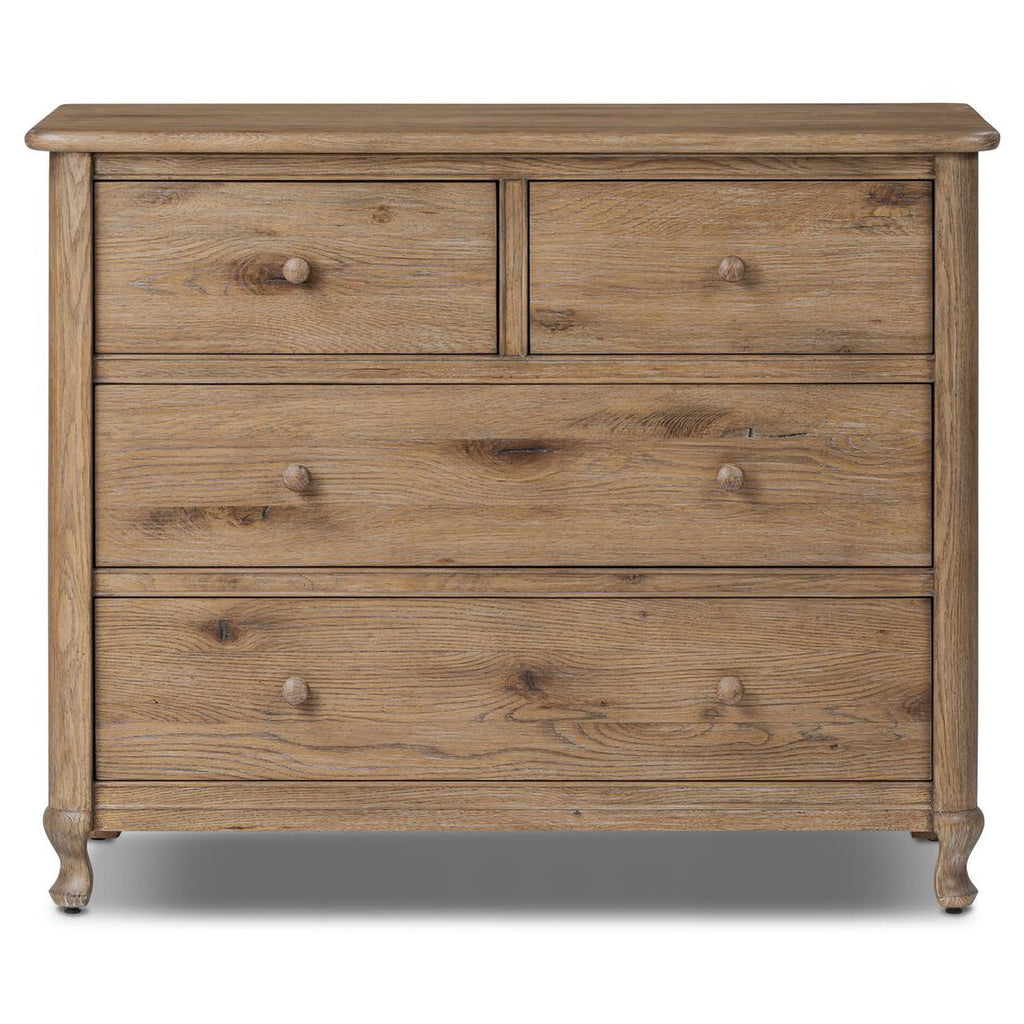 A classic chest stores in everlasting style. Crafted with heavy weathered oak with natural cracks and graining, the front has beading around the drawers for an heirloom appeal. It's finished in a tonal brown, with turned wood hardware.