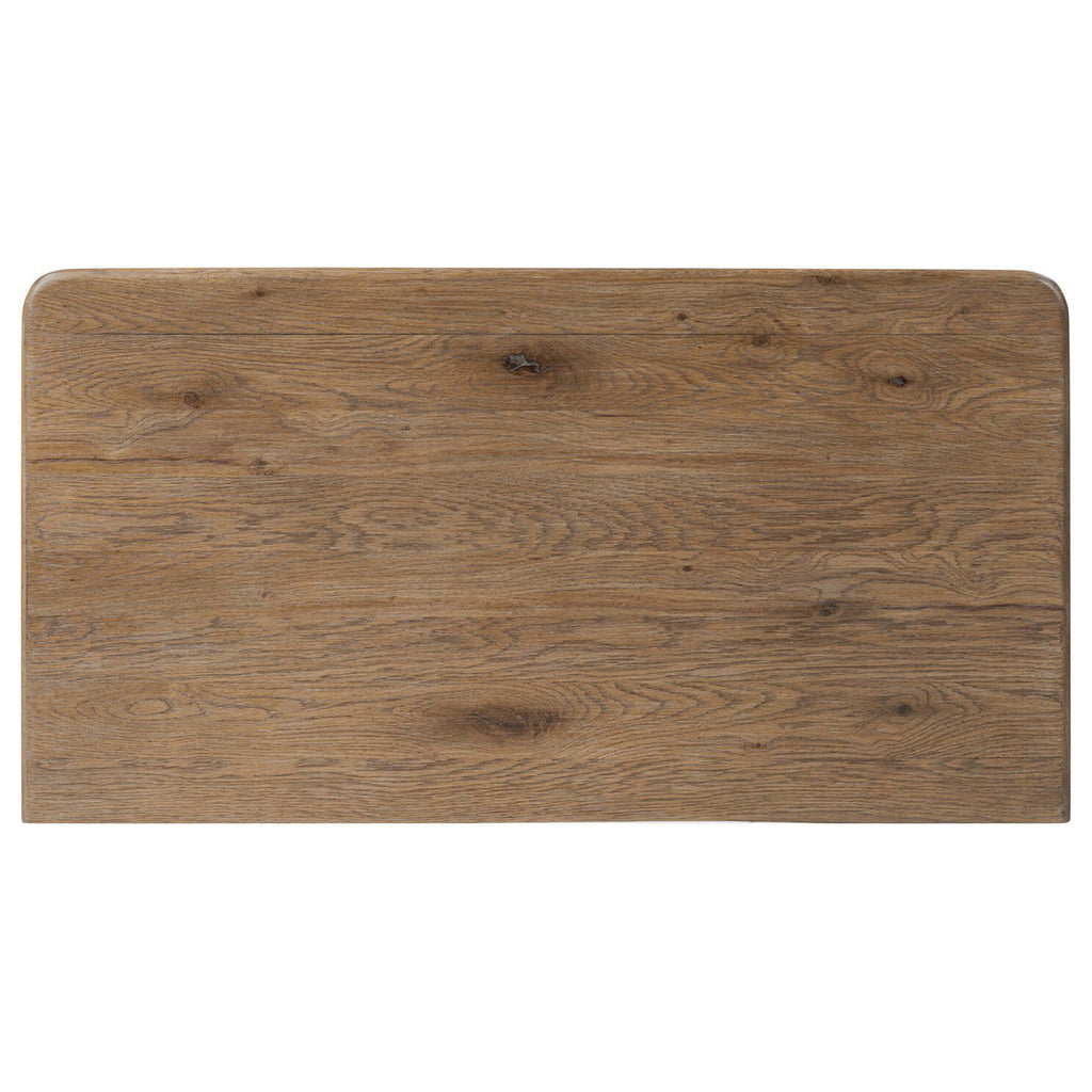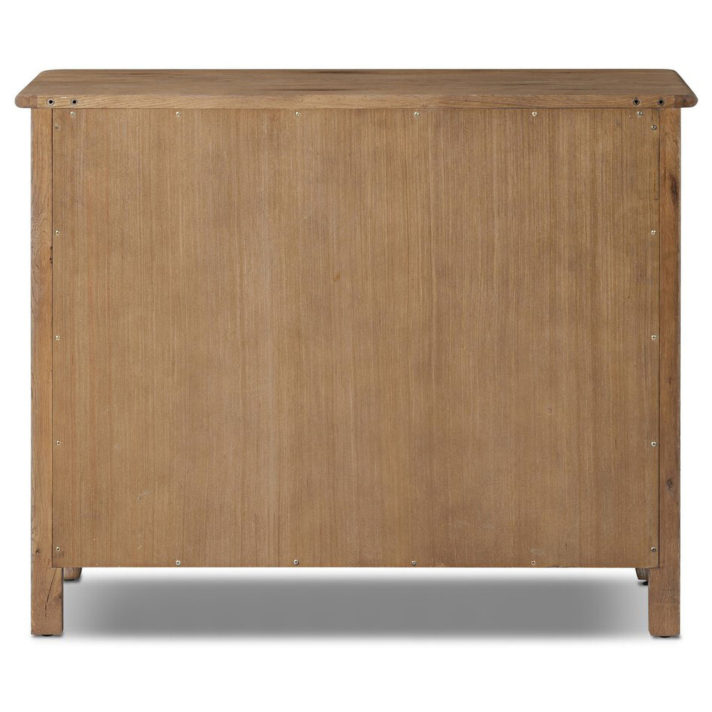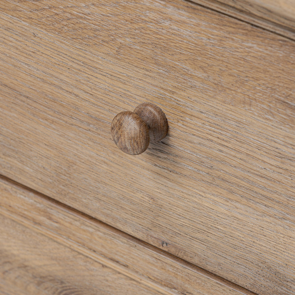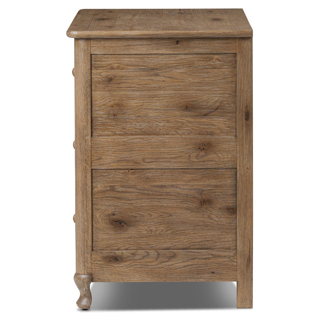 A classic chest stores in everlasting style. Crafted with heavy weathered oak with natural cracks and graining, the front has beading around the drawers for an heirloom appeal. It's finished in a tonal brown, with turned wood hardware.