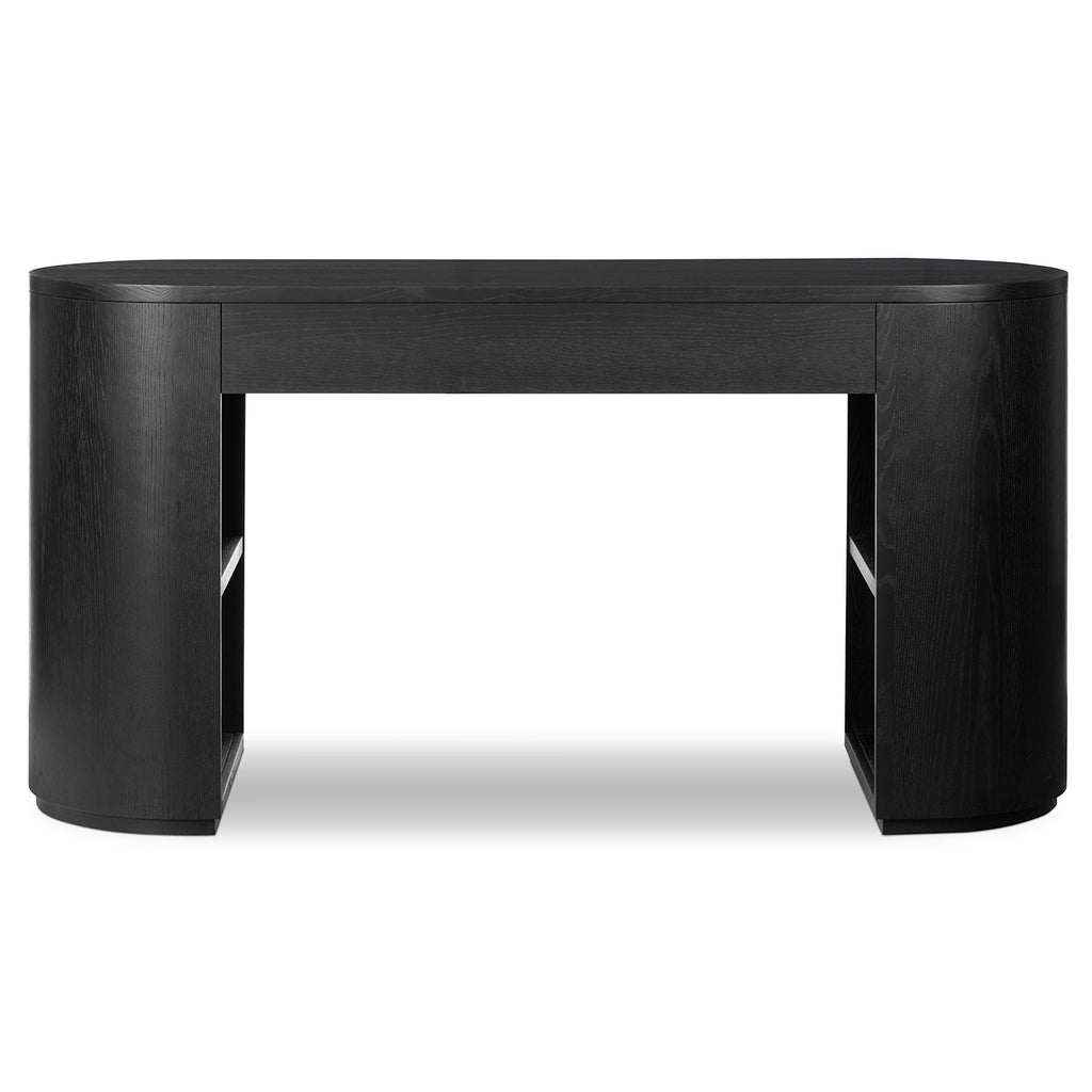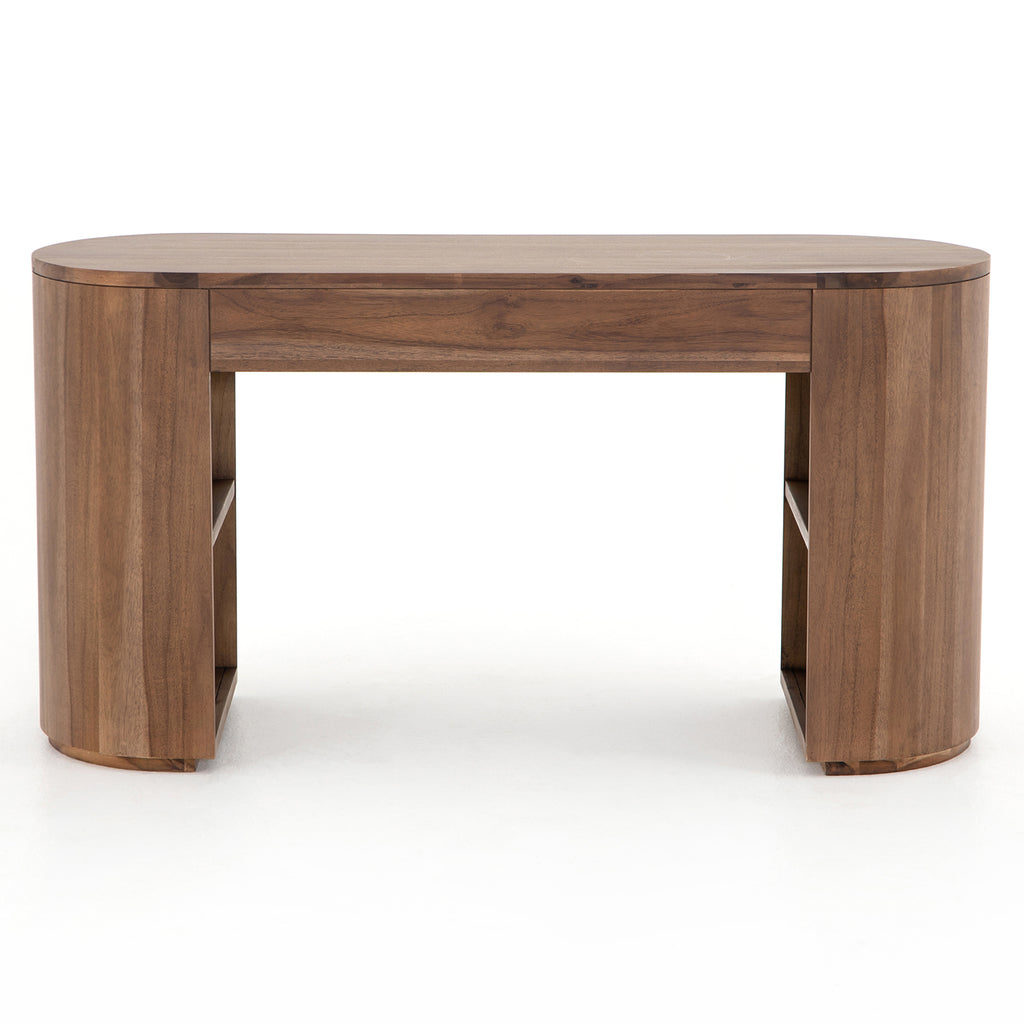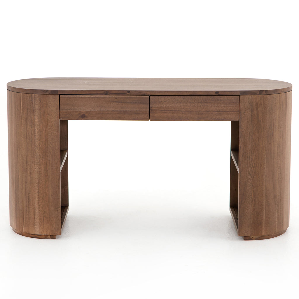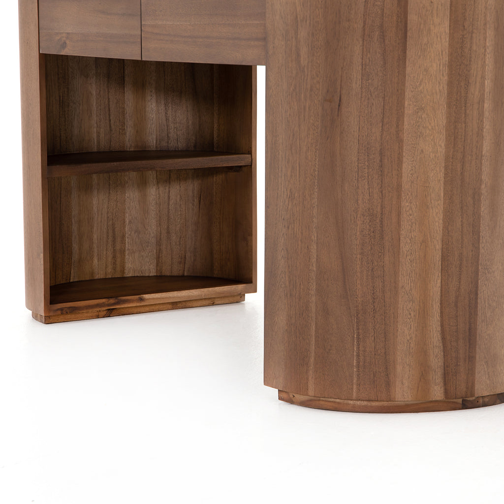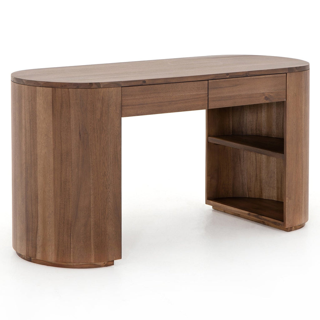 A pill-inspired shape to nod Eighties-era design. Half-cylinder bases feature open interior shelving, with two top pencil drawers to keep supplies handy.