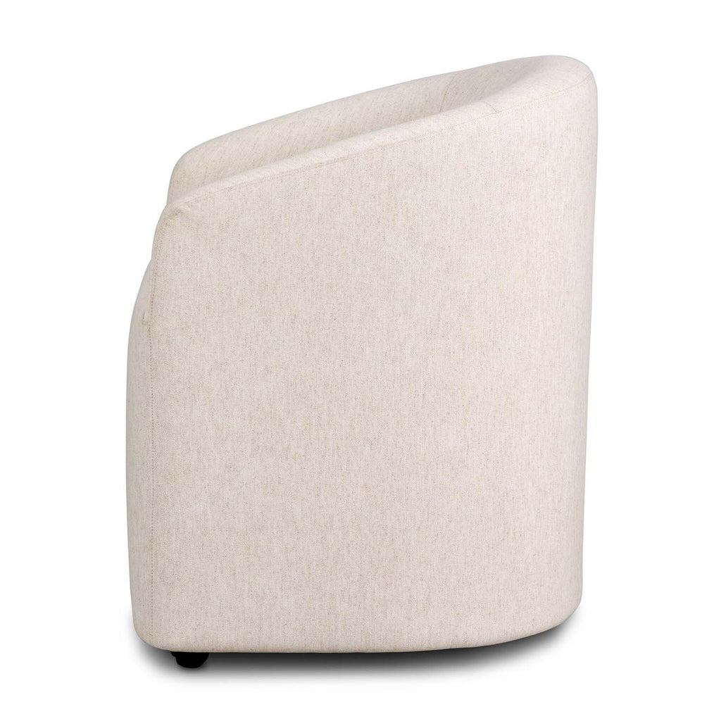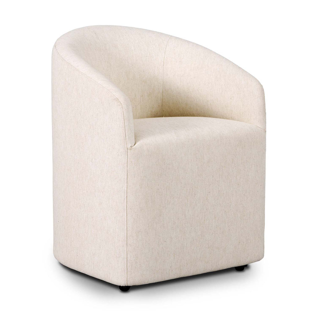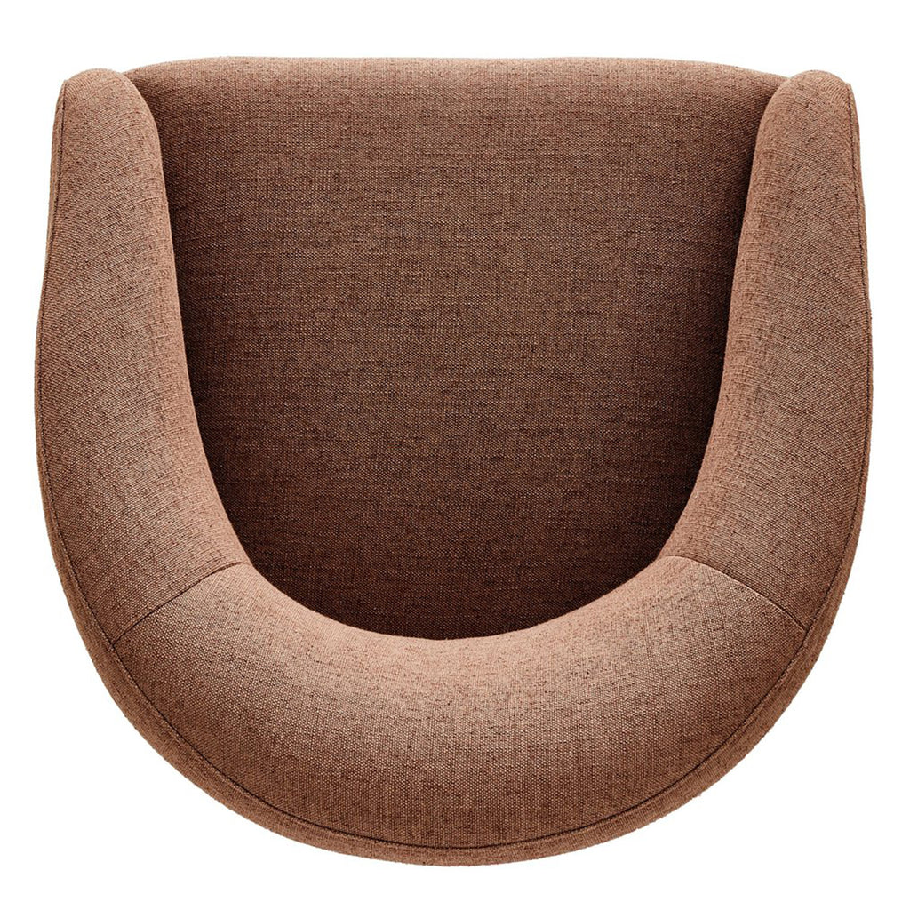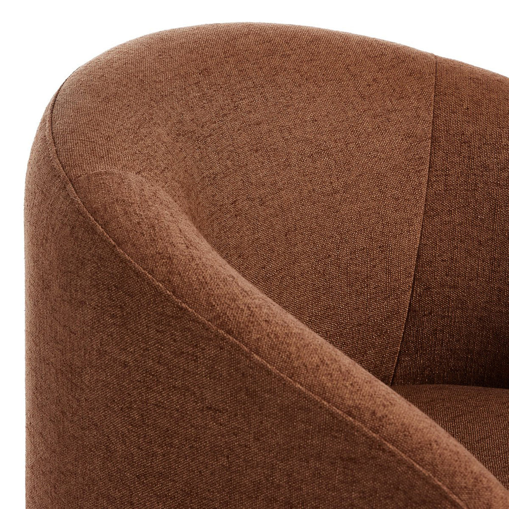 Fully upholstered in a unique rust hue, a barrel-style back creates a comfortable, cocoon-like sit. Slight scale perfect for smaller dining spaces.