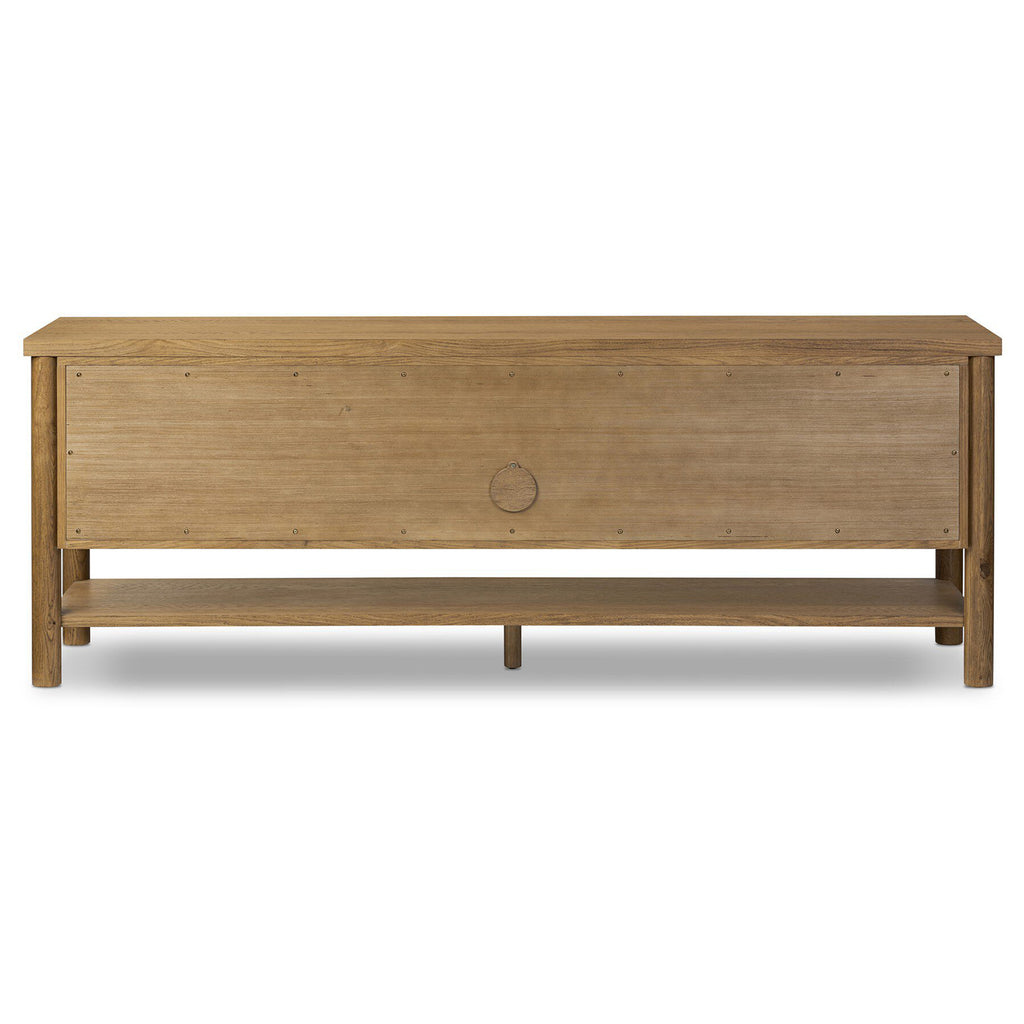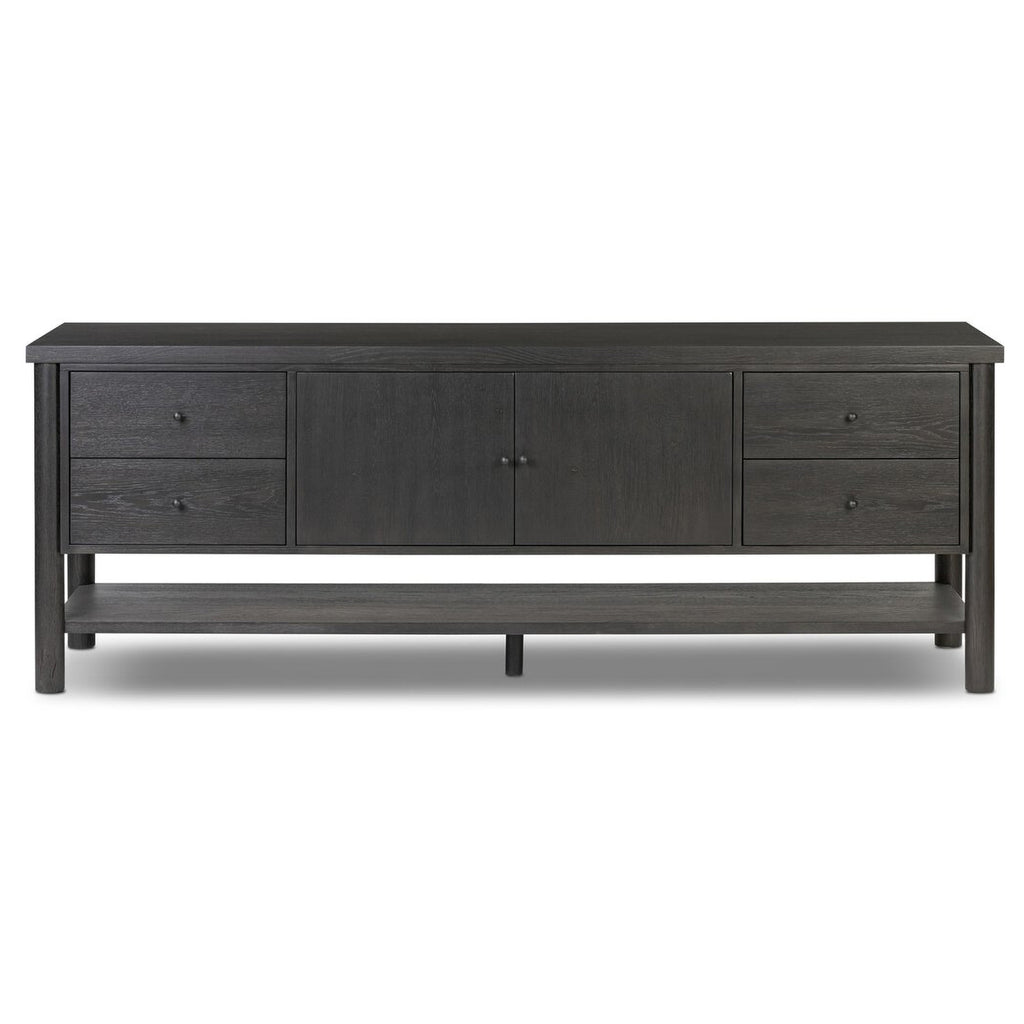 Crafted from oak with a warm amber or ebony oak finish and rounded dowel legs. An overhang top and simple gunmetal-finished hardware complete the look, with drawers and a spacious lower shelf for all your media storage needs.