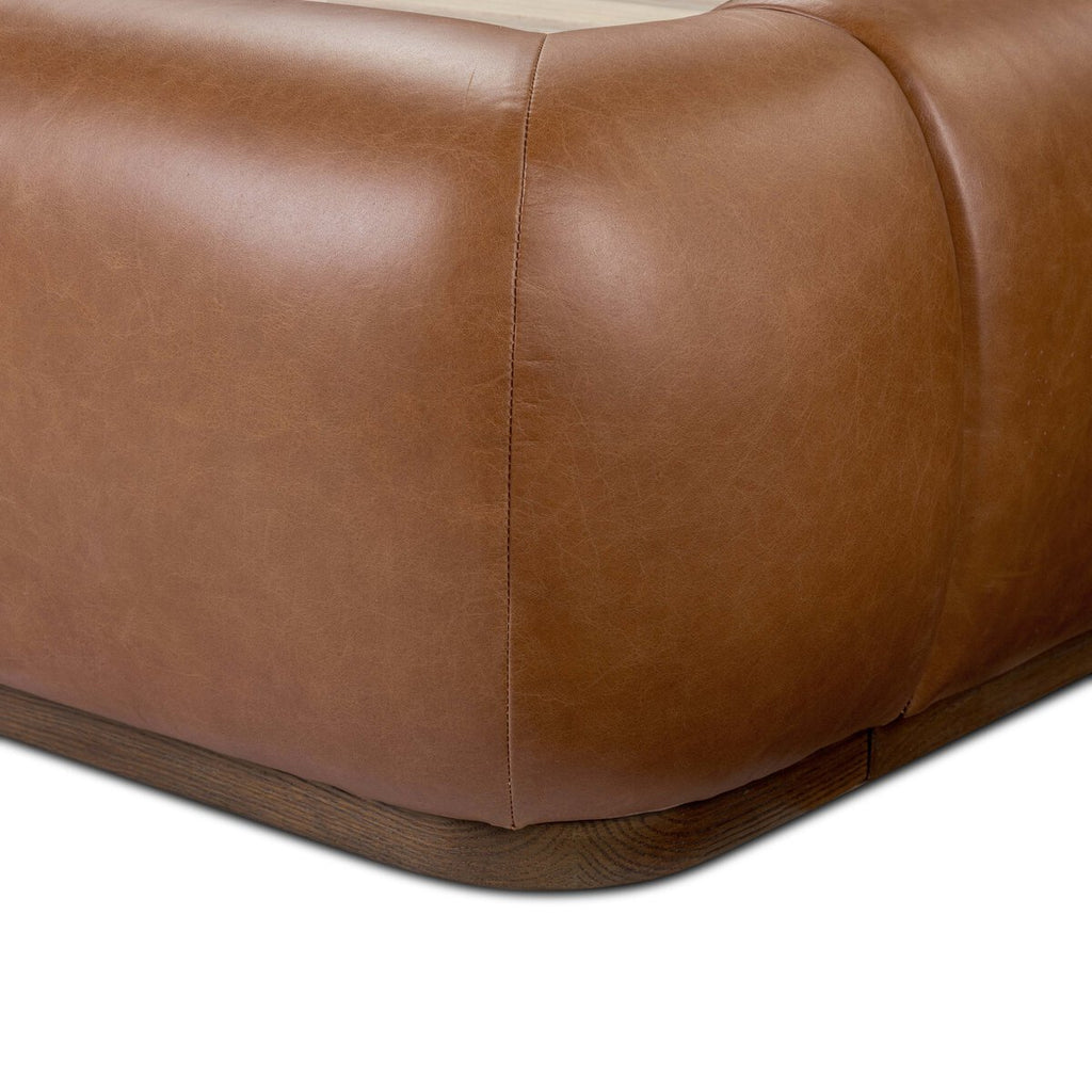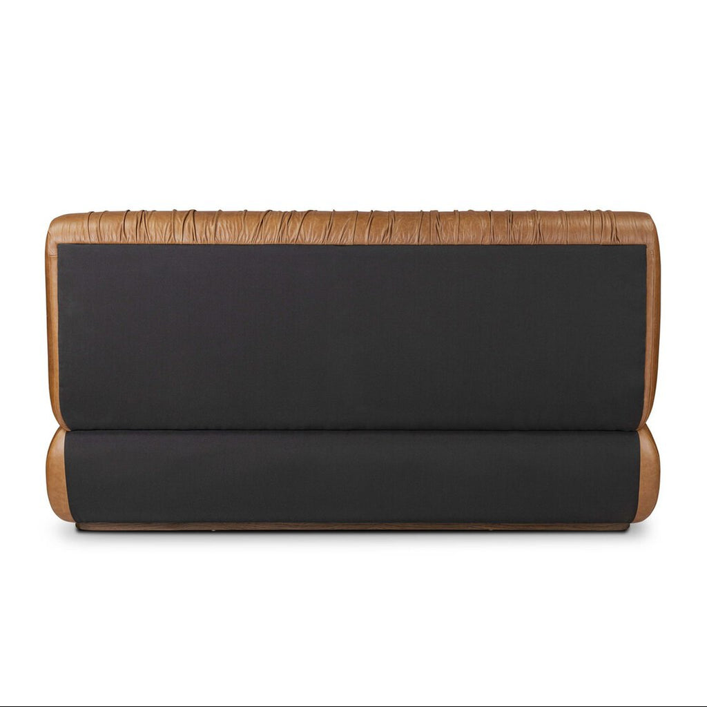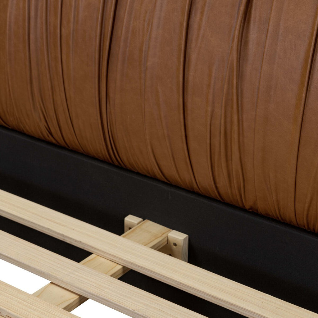 Bring vintage vibes to the bedroom. A sleek, low silhouette is covered in chestnut top-grain leather exclusive to Four Hands. A meticulously ruched headboard reflects the Seventies inspiration behind this versatile piece.