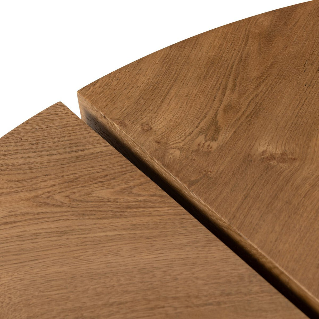 A coffee table that moves with you. Made from oak burl veneer with beautiful movement, this three-piece design pulls apart to create different looks and configurations based on your needs. Pushed together, individual pieces shape a circle; create a wave shape touching just the end pieces together — or, style all three apart.