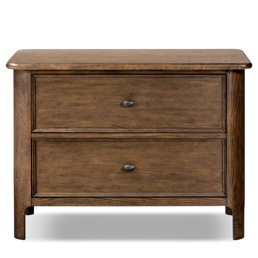 Like an heirloom nightstand with two roomy drawers, this aged oak design has room for it all. Detailed with an overhang surface, carved edges top to bottom, angled legs and oval drawer pulls finished in dark gunmetal.