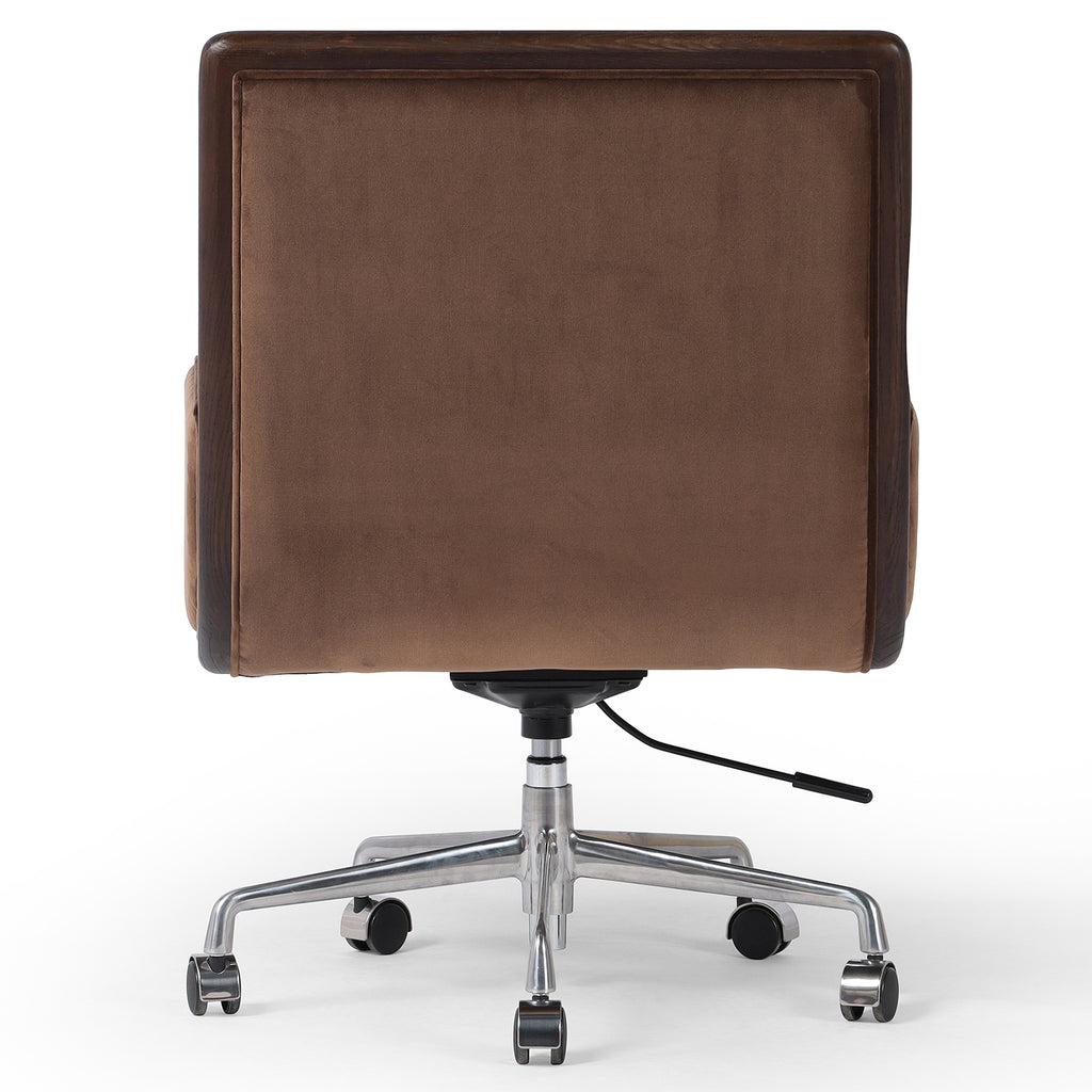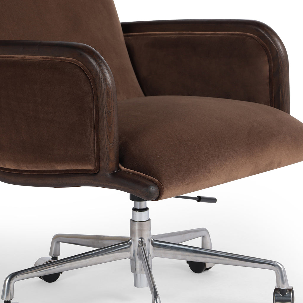 This comfort-driven take on the modern desk chair features velvety cocoa-colored upholstery, pared with a wooden frame. Casters and seat height adjustability for ease as you work.