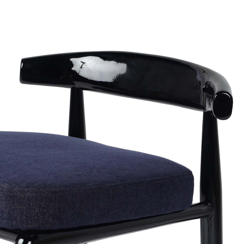 Echoing lacquered seating from another era, this glossy dining chair features mahogany construction, a timeless back, and royal blue upholstery.