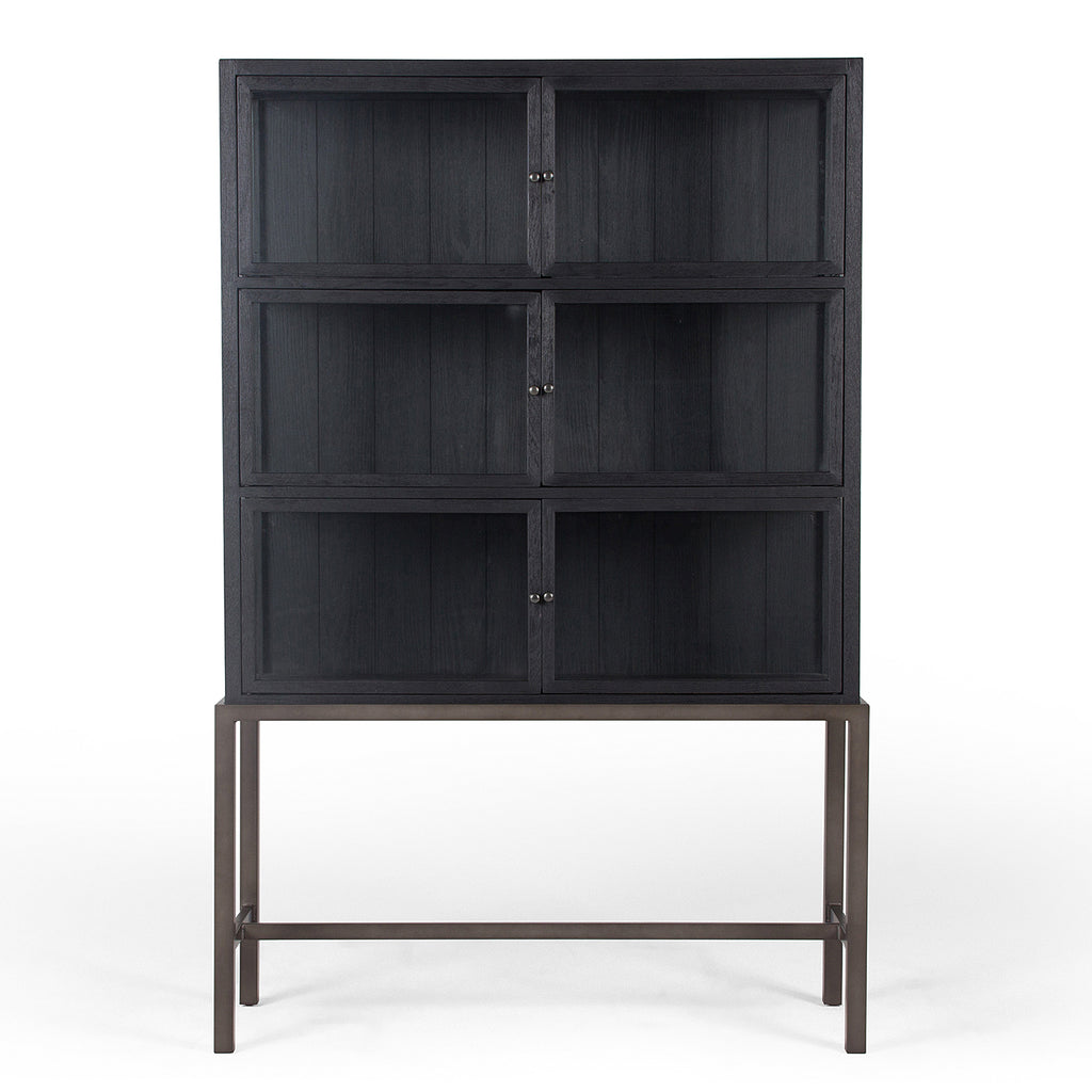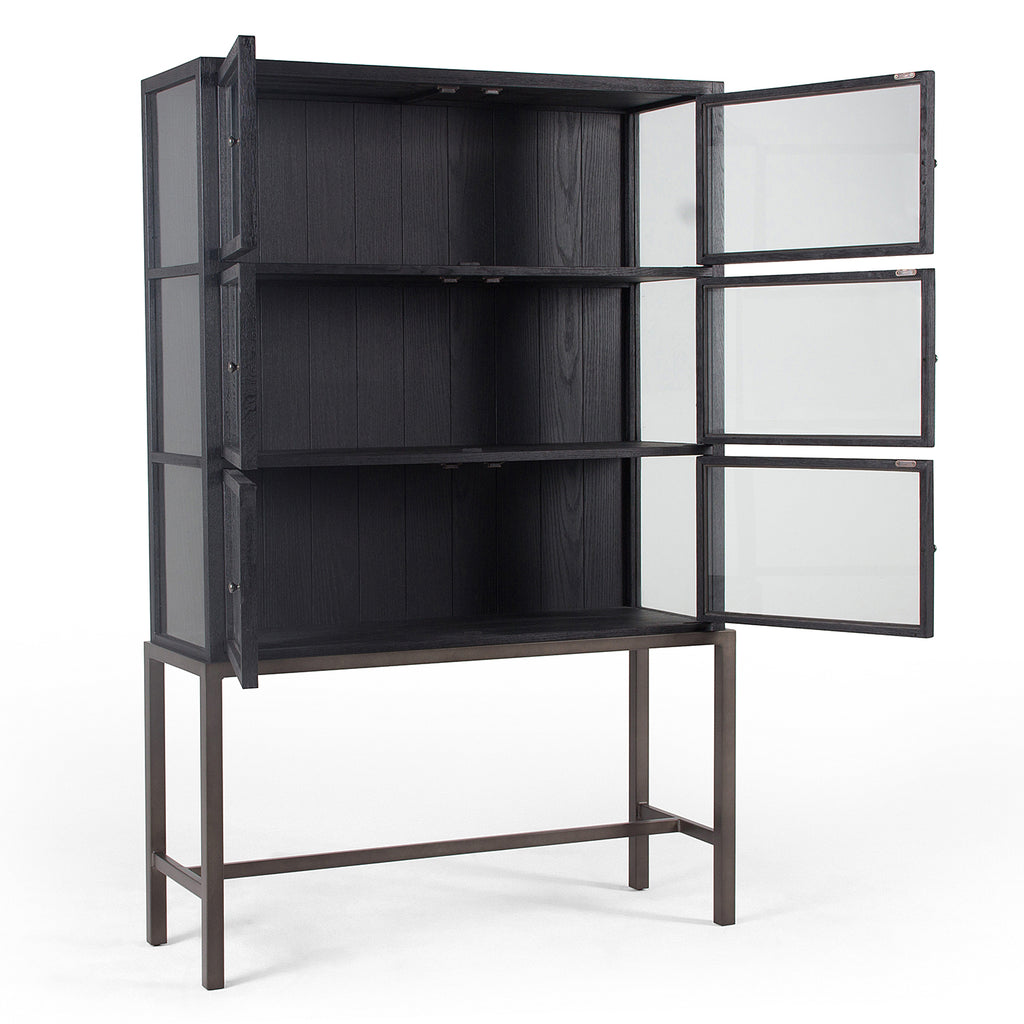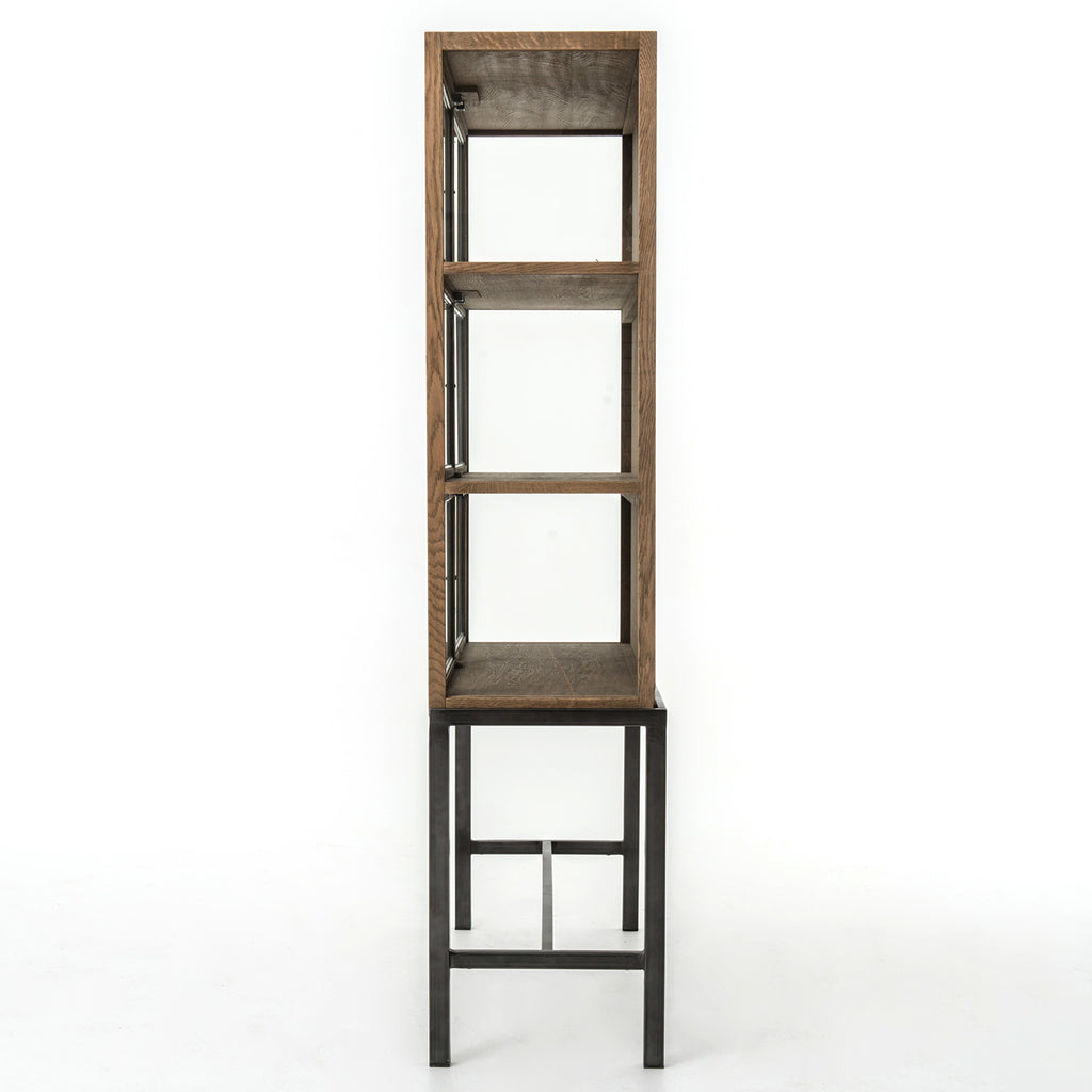 See and be seen. Rustic black or drifted oak finished oak forms an airy curio cabinet designed to showcase lifes artifacts. Perched on a simple waxed black iron pedestal.