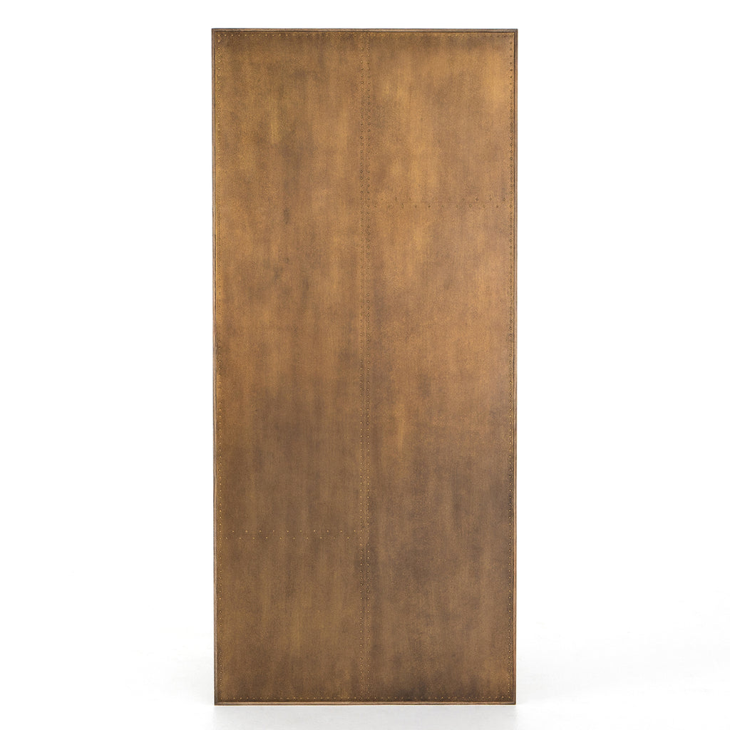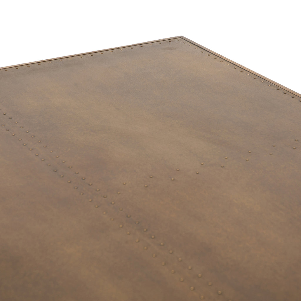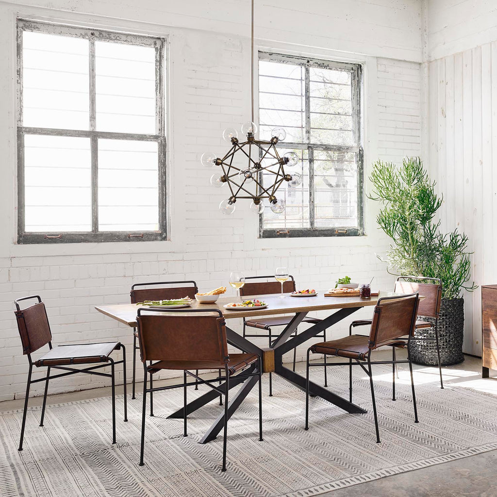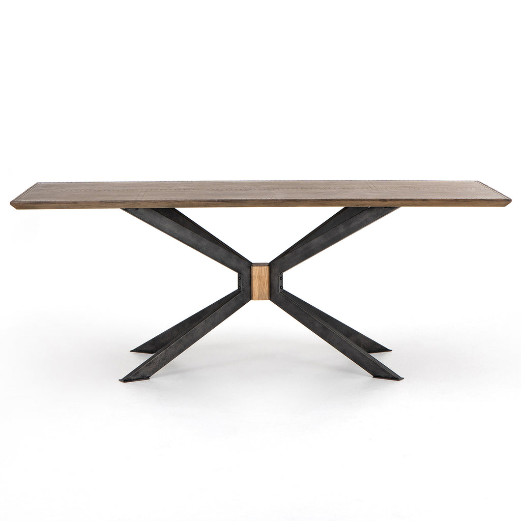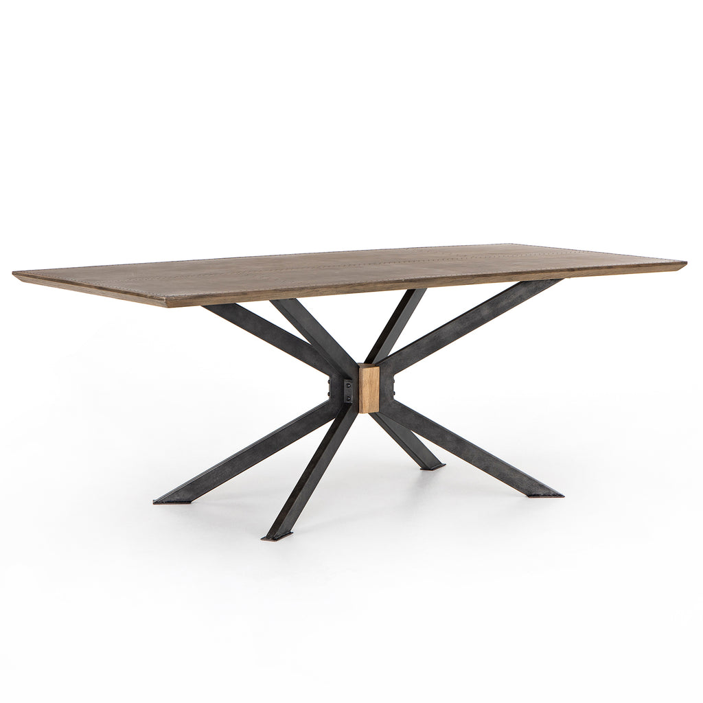 Resolutely modern, Four Hands furniture collection mixes materials and influences for a fresh, inspired look. Atomic iron lines support a brass-clad tabletop framed in sandy oak. Woodblock details accentuate a dramatically-angled industrial base.