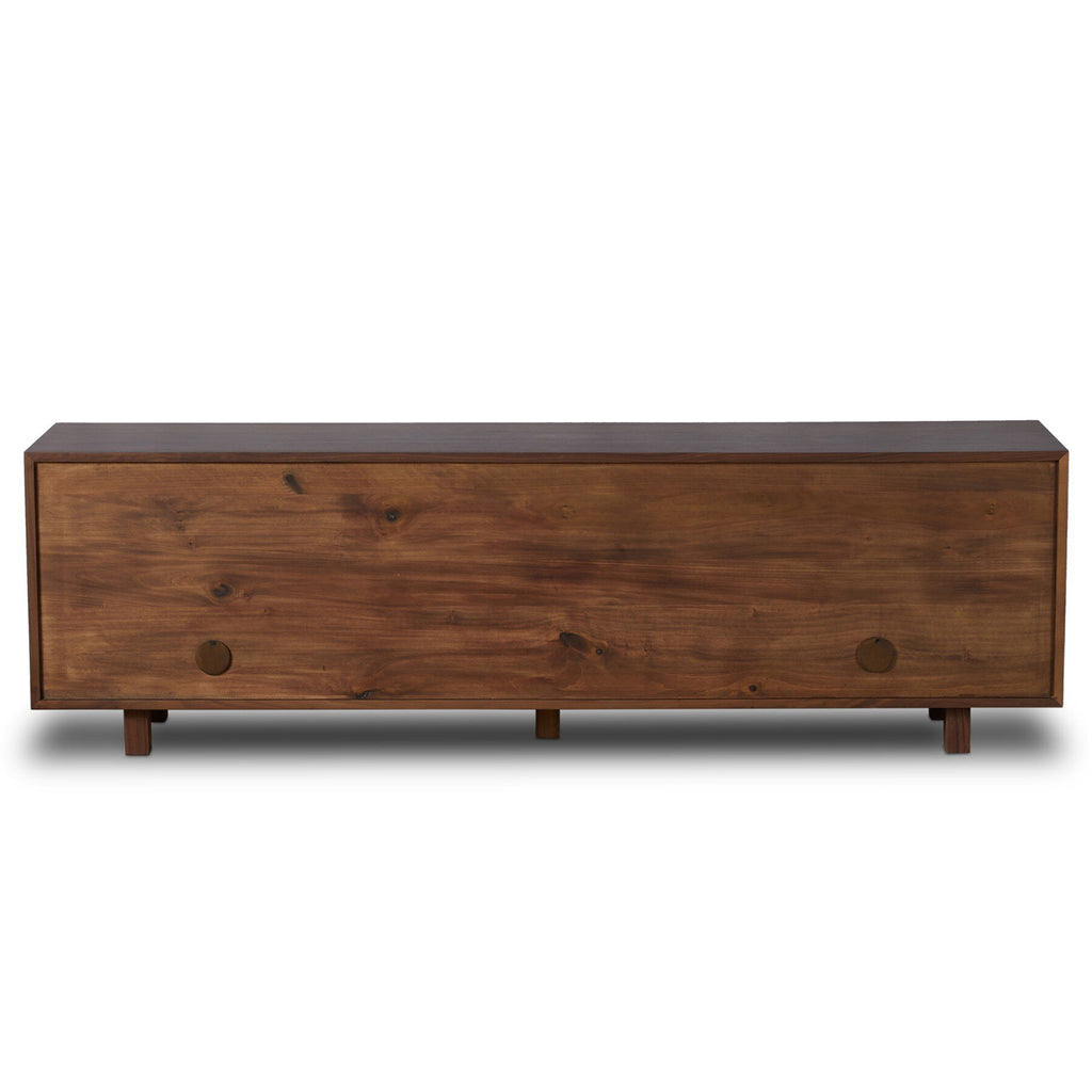 Clean lines with integrated hardware offer a cohesive, all-natural look. The media console has reversed and chamfered panels that substitute for hardware. Finished in warm walnut with square-shaped inset legs, the console sits long and low true to its midcentury heritage.