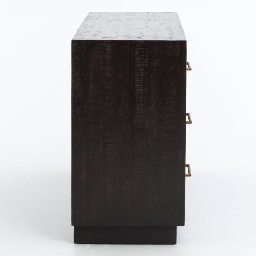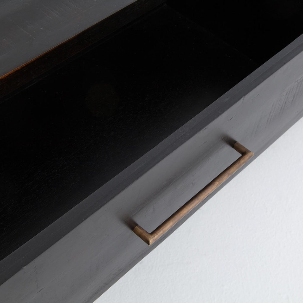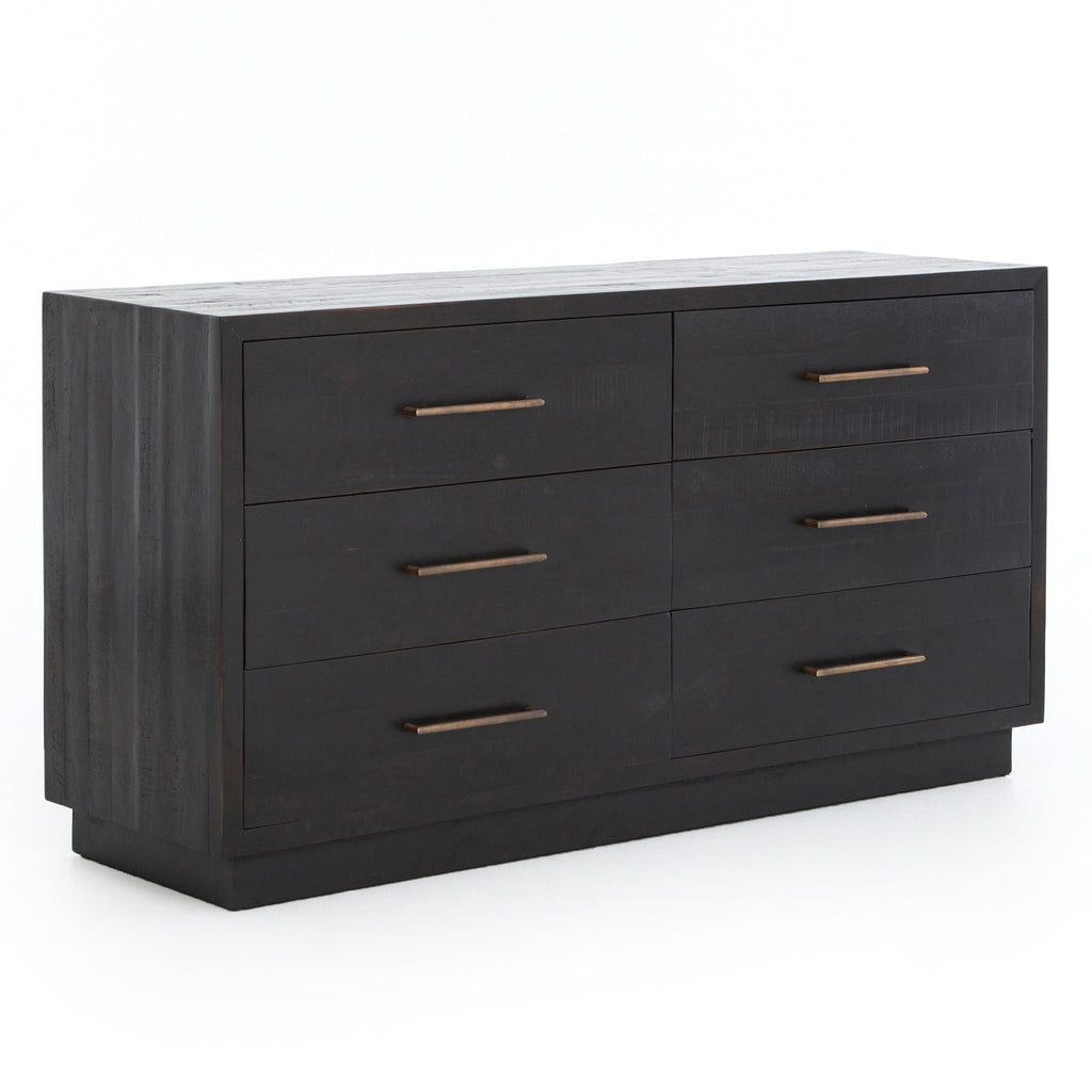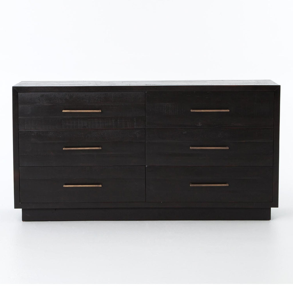 Resolutely modern, Four Hands furniture collection mixes materials and influences for a fresh, inspired look. Simple sophistication with a modern edge. Solid acacia forms clean lines to lighten the natural depth of a burnished black finish. Brass-finished hardware adds a sleek touch to six spacious drawers.