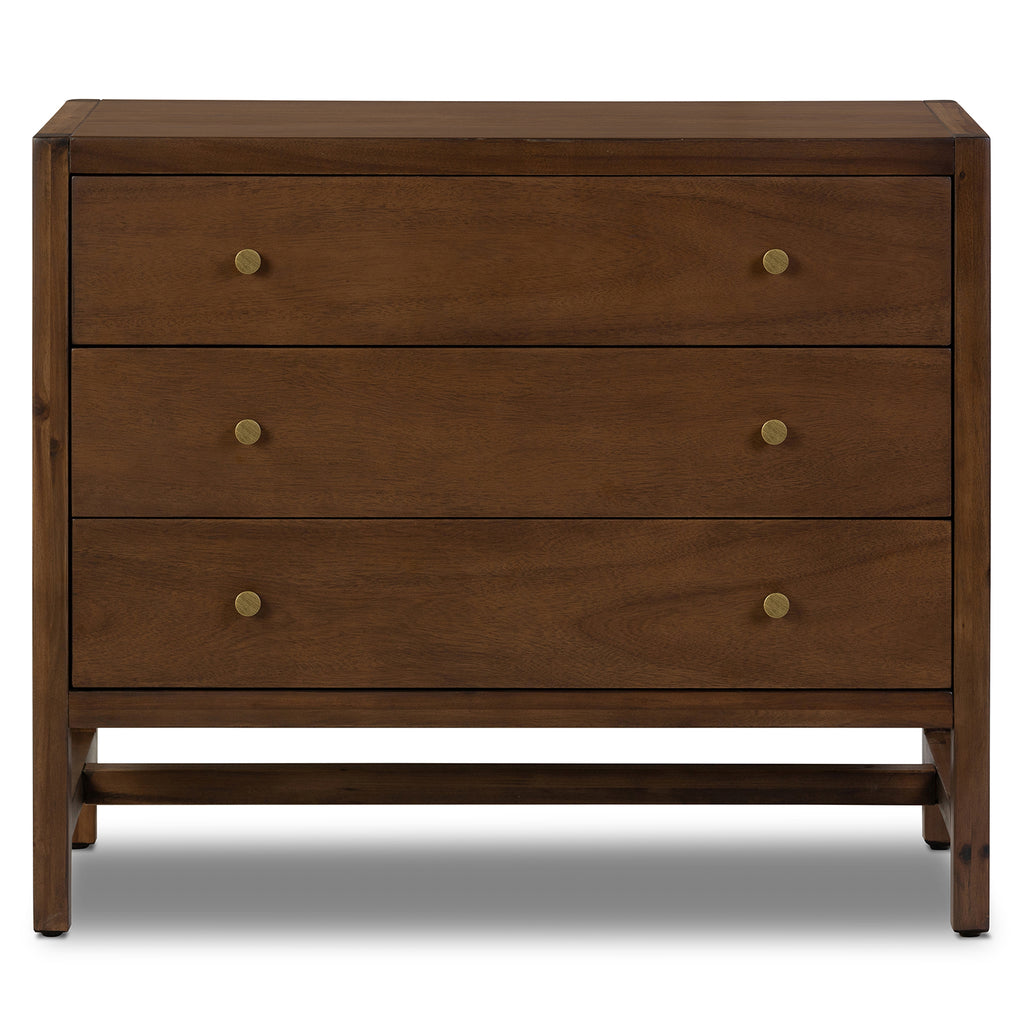 A simple, heavy wood Parsons-style nightstand with three drawers for ample storage. Finished in solid ash with brass hardware.