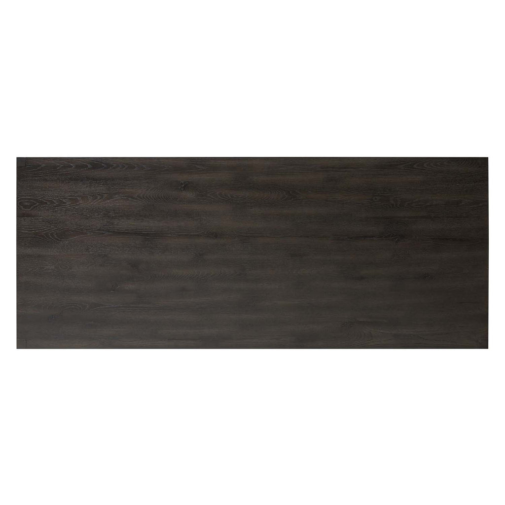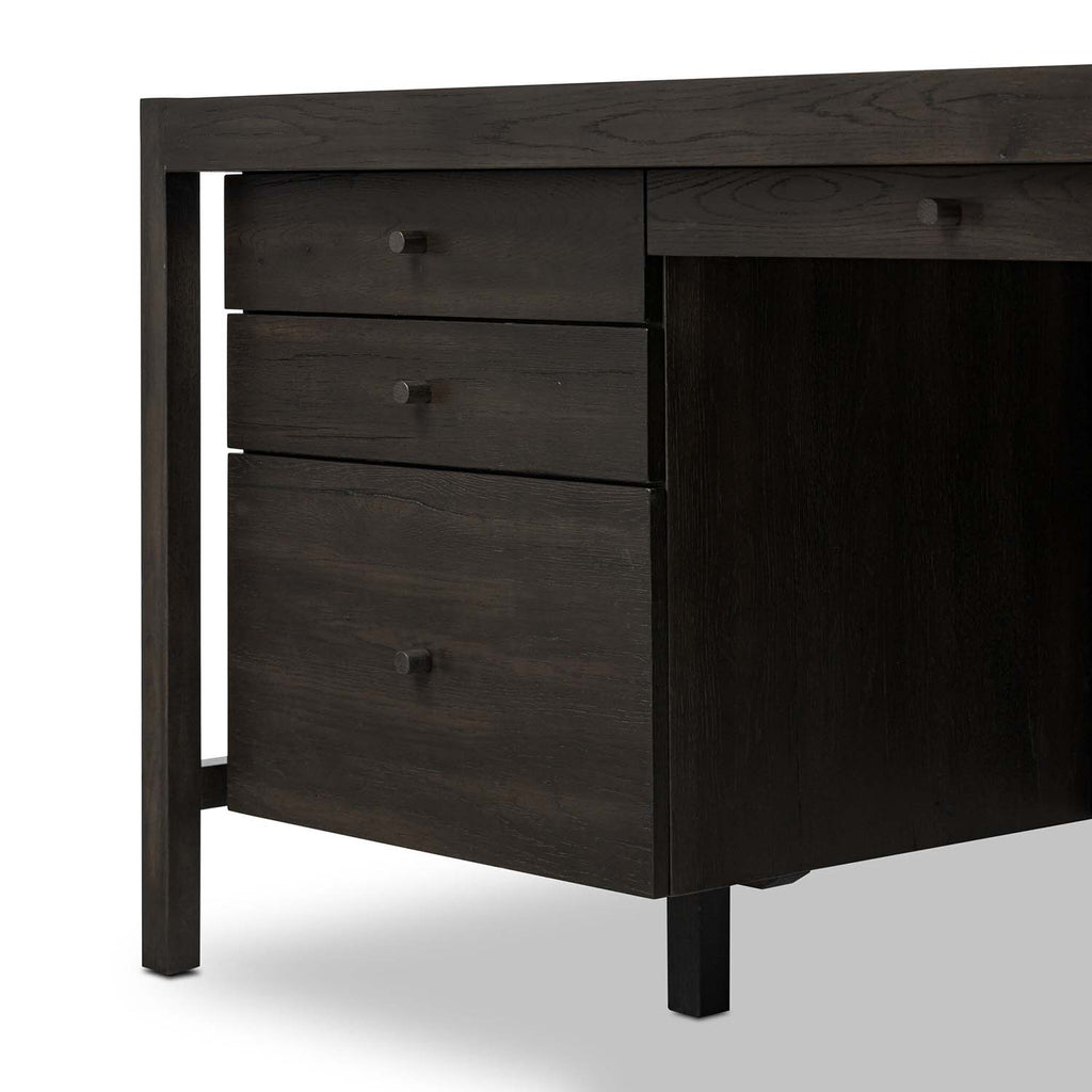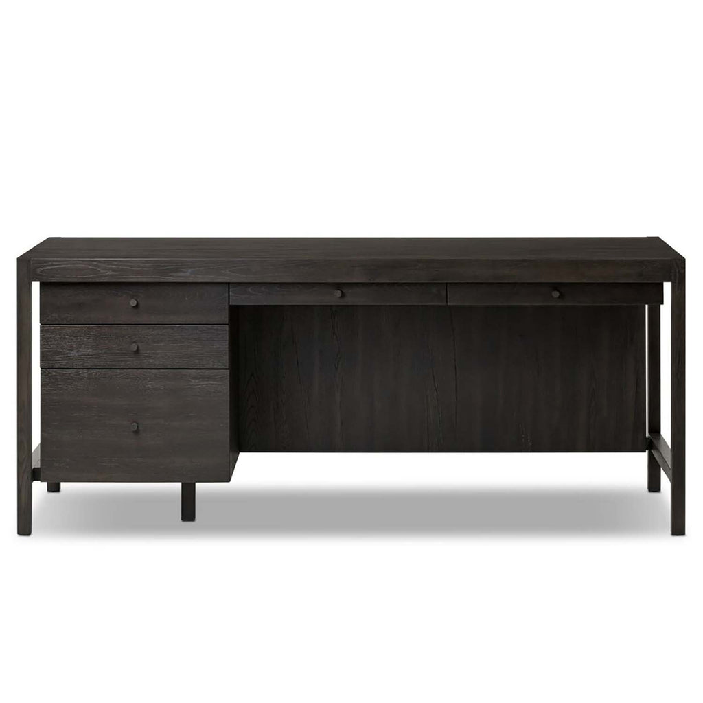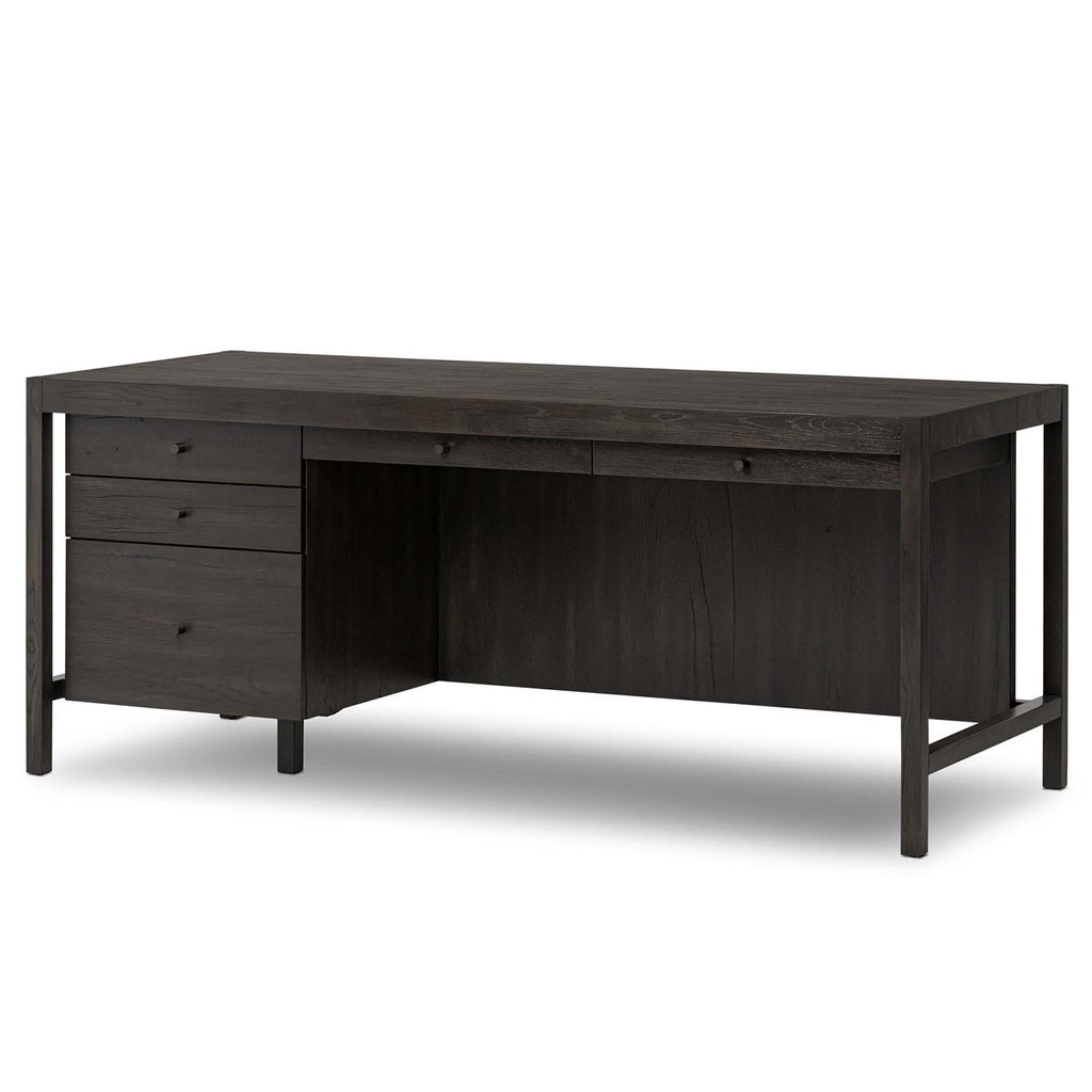 Made from oak veneer with a rustic gray finish, an executive-size desk features a fully finished back, offering the option to float-style in a room. Plenty of varied-size drawers offer generous storage space.