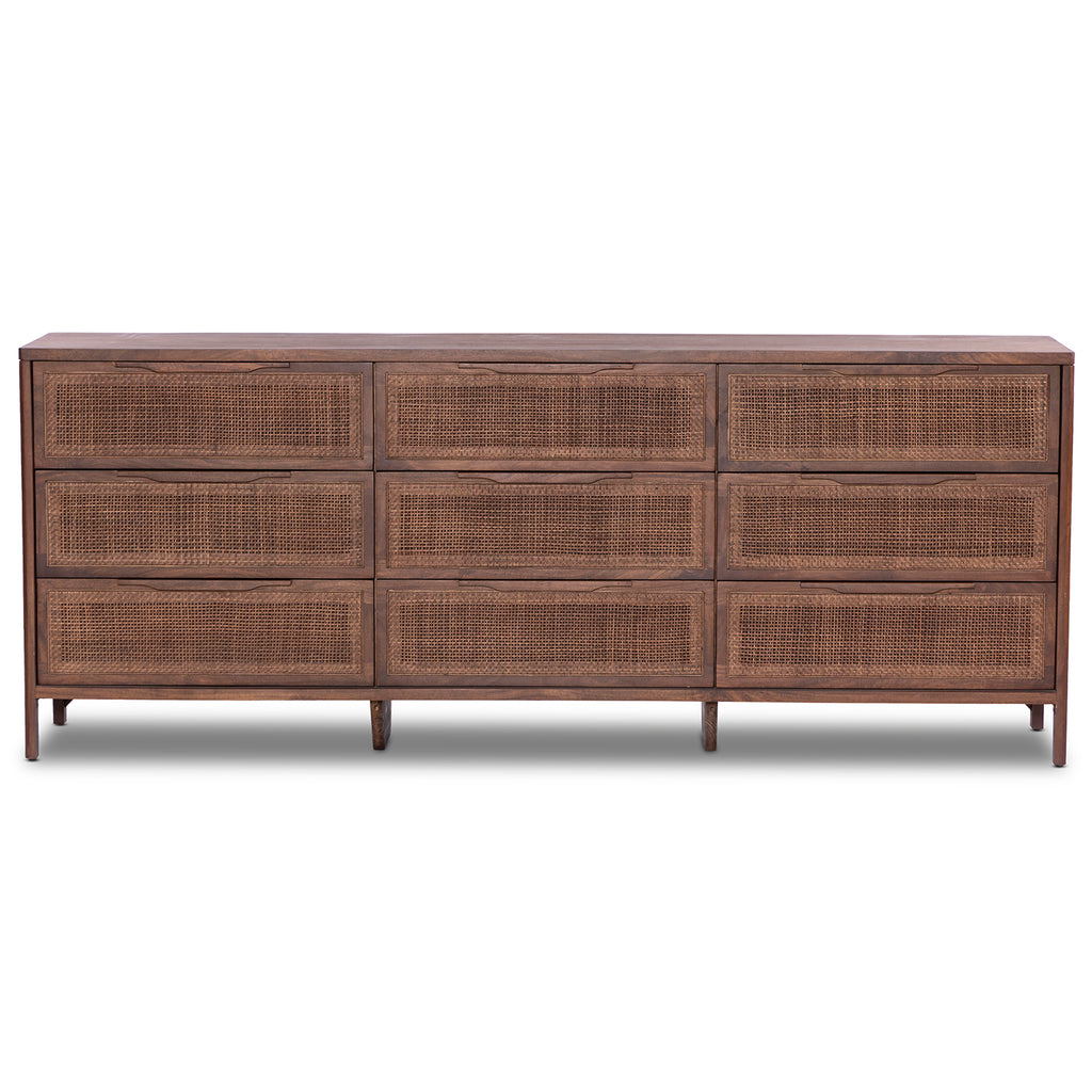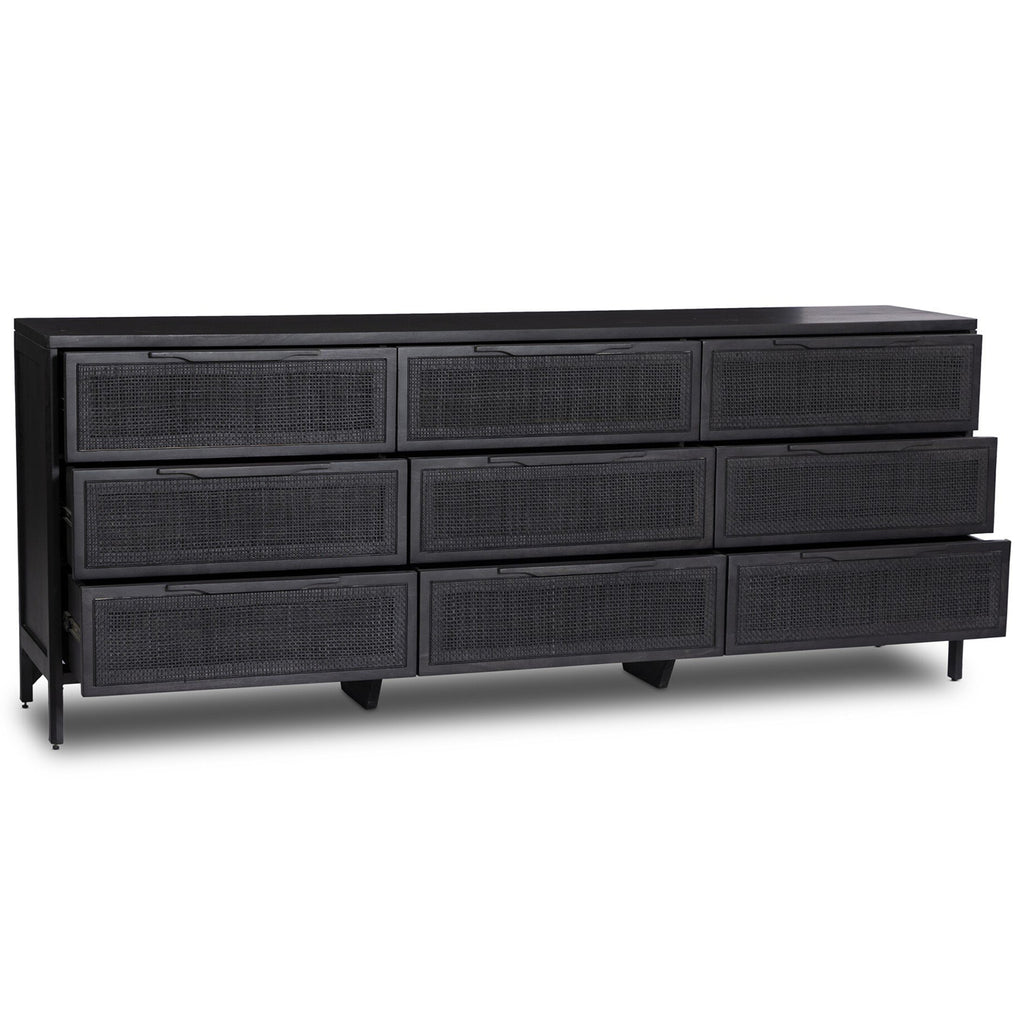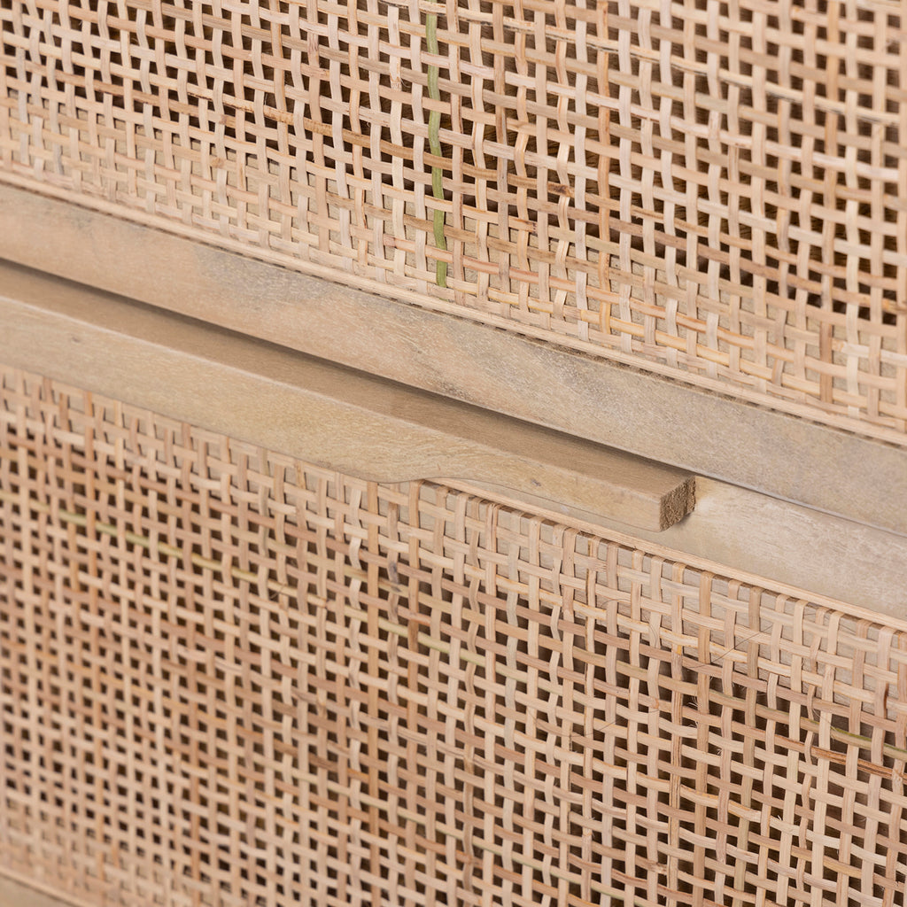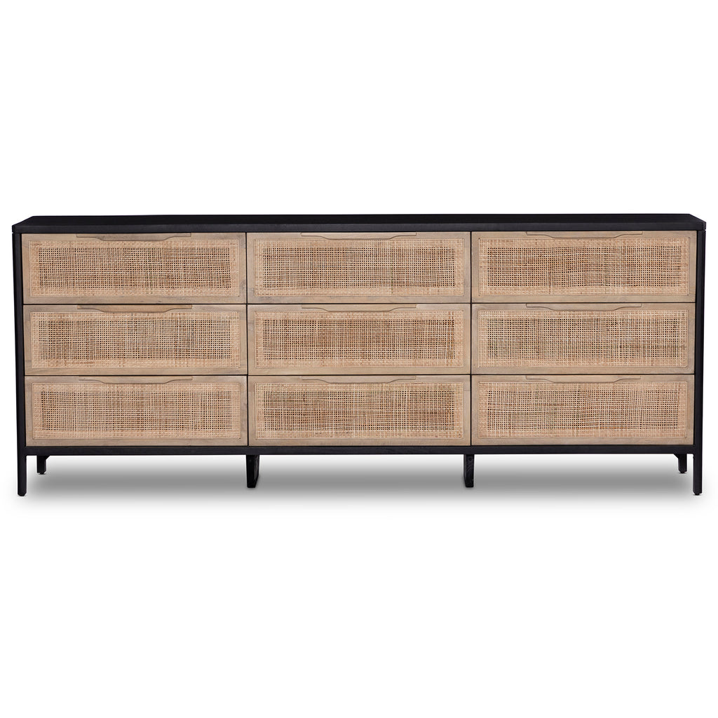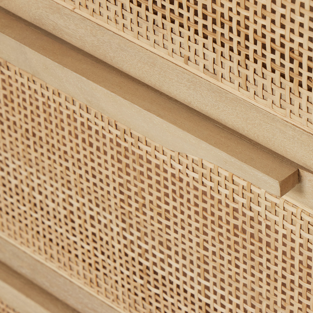 Natural mango encases nine spacious drawers of woven cane, for a textural look with eye-catching contrast.