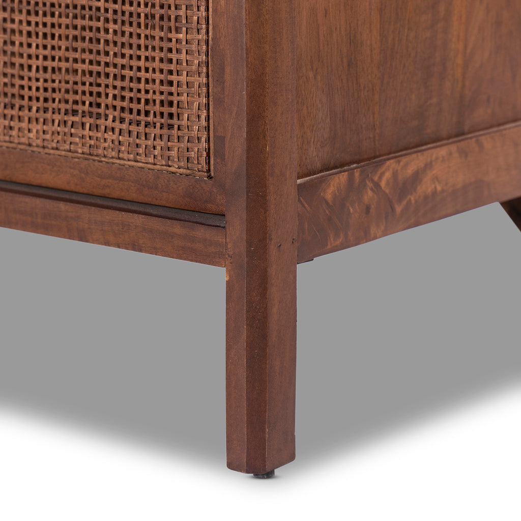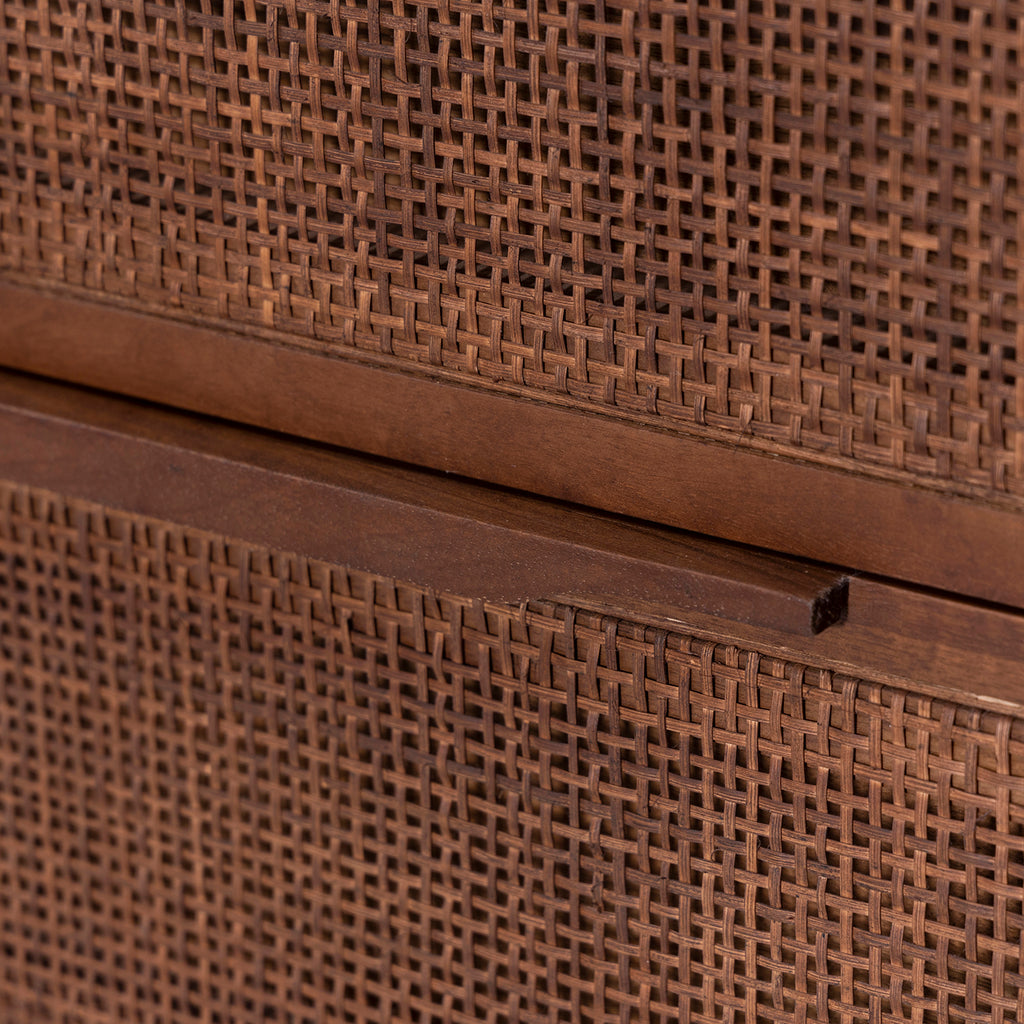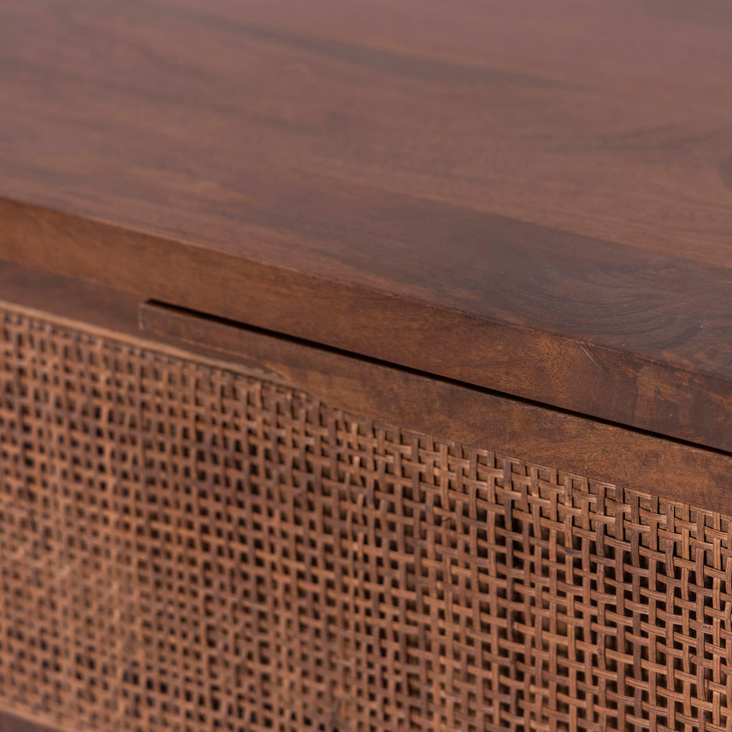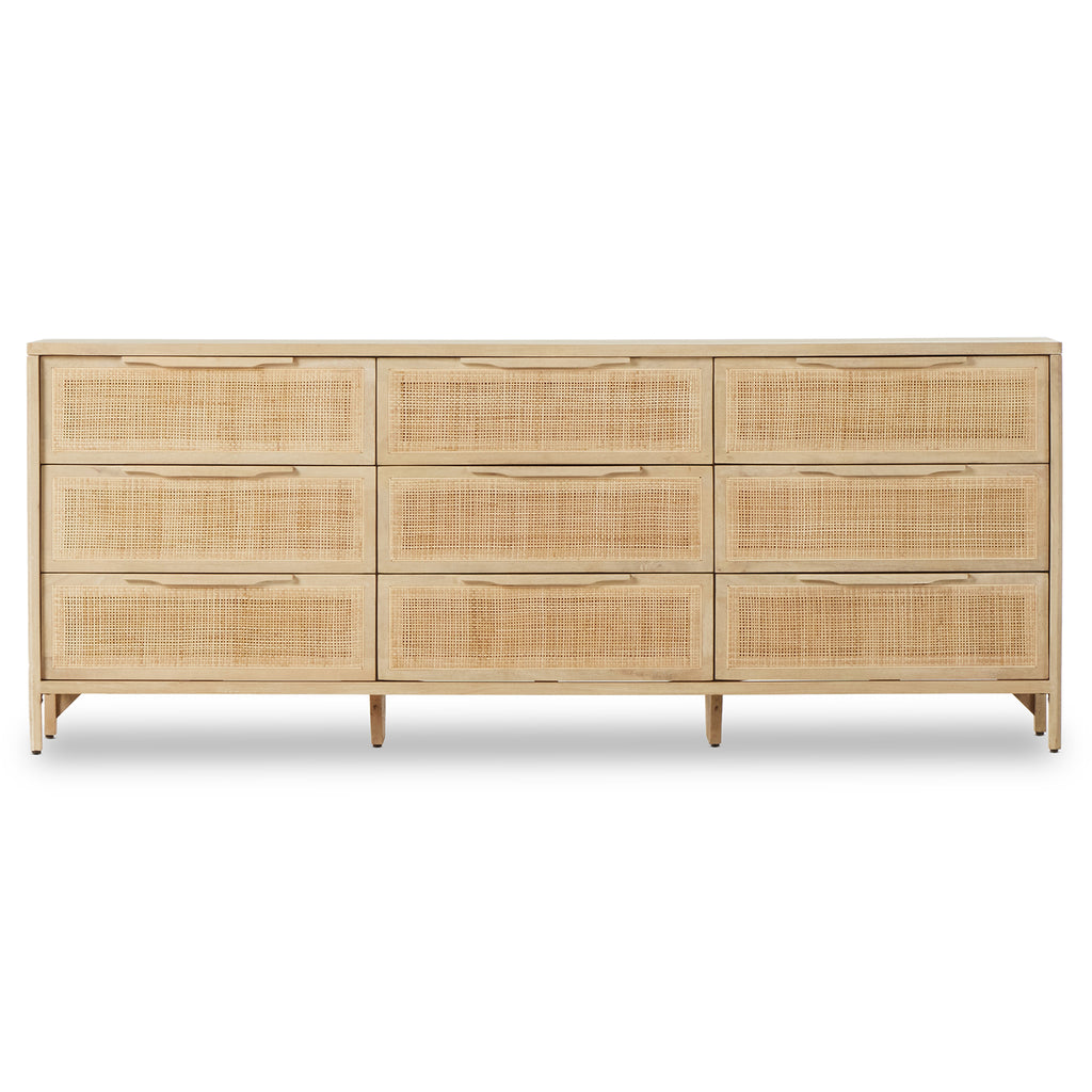 Natural mango encases nine spacious drawers of woven cane, for a textural look with eye-catching contrast.