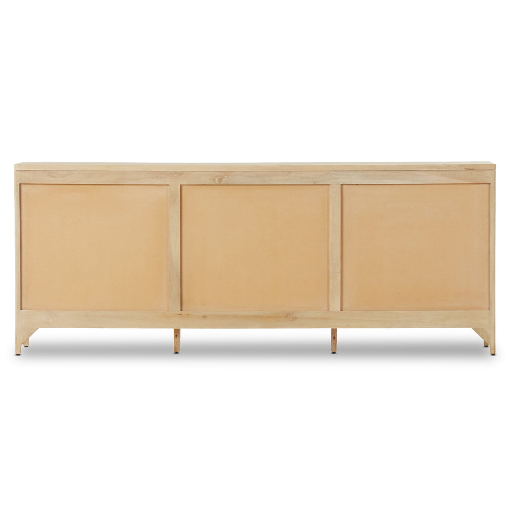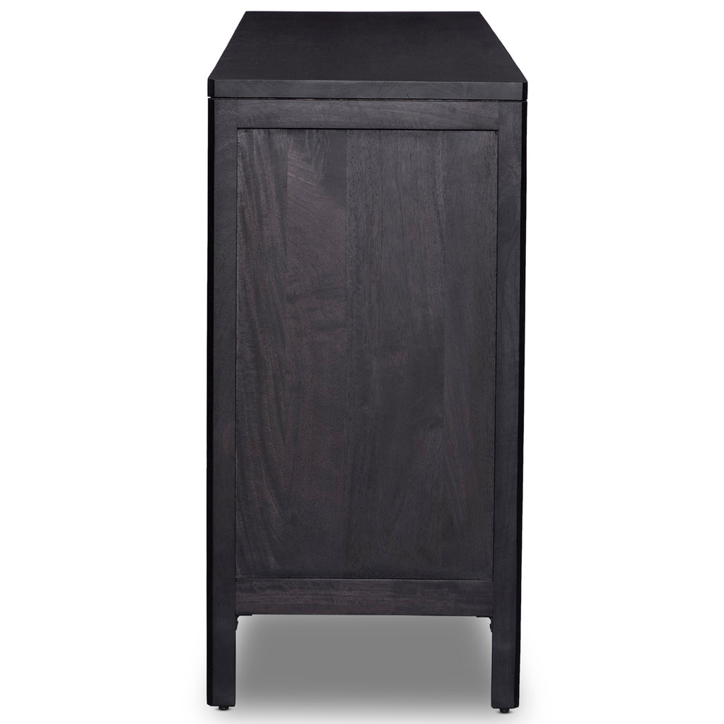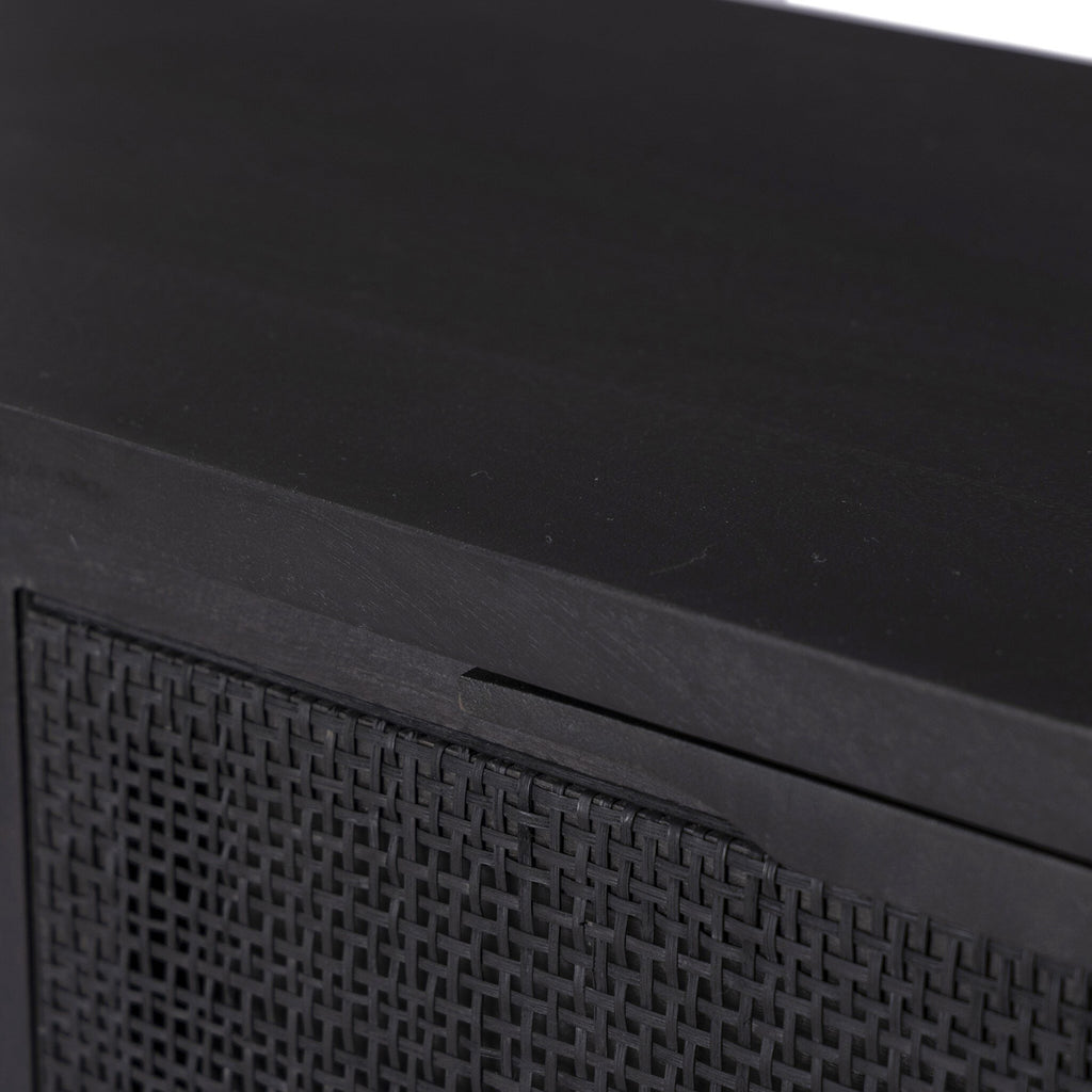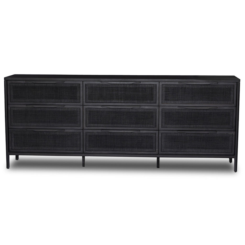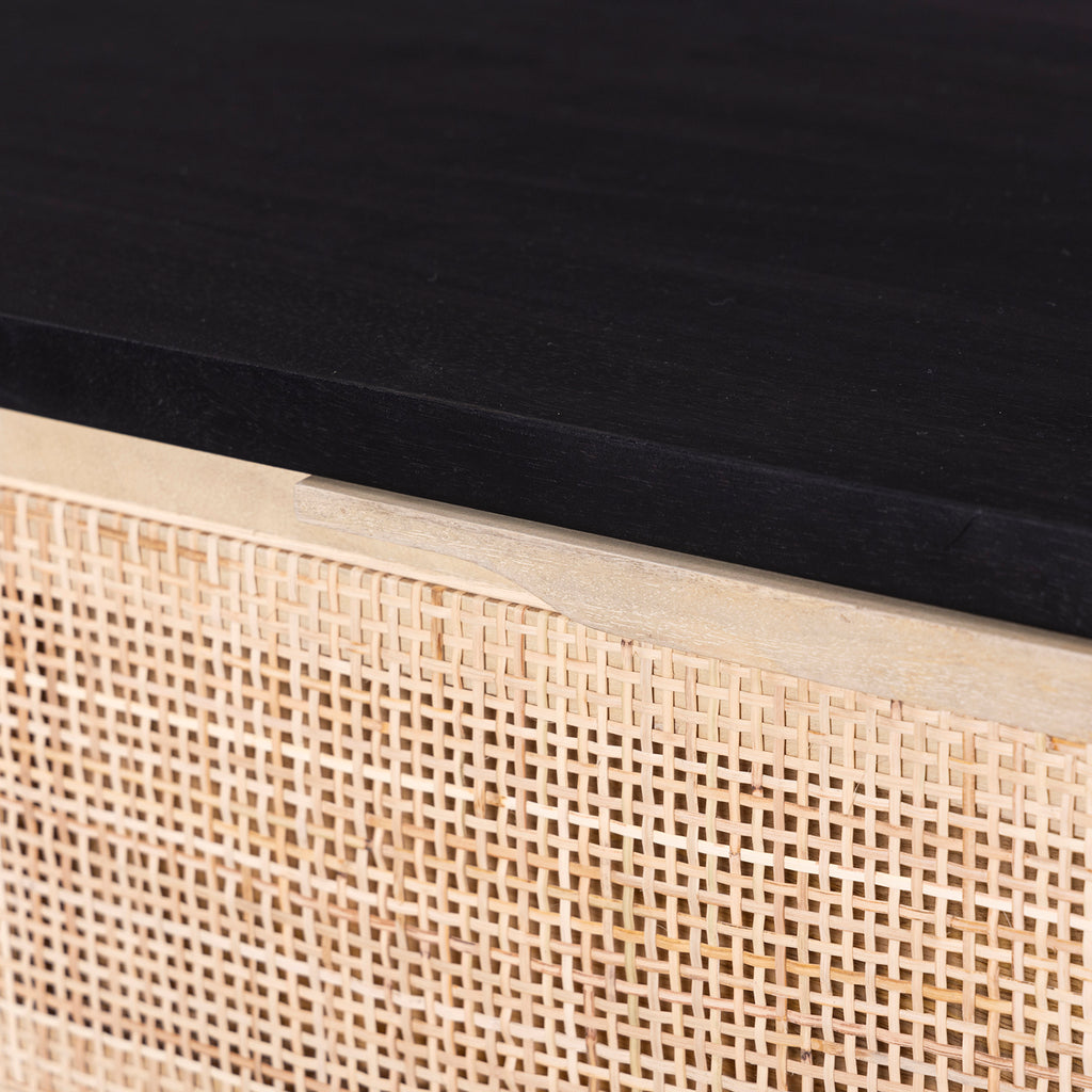 Natural mango encases nine spacious drawers of woven cane, for a textural look with eye-catching contrast.