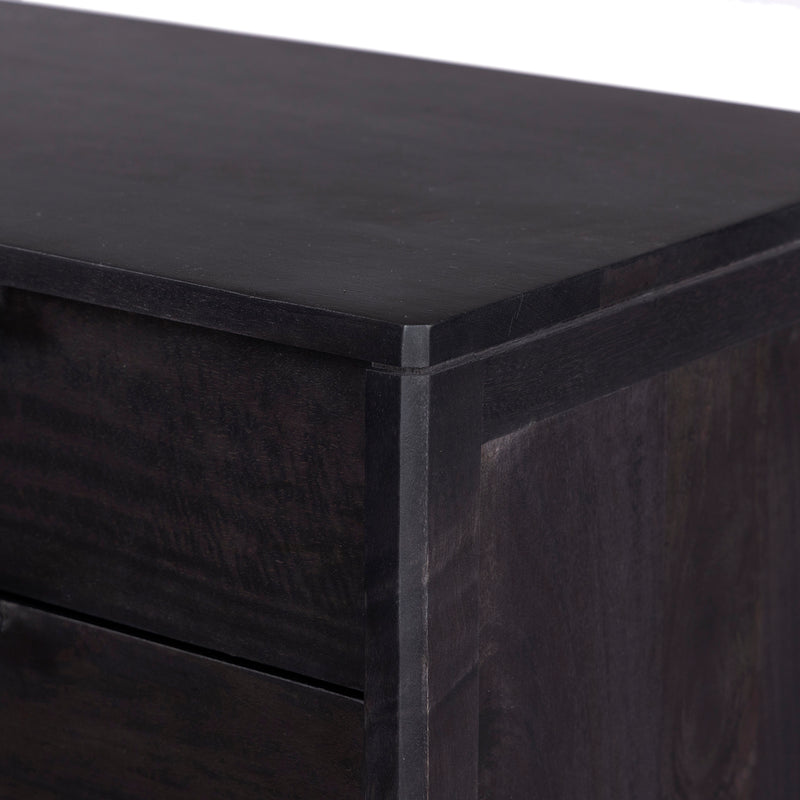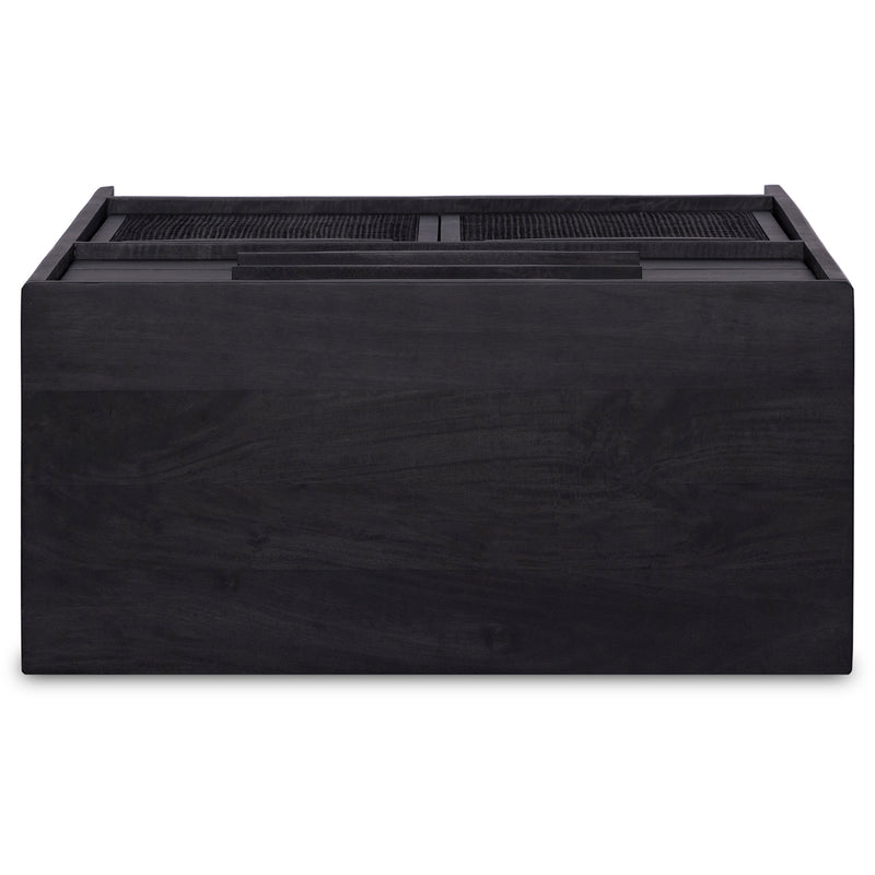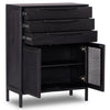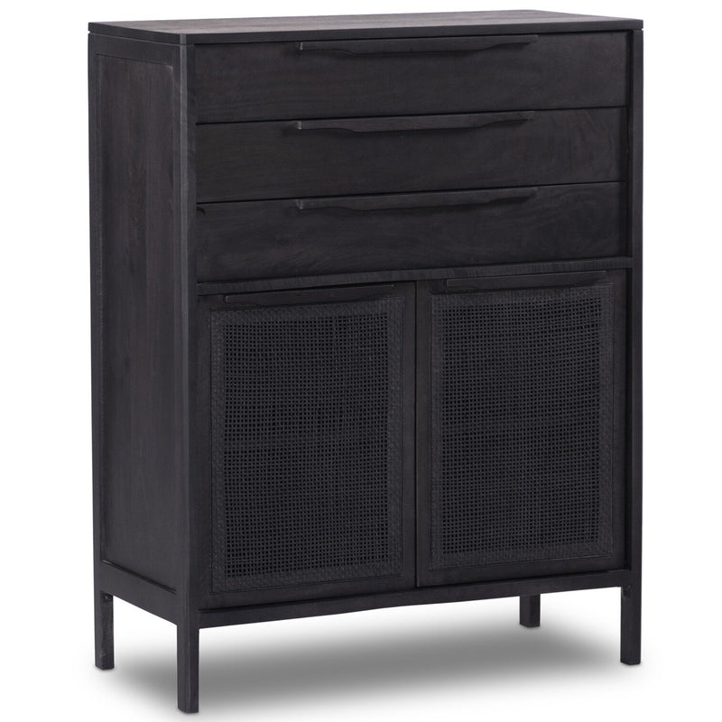 Natural or Black Washed mango framing features front cabinetry of woven cane, for a textural look with eye-catching contrast. A top trio of drawers and lower cabinetry bring plenty of storage space to the bedroom.