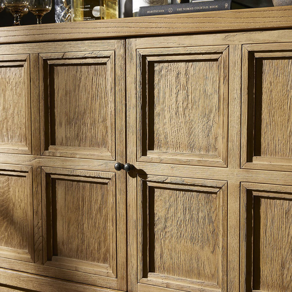 Small-scale cabinetry of worn oak features paneled doors, lending texture to a clean-lined design.