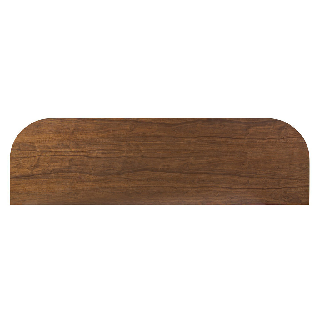 Dark brown walnut is aesthetically shaped with fluid, rounded corners on a ski leg base. The seamless design features six spacious drawers with metal bar hardware that runs along the tops of the drawers.