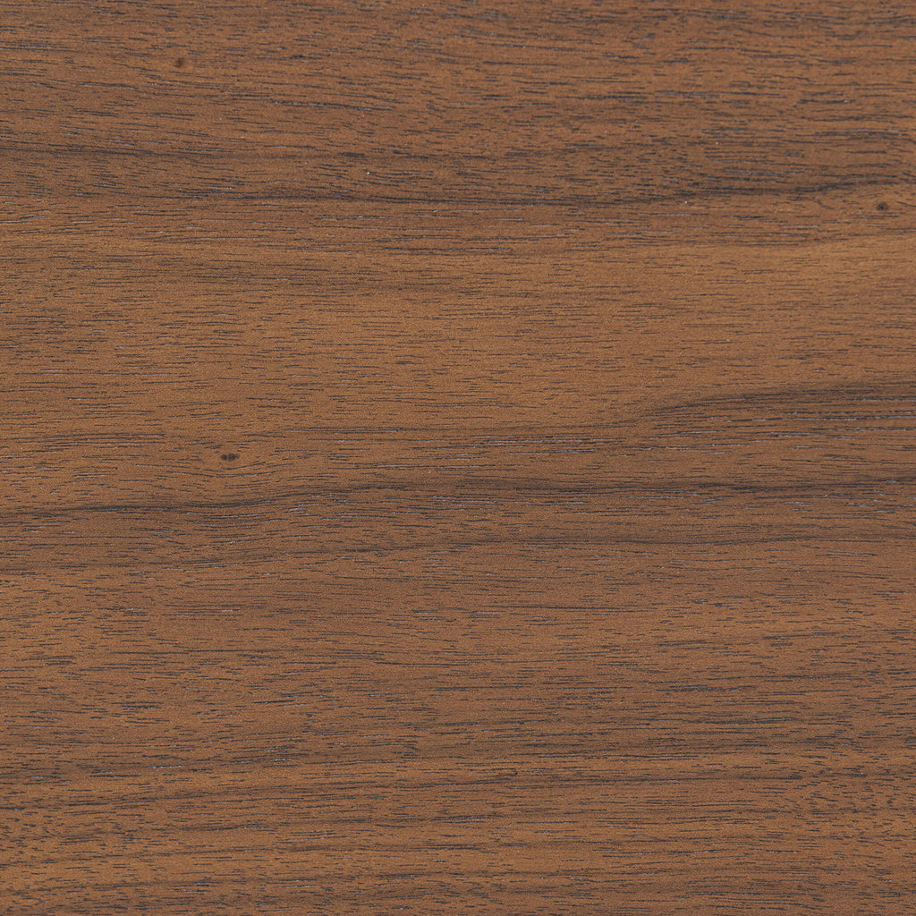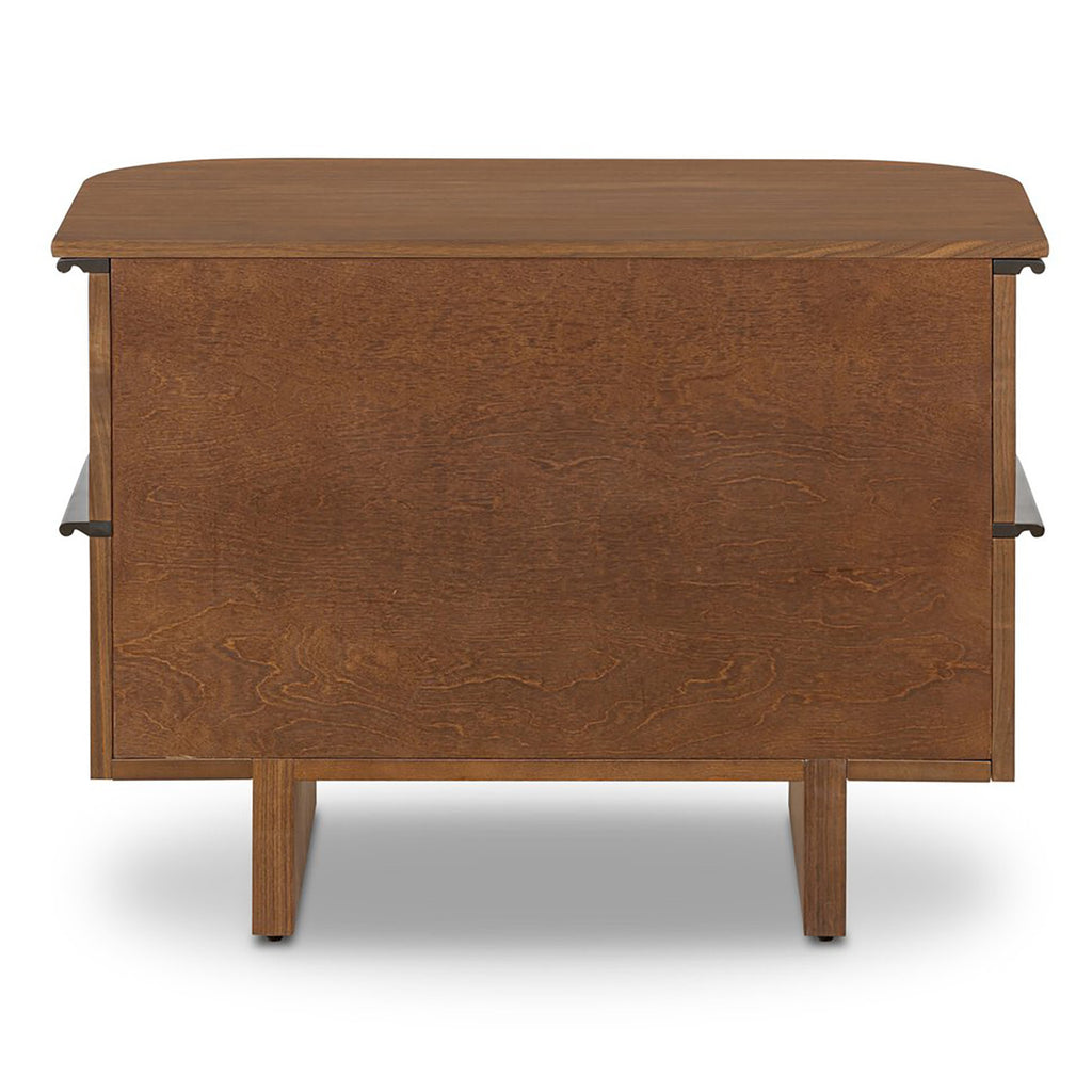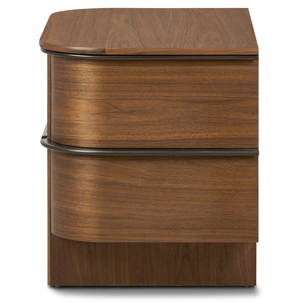 Dark brown walnut is aesthetically shaped with fluid, rounded corners on a ski leg base. The seamless design features two spacious drawers with metal bar hardware that runs along the tops of each drawer.