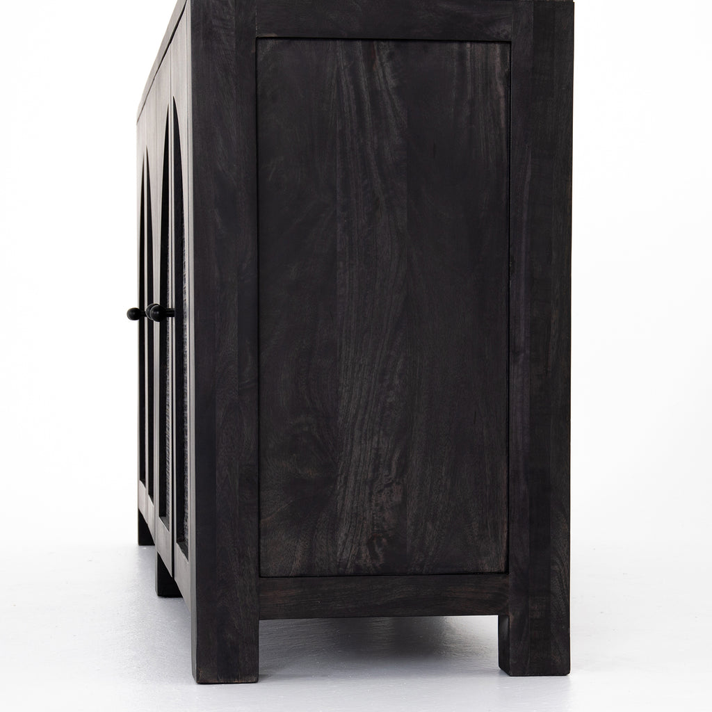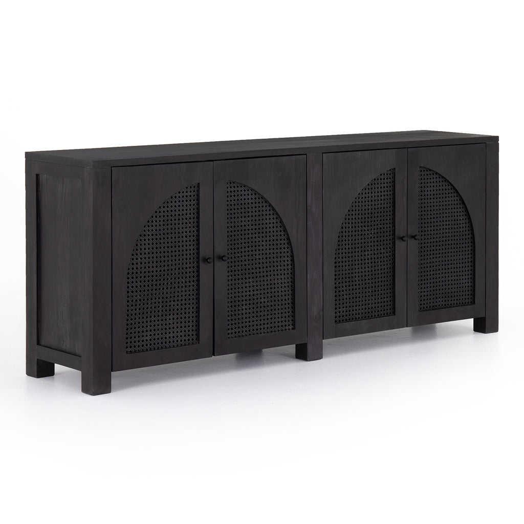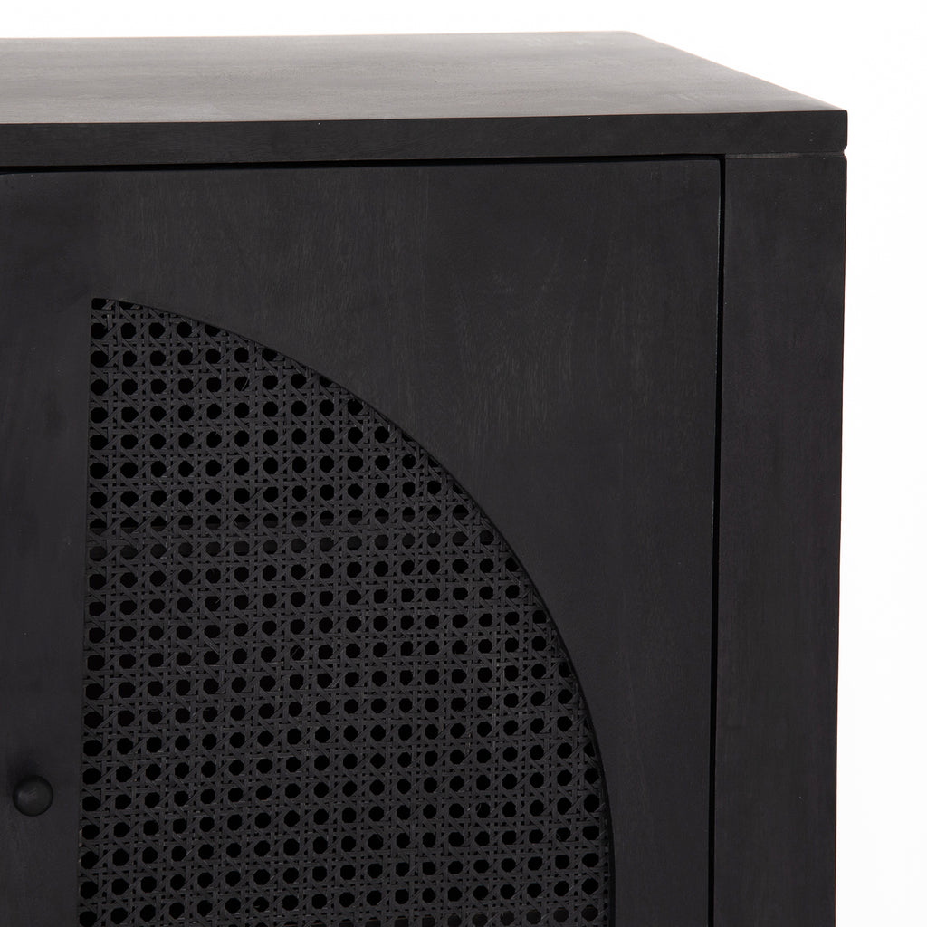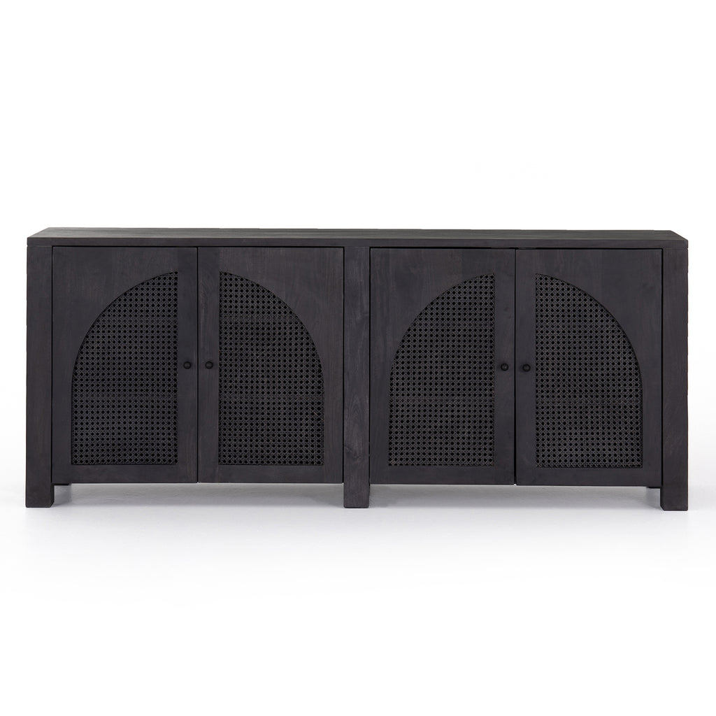 Grand in scale and presence. Black-washed mango encases arched cane door panels featuring black-finished iron hardware, meeting a forward-thinking material mix with monochromatic vibes.