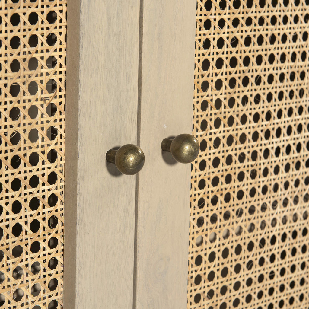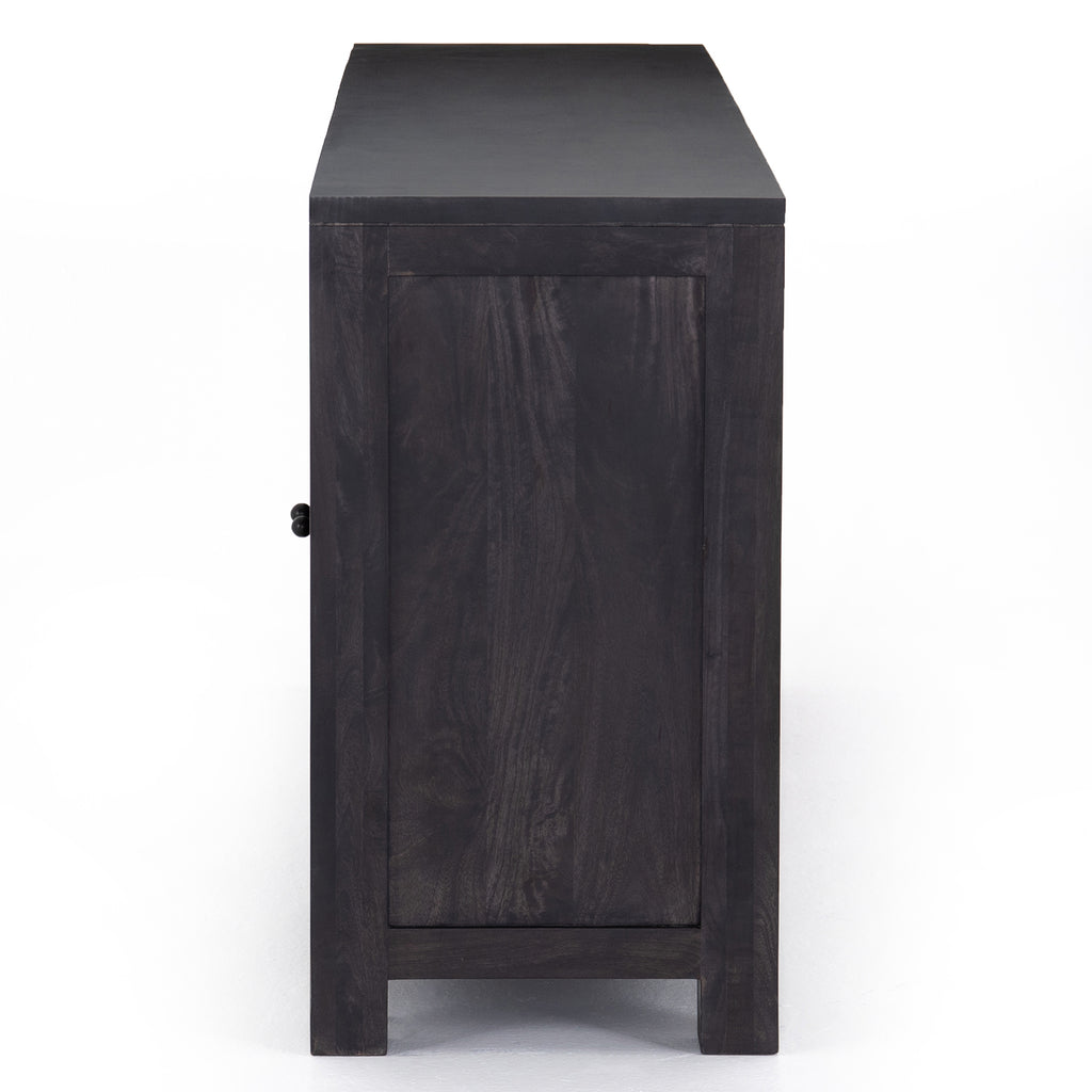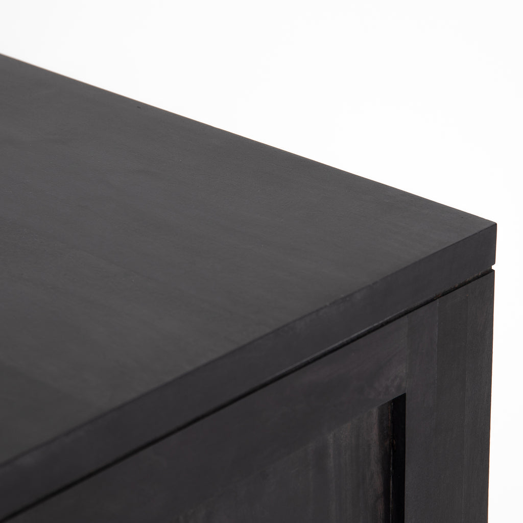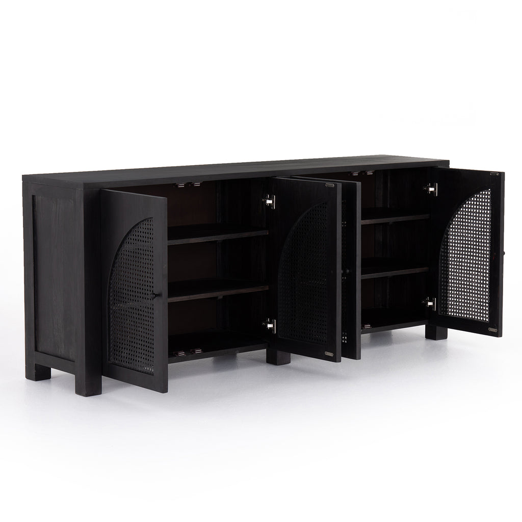 Grand in scale and presence. Black-washed mango encases arched cane door panels featuring black-finished iron hardware, meeting a forward-thinking material mix with monochromatic vibes.