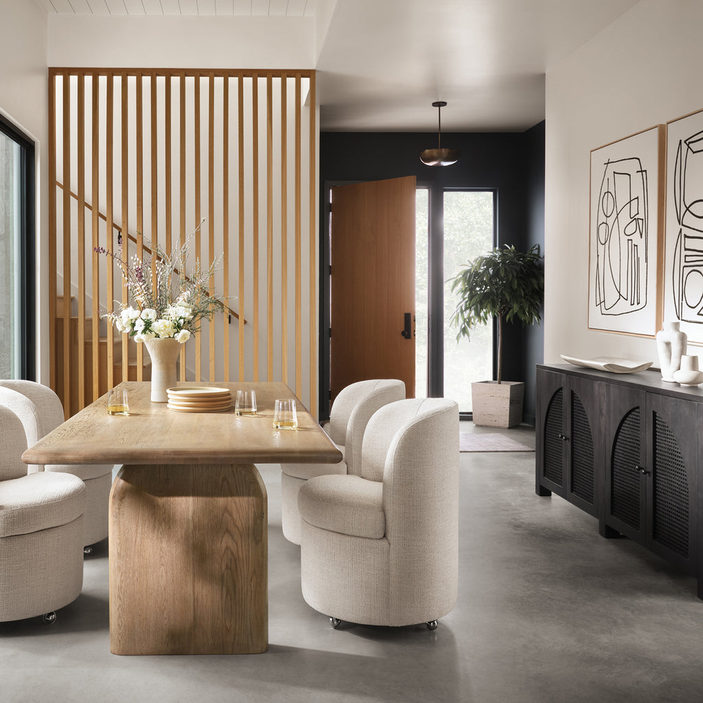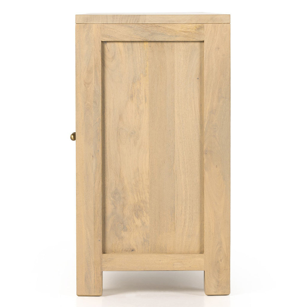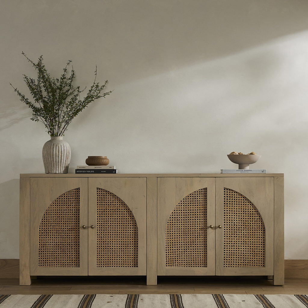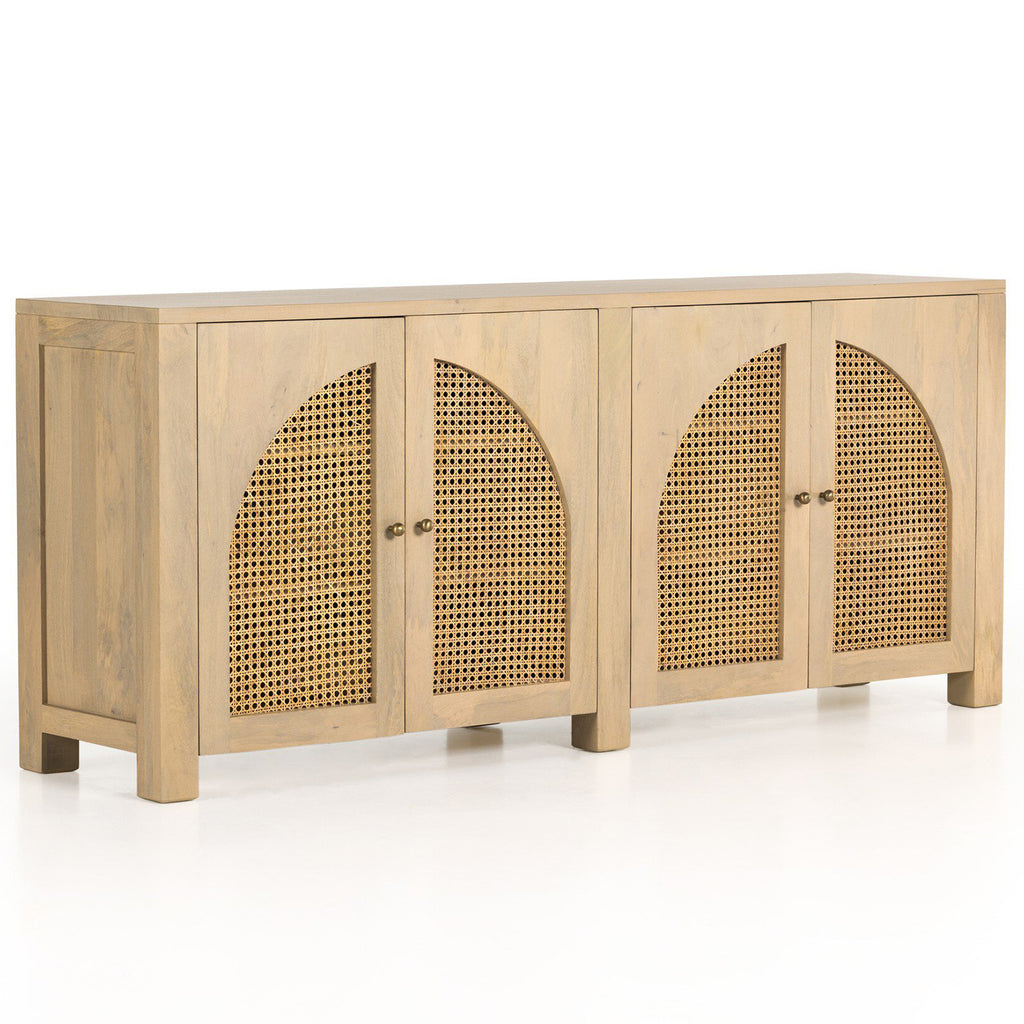 Grand in scale and presence. Black-washed mango encases arched cane door panels featuring black-finished iron hardware, meeting a forward-thinking material mix with monochromatic vibes.