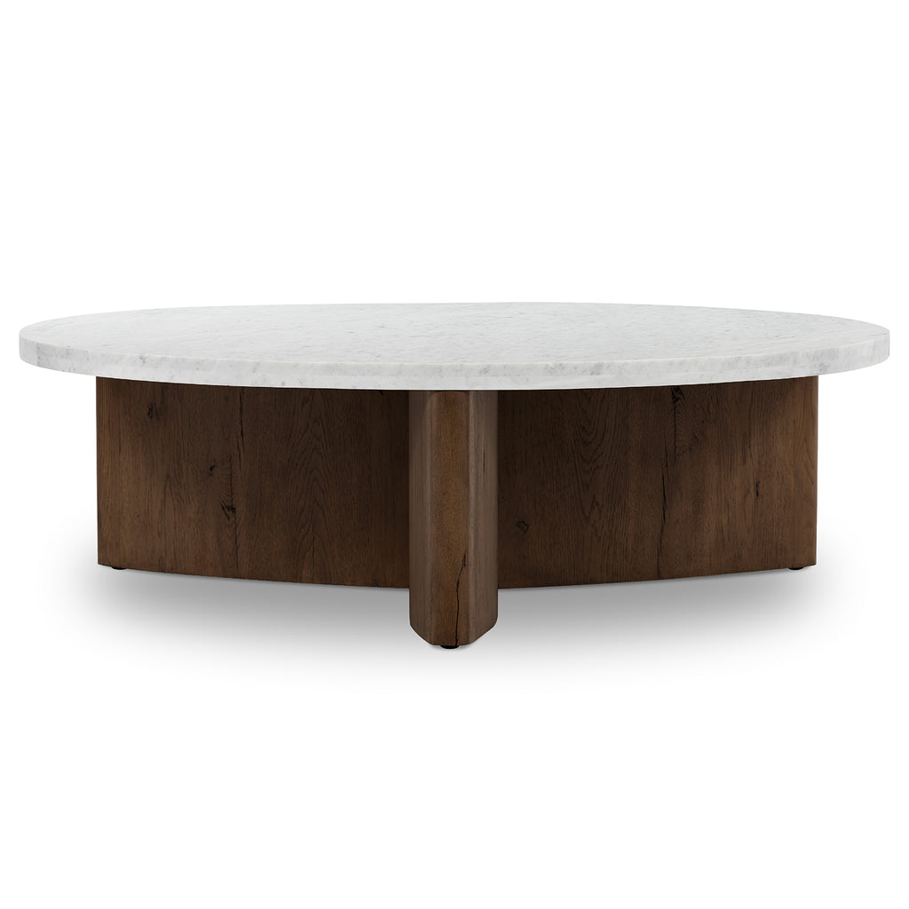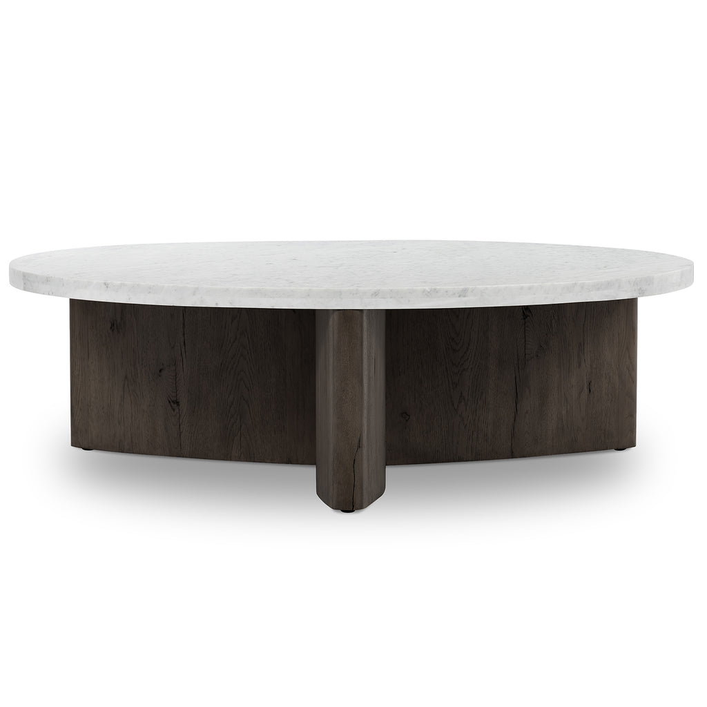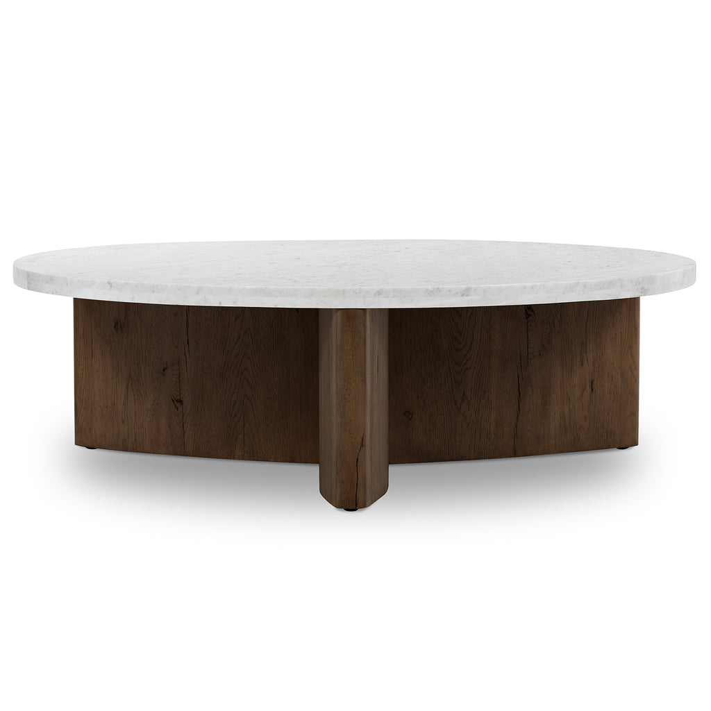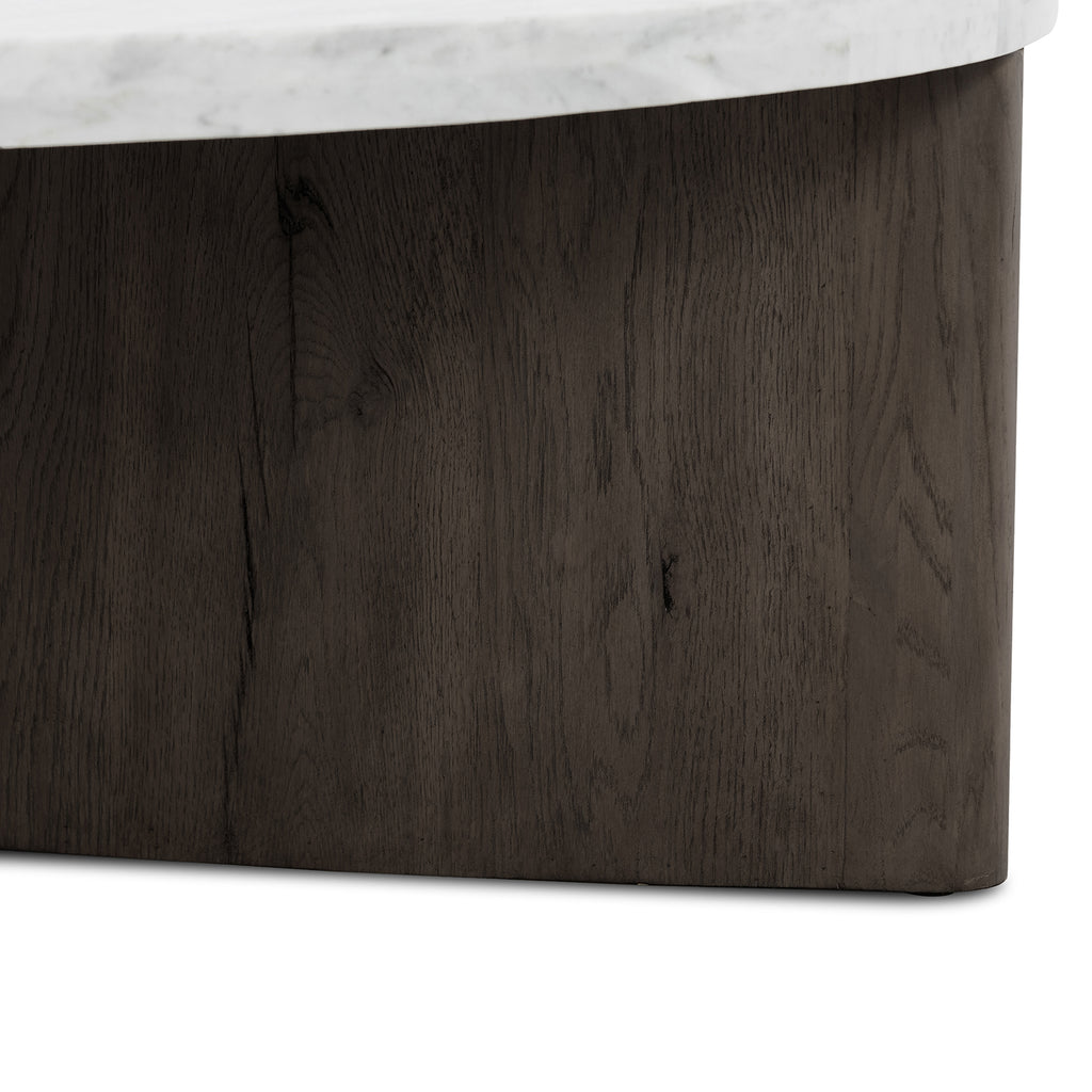 Mixed materials make the table. Thick-cut oak forms a chunky pedestal base for a rounded tabletop, with beautifully subtle natural veining. Designed in partnership with longtime Four Hands collaborator Thomas Bina and Brazilian designer Ronald Sasson.