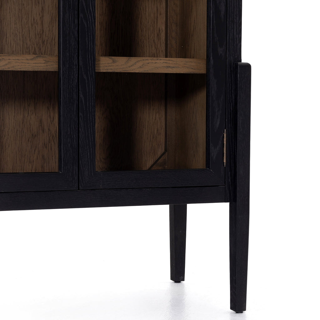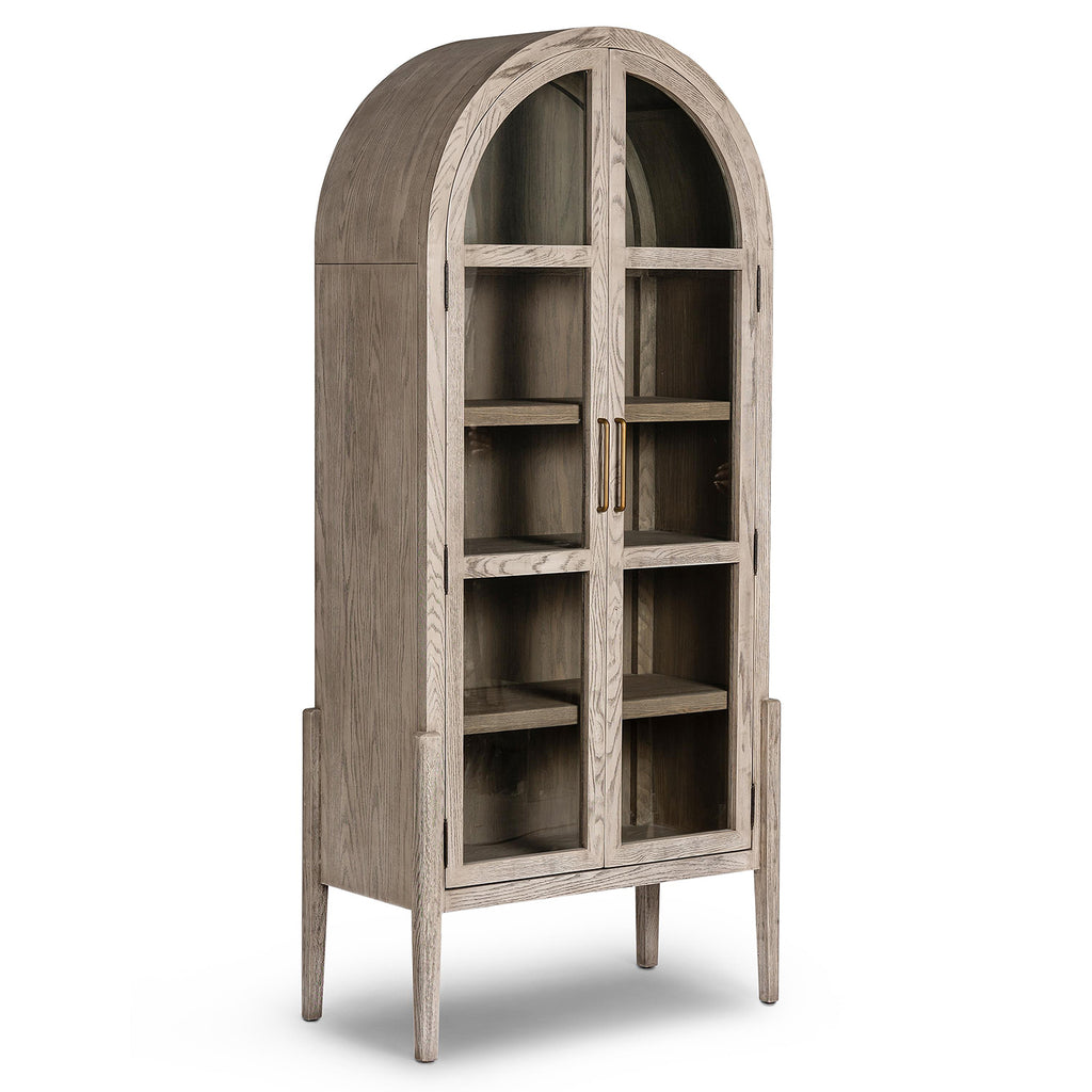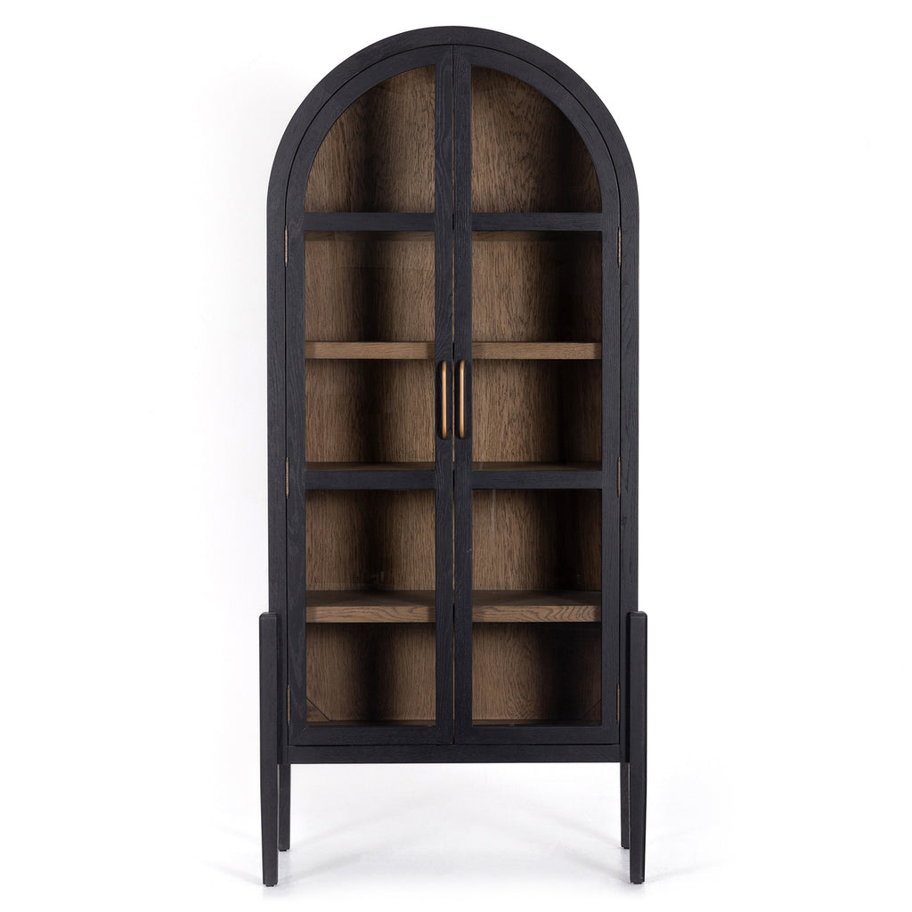 Store it in style. Beautifully shaped cabinetry of solid oak features spacious interior shelving and clear glass front, ready for displaying favorite books, photos and treasures.
