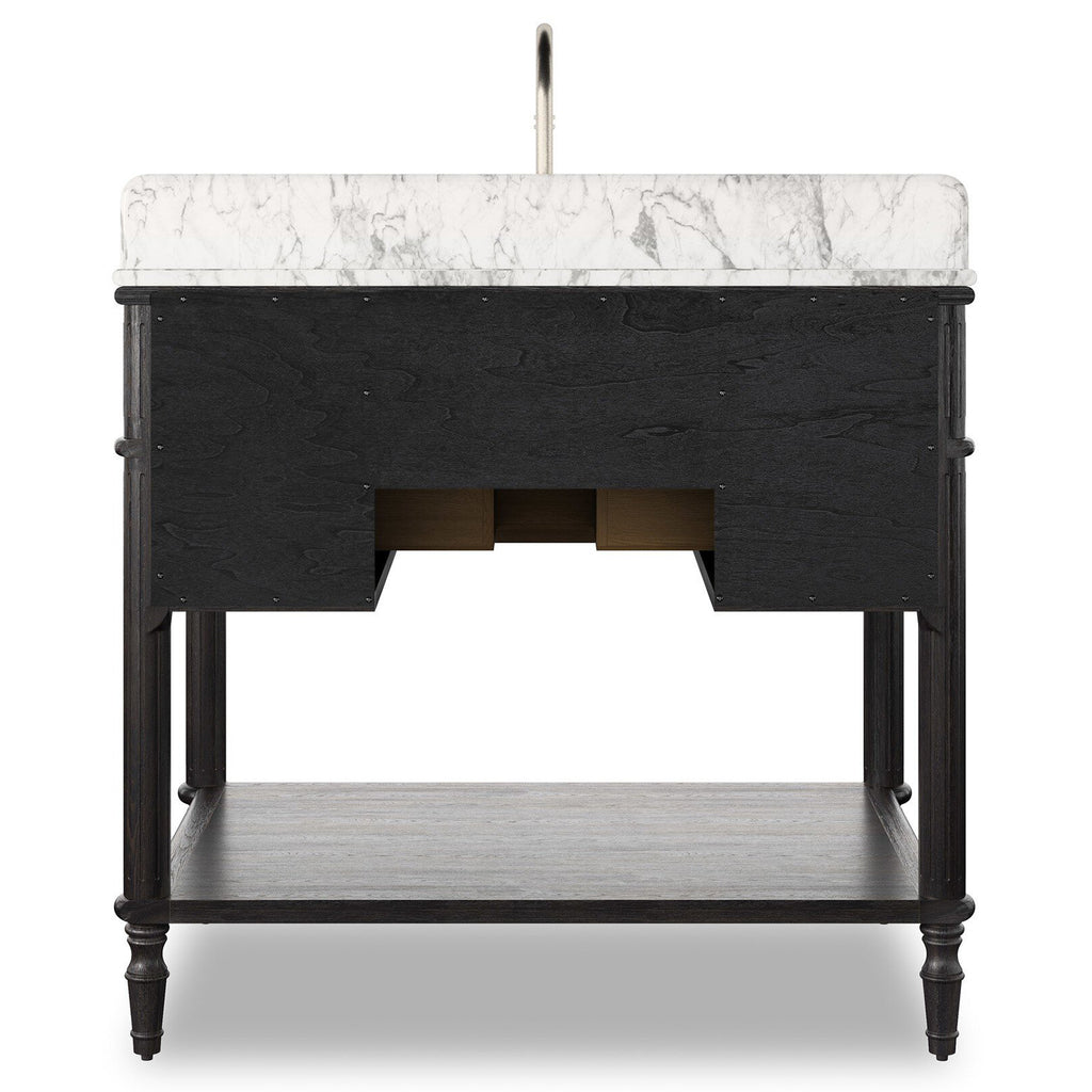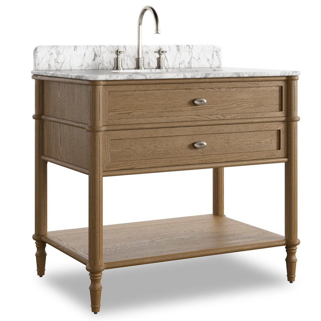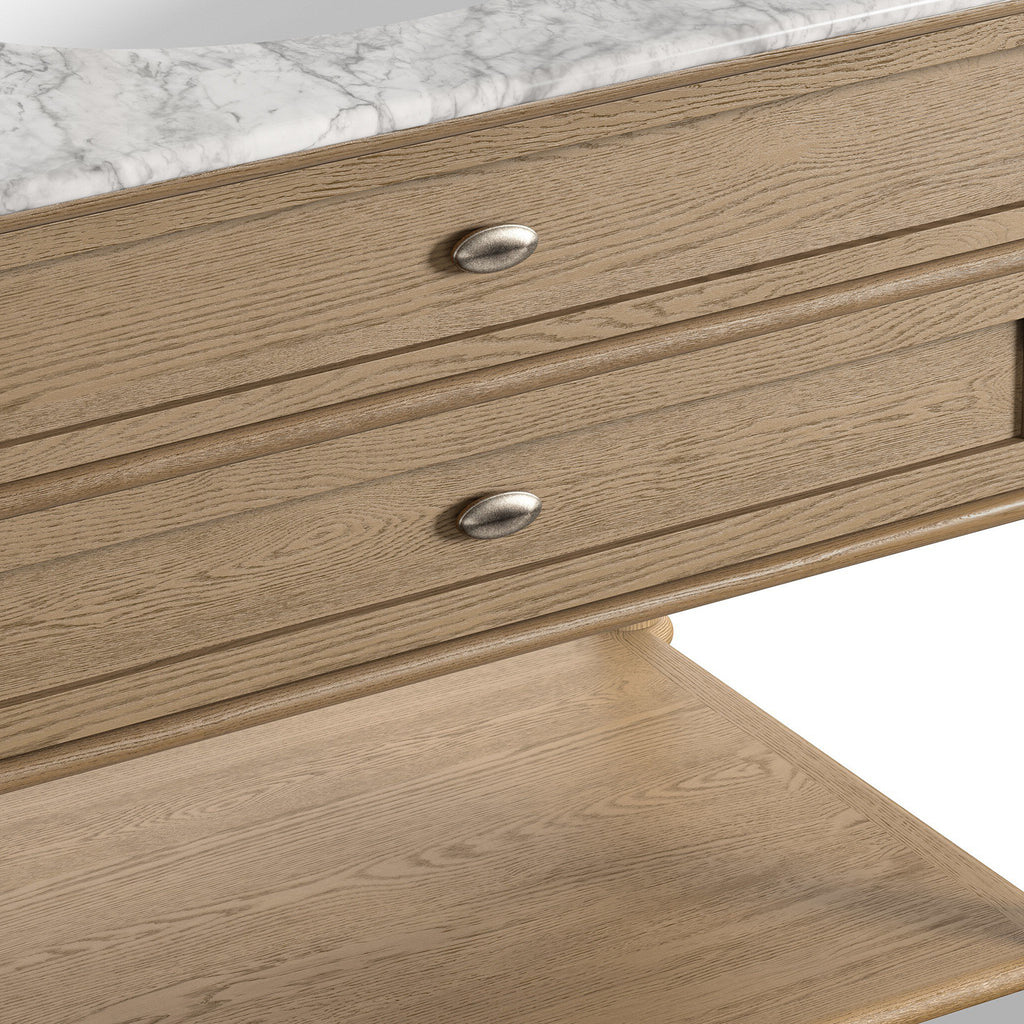 Influenced by vintage European lines, this inspired bath vanity brings a sense of calm and serenity to the bath space. Crafted from solid oak and veneer with rounded corners and tapered spindle legs in a natural washed blonde finish, aged satin brass hardware and a Carrara marble top. Includes top faux drawer, bottom drawer with U-shape cutout to accommodate plumbing fixtures and a deep open shelf below. Finished with a bath-safe sealant for moisture resistance. Designed to accommodate 8”-widespread faucets and standard-size hardware for easy customization; faucet shown not included. Sink and backsplash included; backsplash ships separately. Removable back with cutouts for plumbing; fits standard P-trap. Professional installation required.