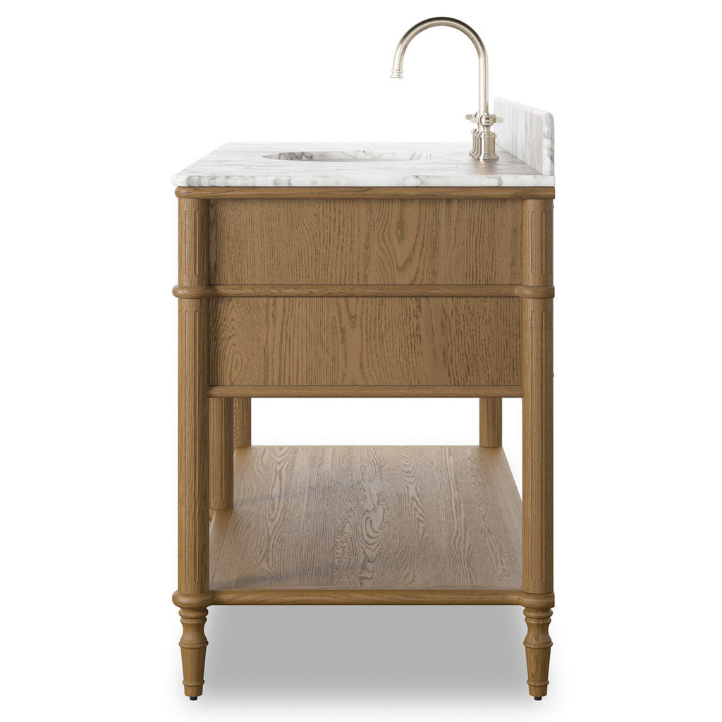 Influenced by vintage European lines, this inspired bath vanity brings a sense of calm and serenity to the bath space. Crafted from solid oak and veneer with rounded corners and tapered spindle legs in a natural washed blonde finish, aged satin brass hardware and a Carrara marble top. Includes four functional drawers and a deep open shelf below. Finished with a bath-safe sealant for moisture resistance. Designed to accommodate 8”-widespread faucets and standard-size hardware for easy customization; faucet shown not included. Sink and backsplash included; backsplash ships separately. Removable back with cutouts for plumbing; fits standard P-trap. Professional installation required.