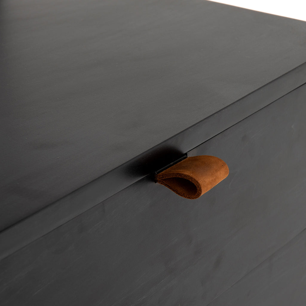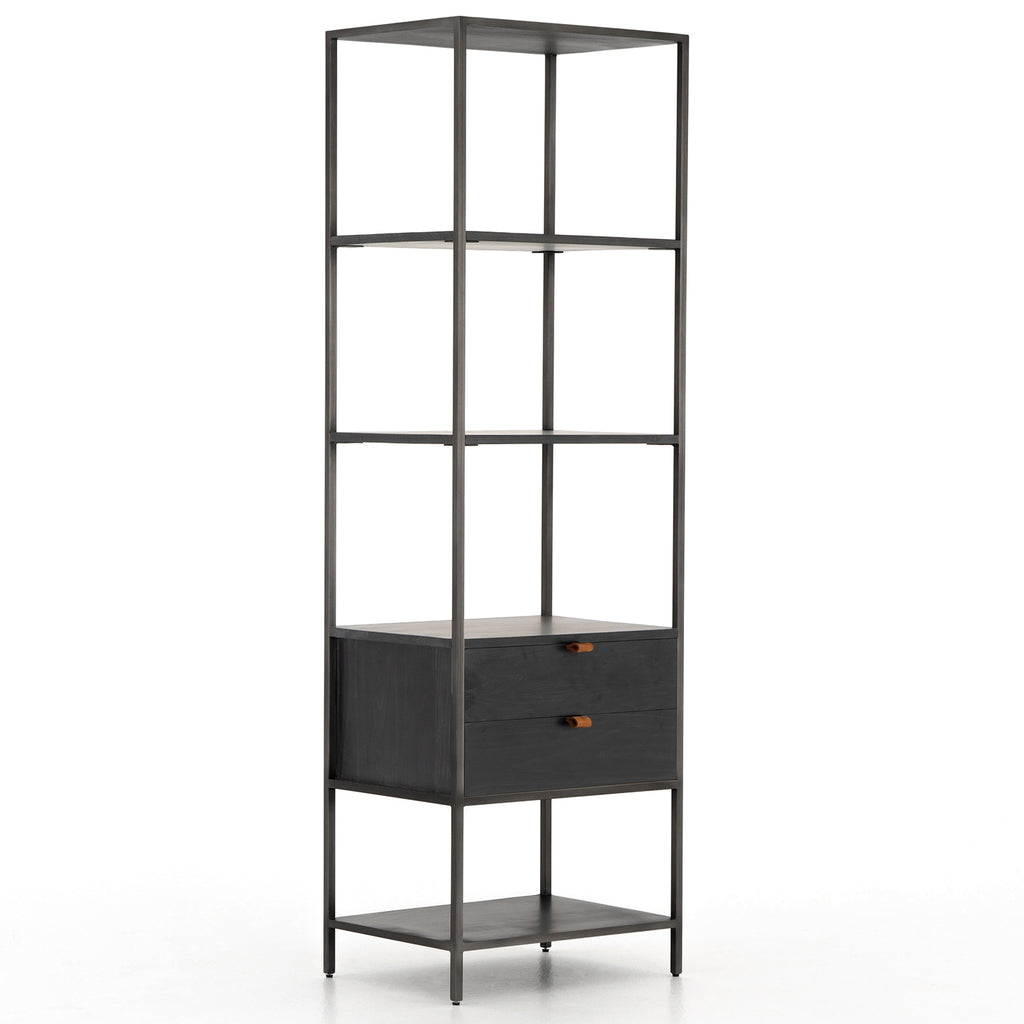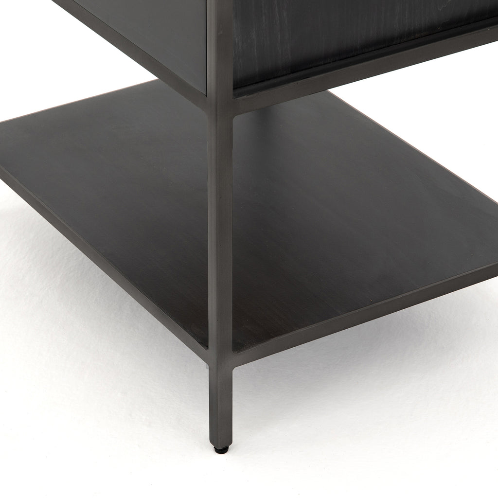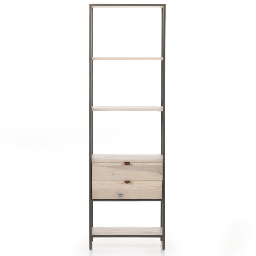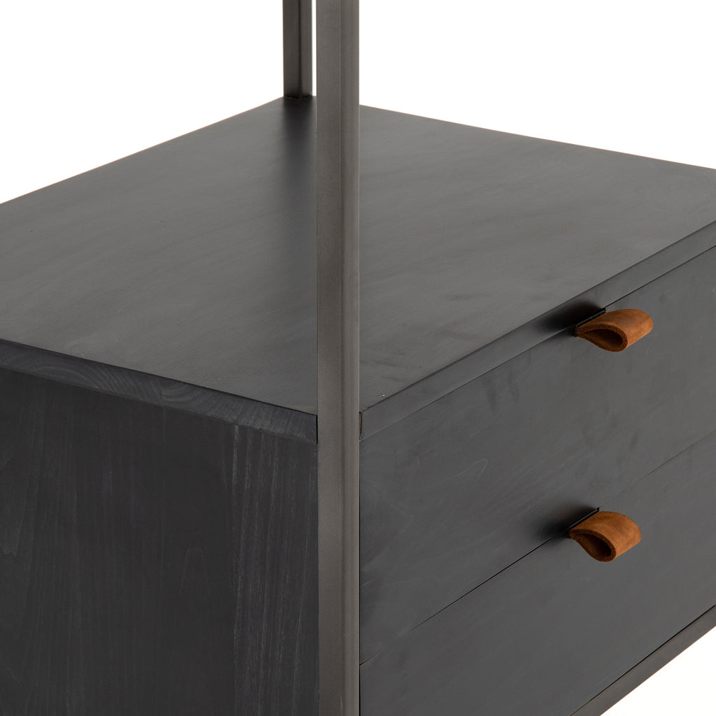 Inspired by clean mid-century design, poplar and raw iron fuse for plenty of storage space by way of open shelving and dual drawers. Metal-secured leather pulls add a textural element of surprise. Great alone or doubled and paired with matching media console.