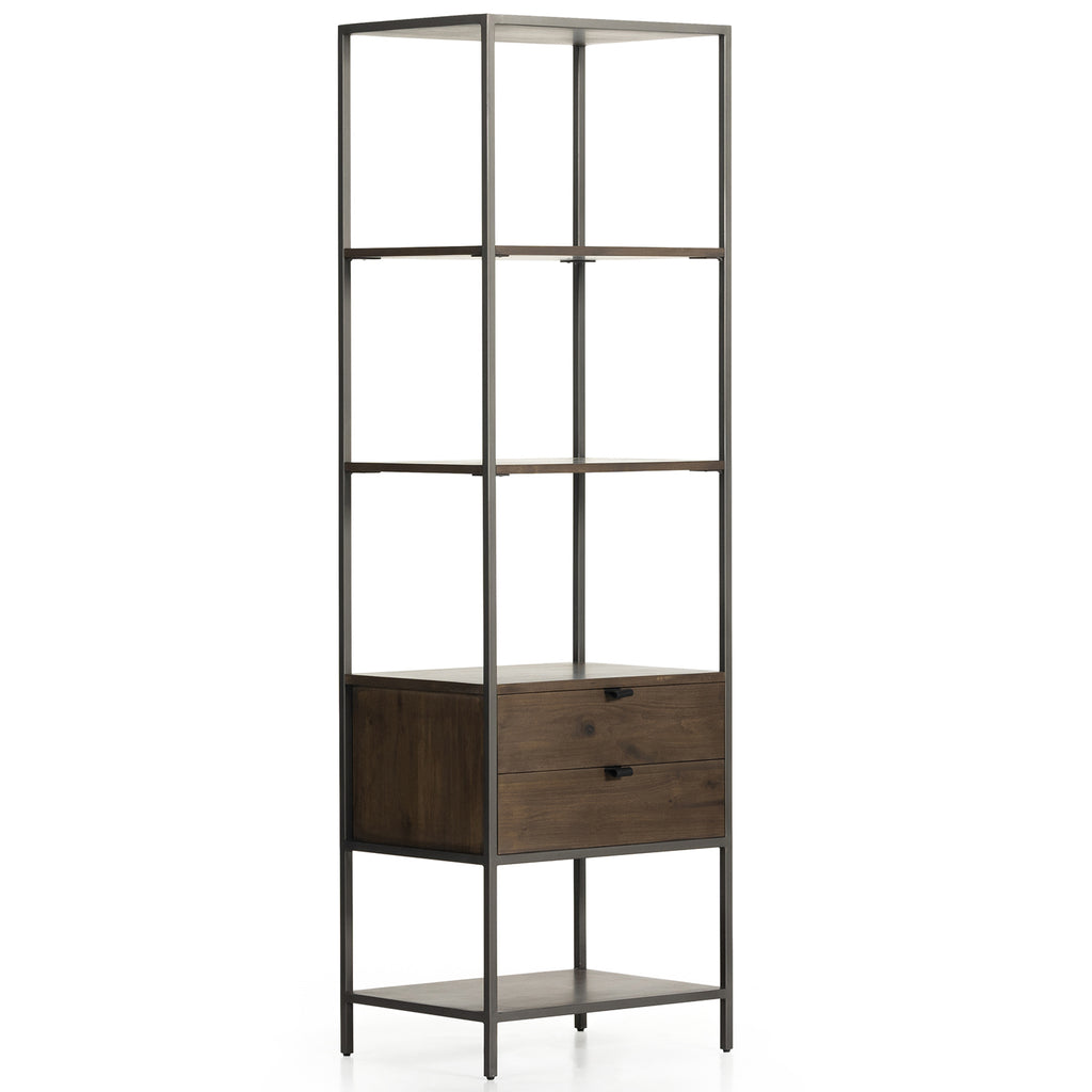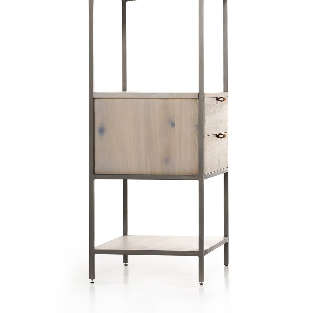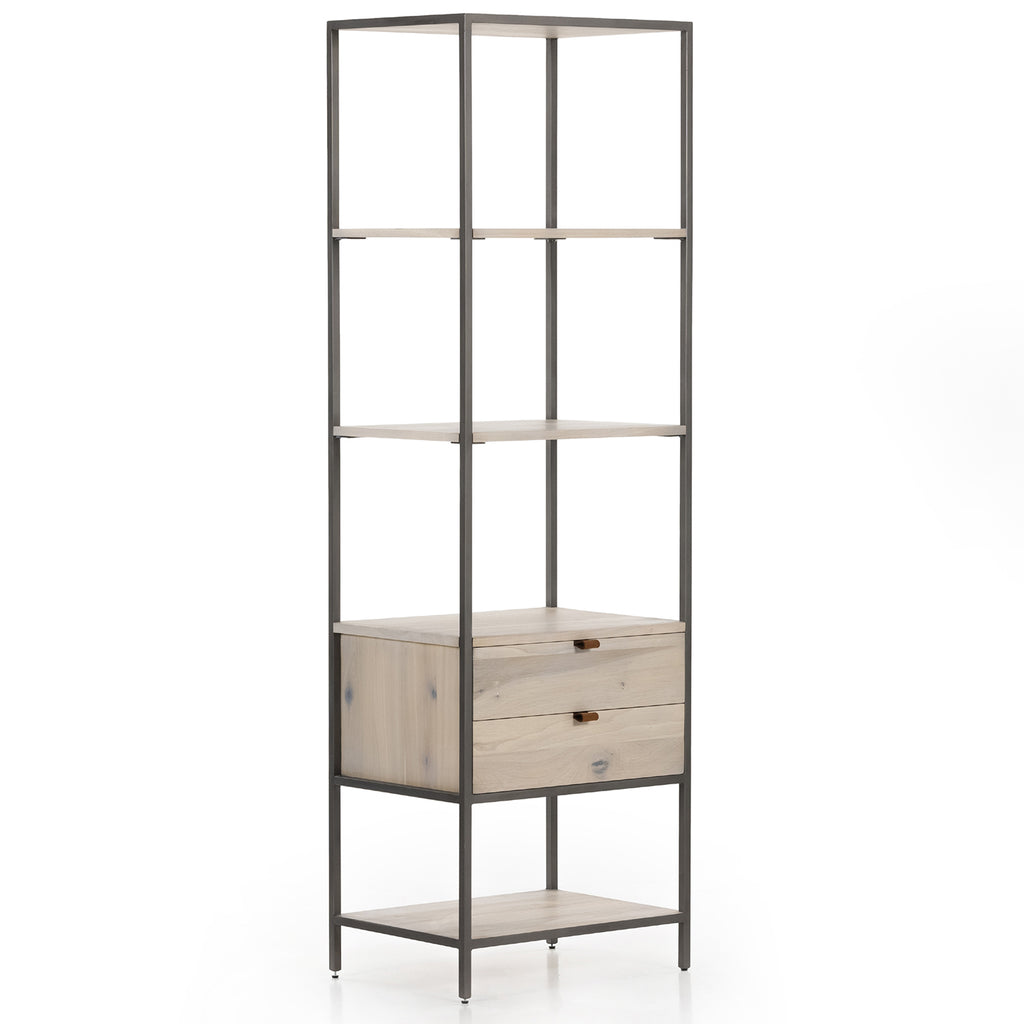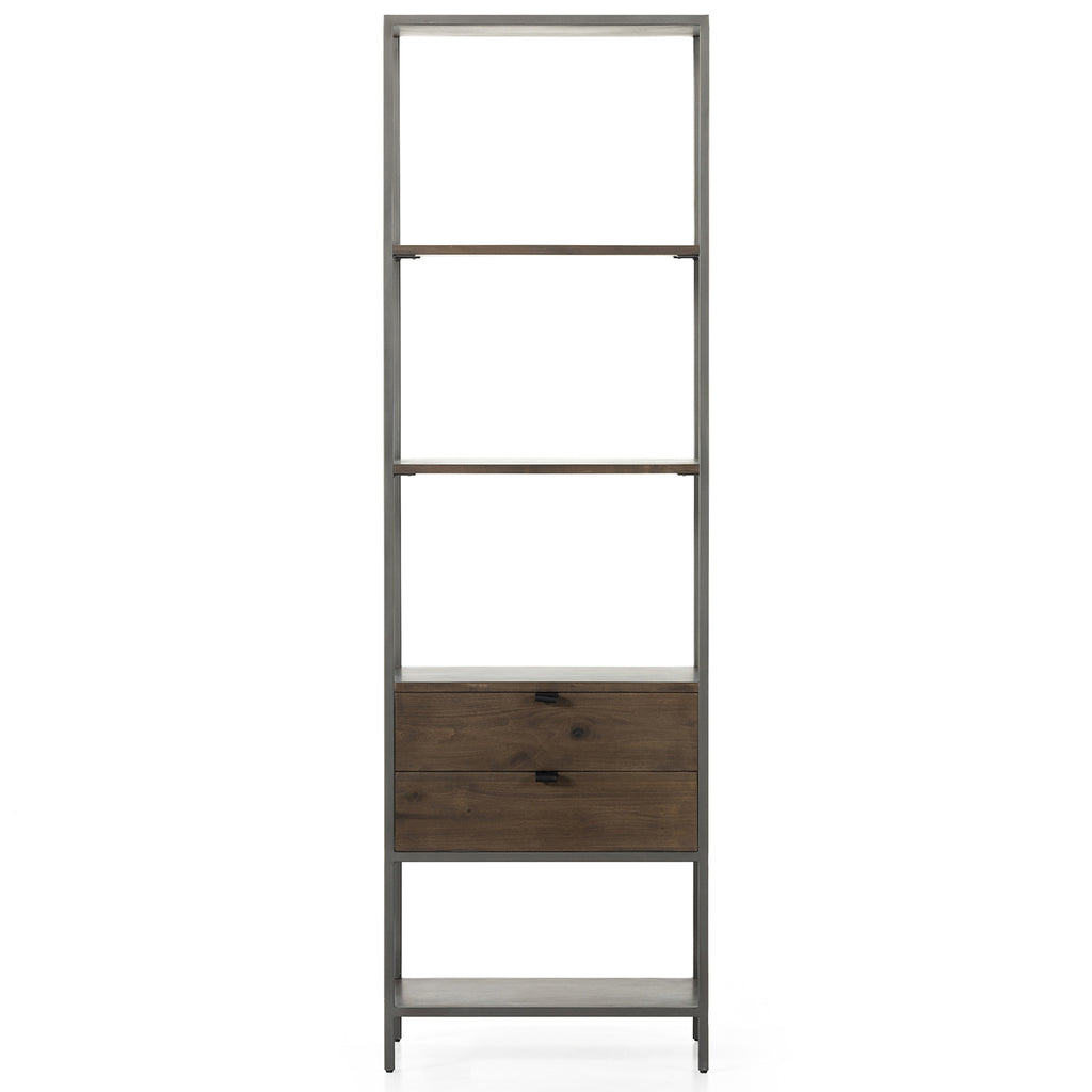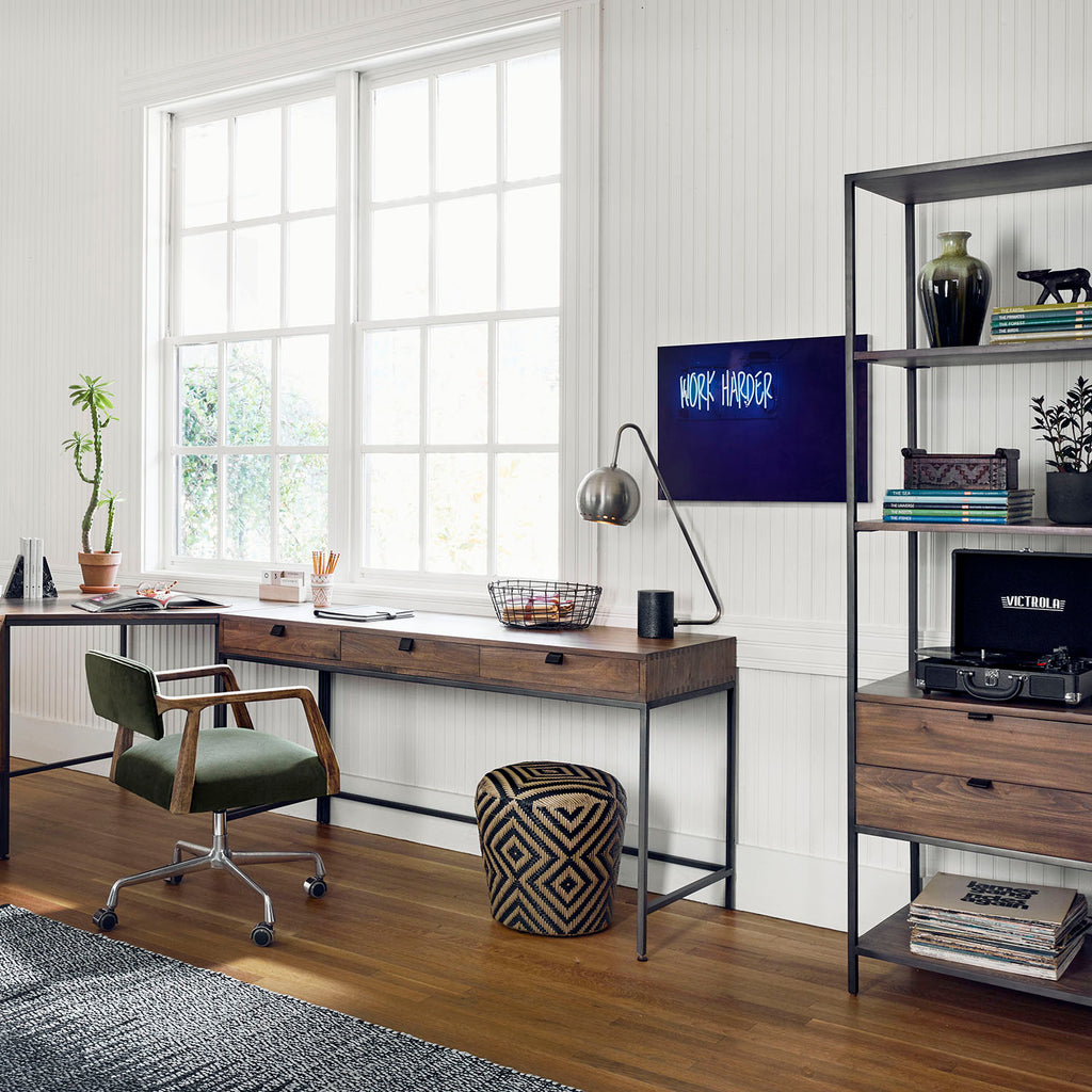 Inspired by clean mid-century design, poplar and raw iron fuse for plenty of storage space by way of open shelving and dual drawers. Metal-secured leather pulls add a textural element of surprise. Great alone or doubled and paired with matching media console.