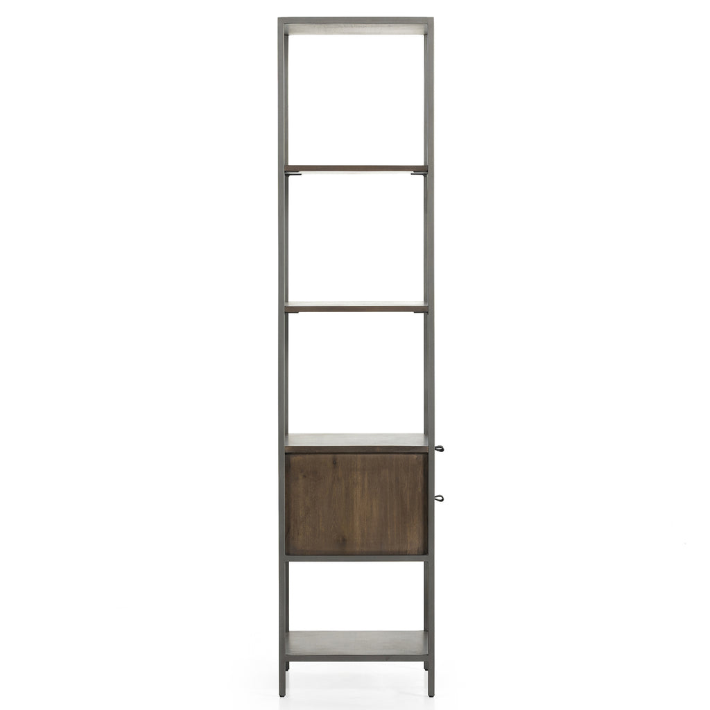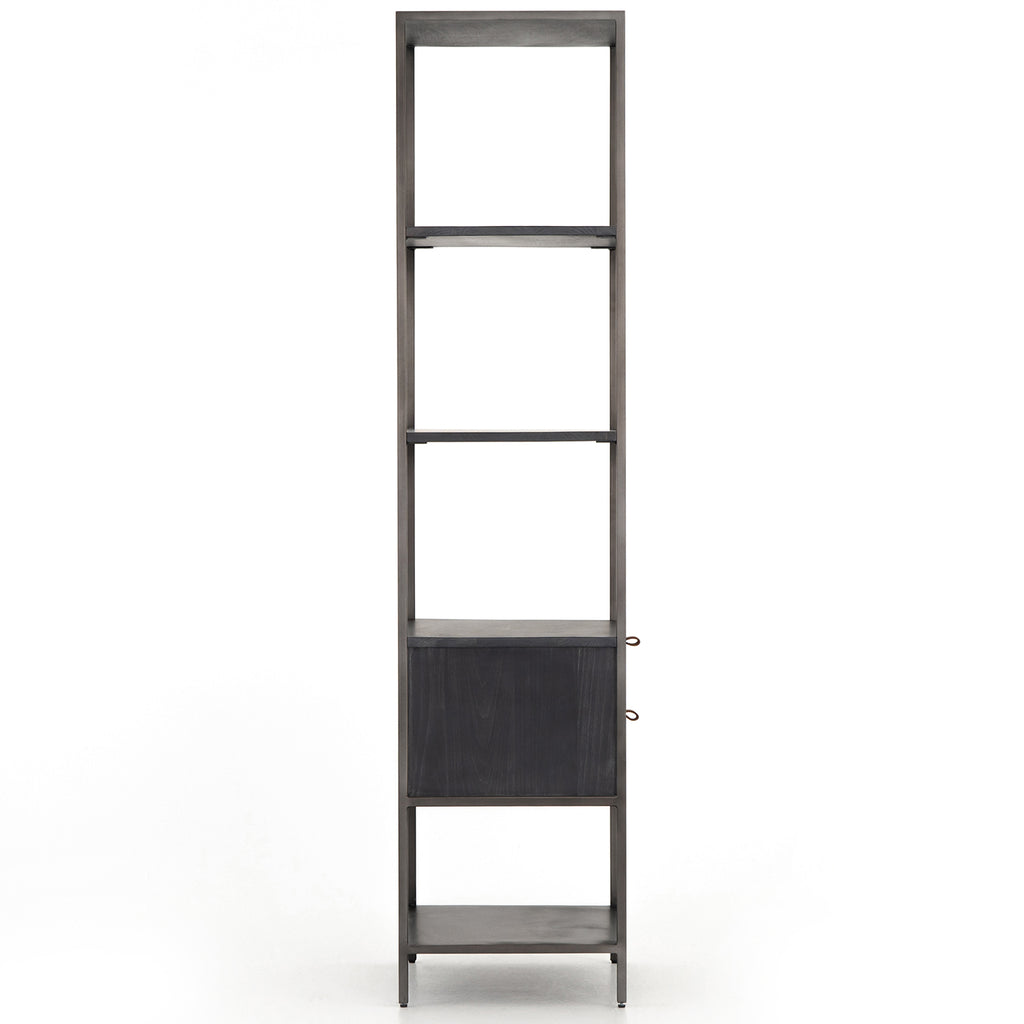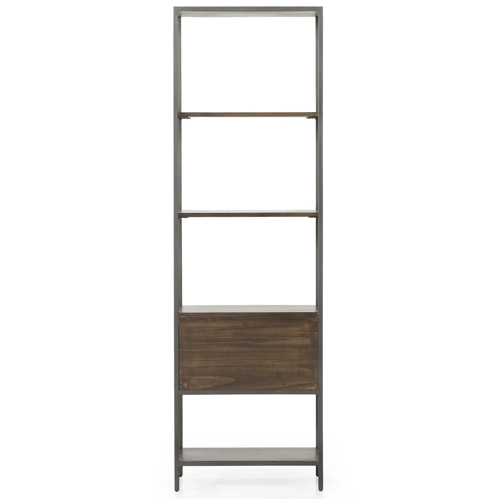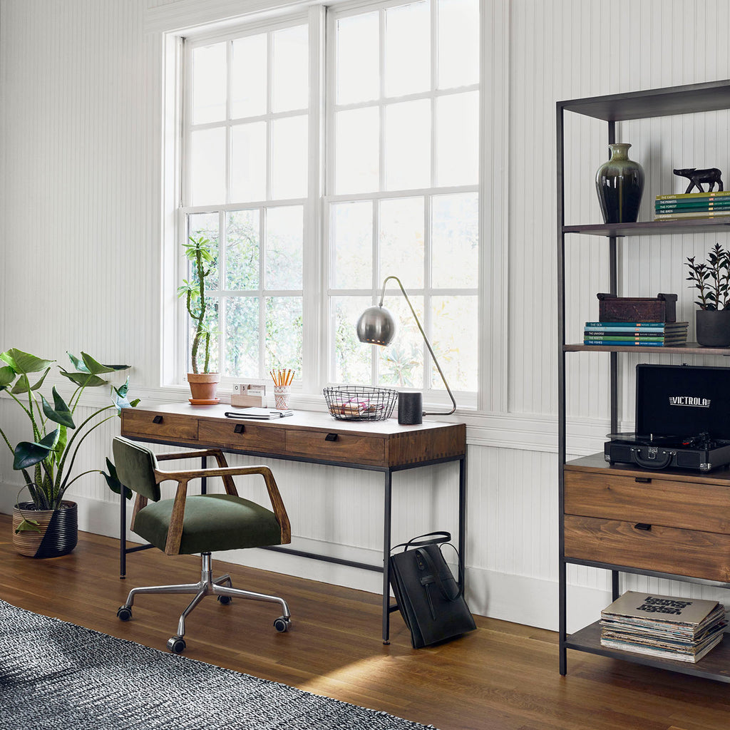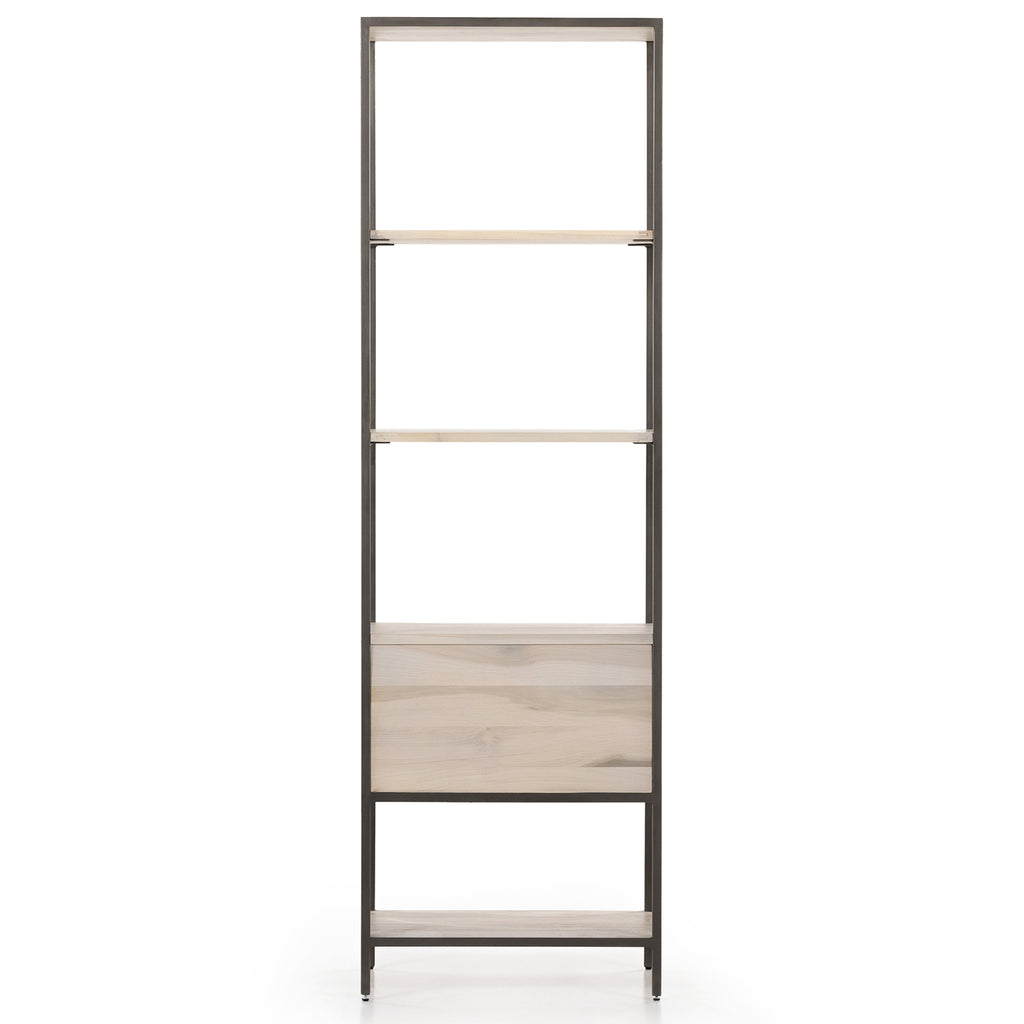 Inspired by clean mid-century design, poplar and raw iron fuse for plenty of storage space by way of open shelving and dual drawers. Metal-secured leather pulls add a textural element of surprise. Great alone or doubled and paired with matching media console.