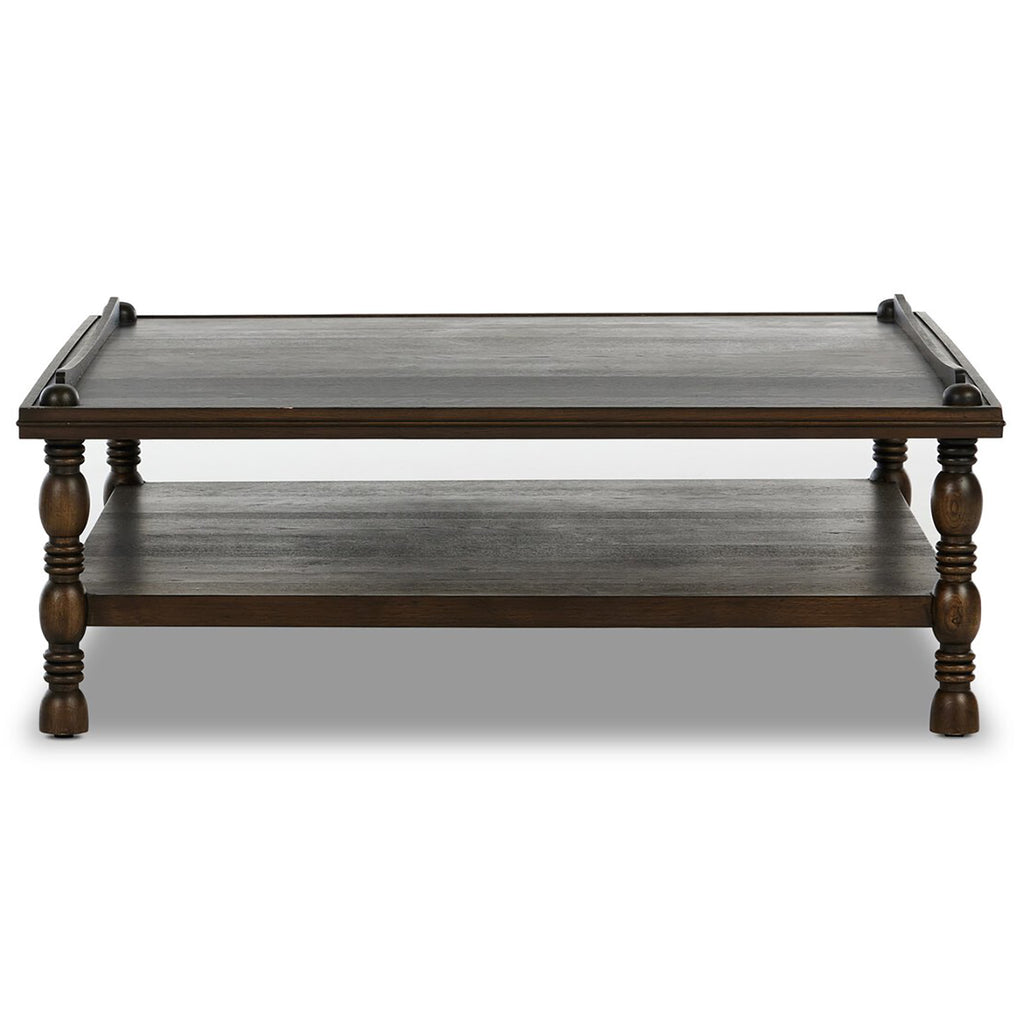 Lathe turned, knob-style detailing adds a thoughtful touch to an heirloom-inspired coffee table. Made from oak and finished in a rich espresso, two tiers offer plenty of space for storage and display in the living room.