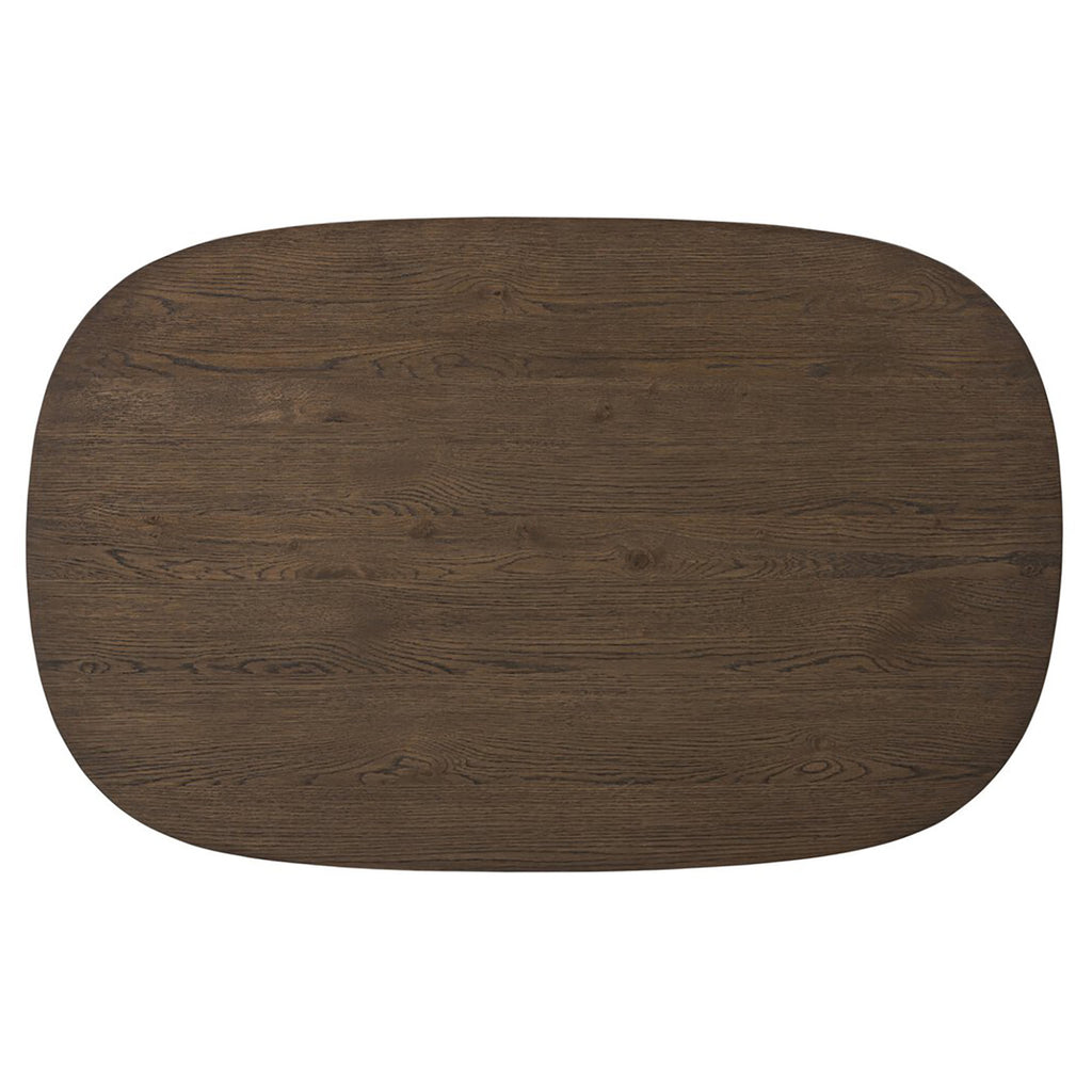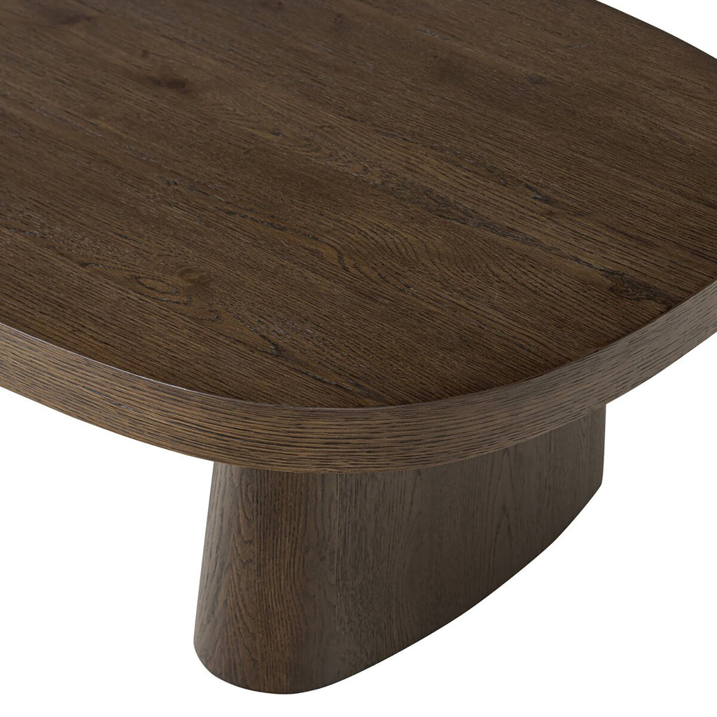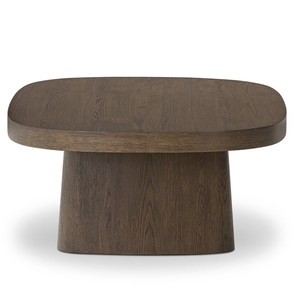 Made from rustic brown oak, a rectangular coffee table is streamlined while not short on presence, with its exaggerated cylinder legs and polished pill-shaped top.
