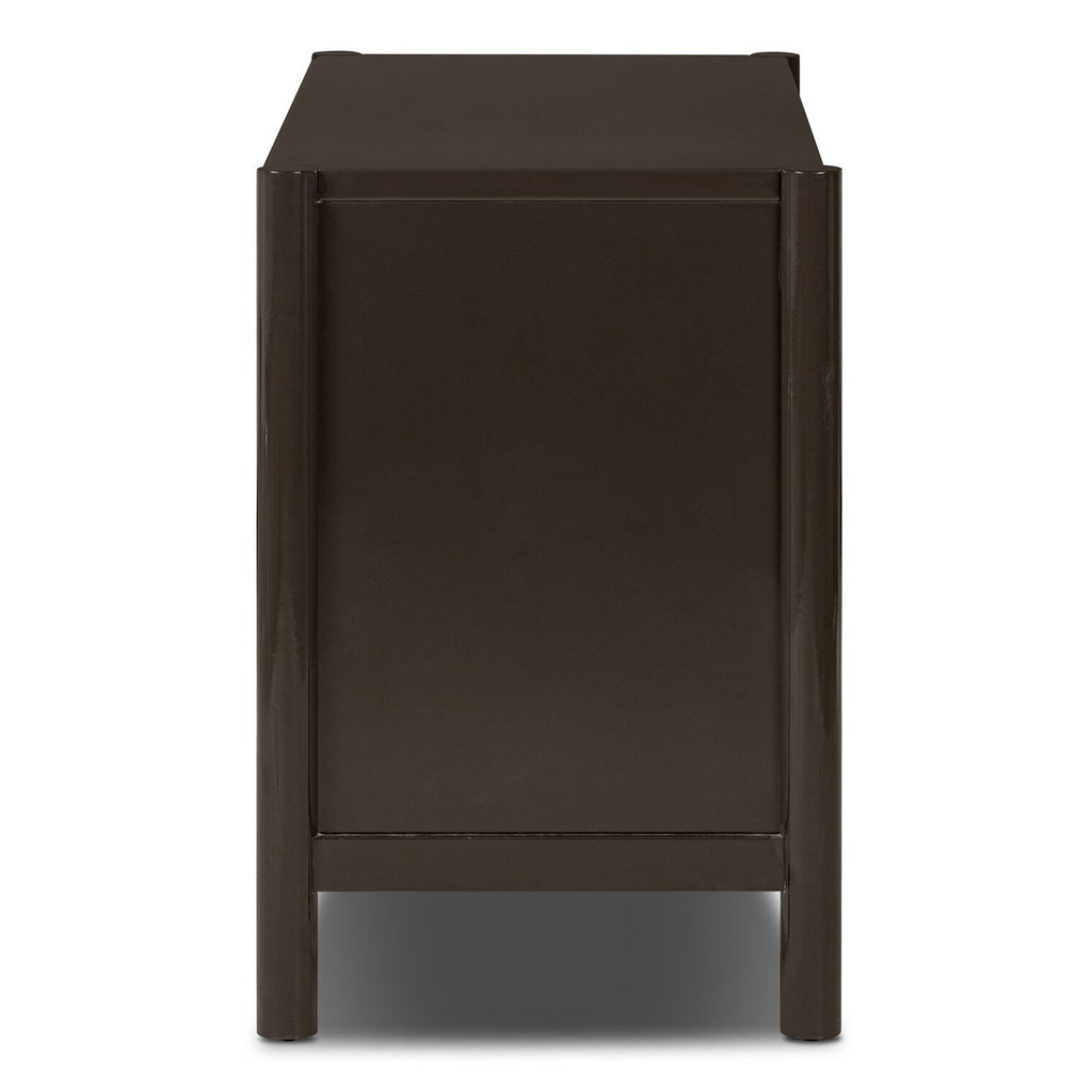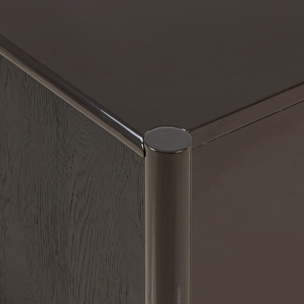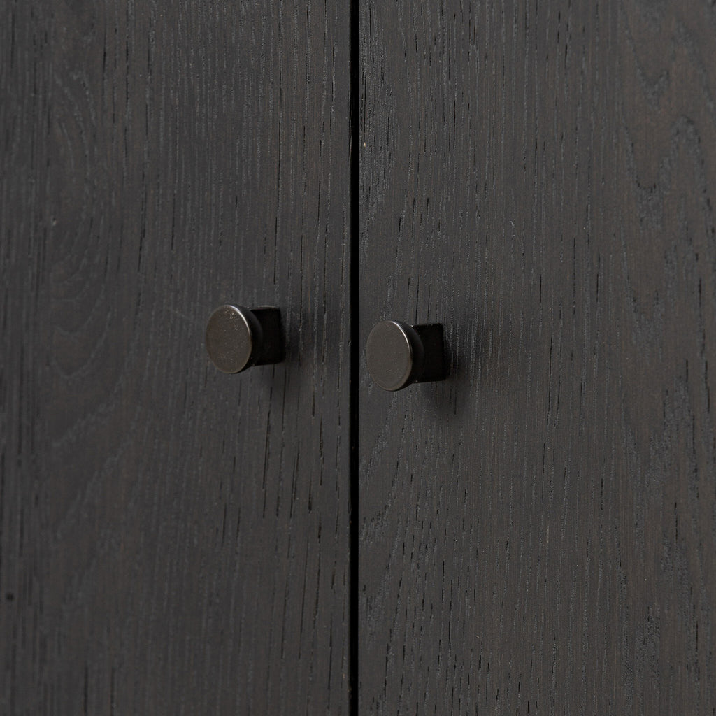 Lacquered cabinets make for evocative storage with their everlasting glossy finish. Great for small spaces, this sideboard with interior shelves features worn black oak doors for balance and contrast.