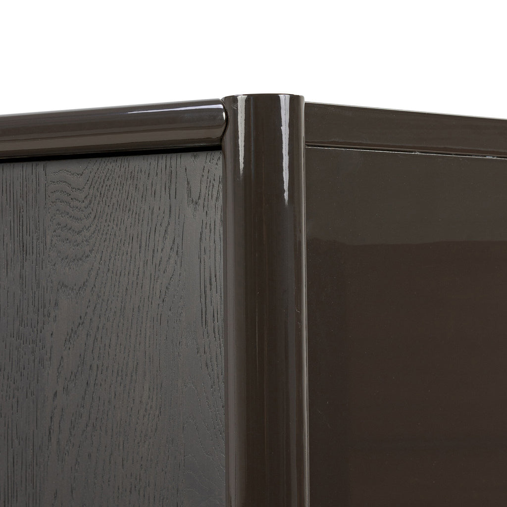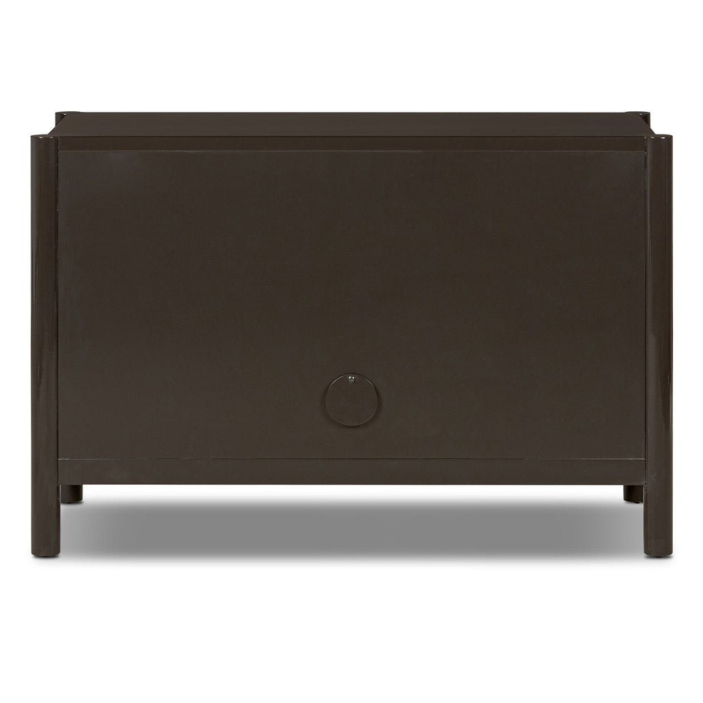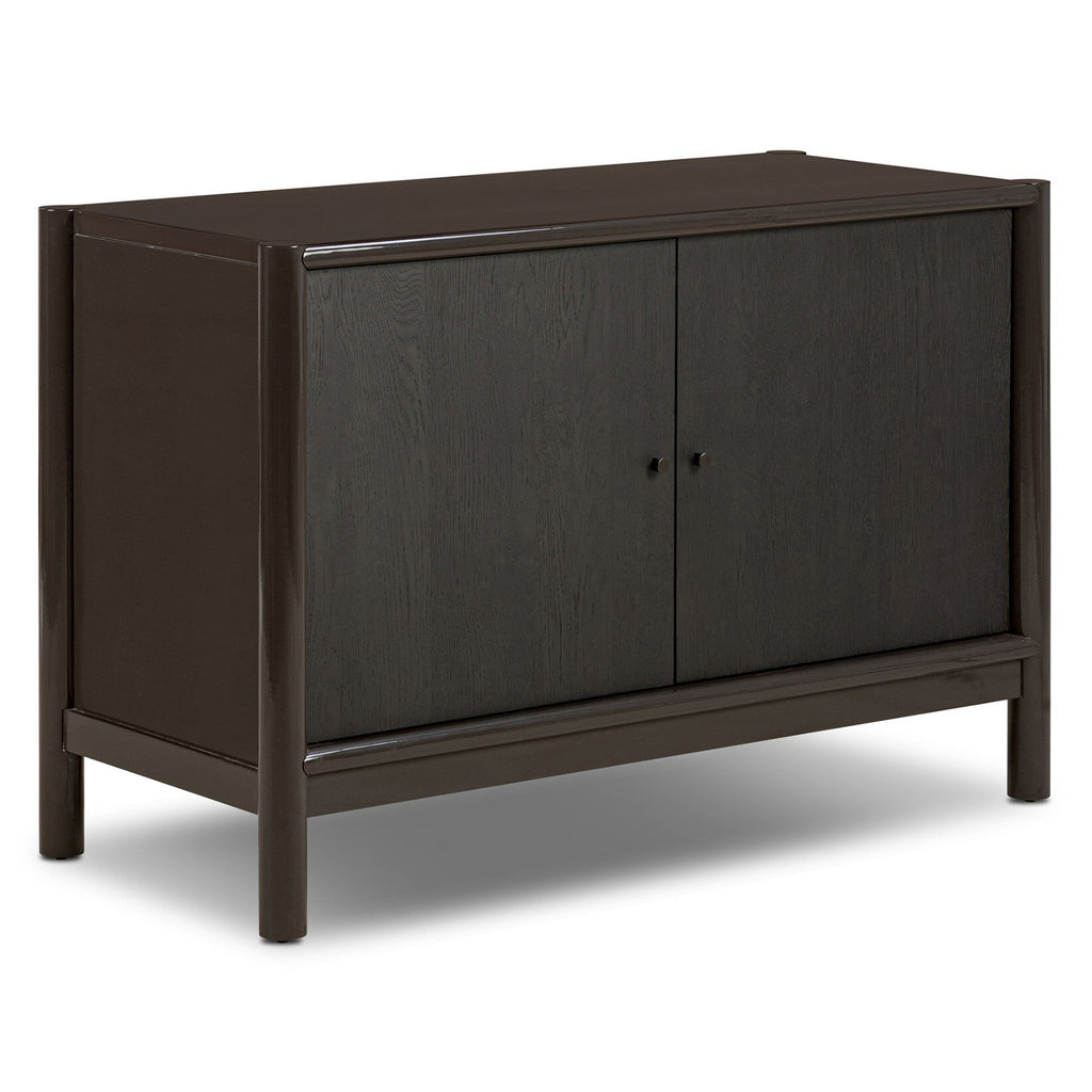 Lacquered cabinets make for evocative storage with their everlasting glossy finish. Great for small spaces, this sideboard with interior shelves features worn black oak doors for balance and contrast.