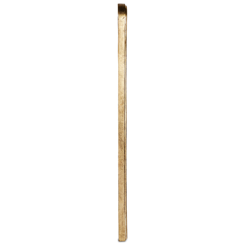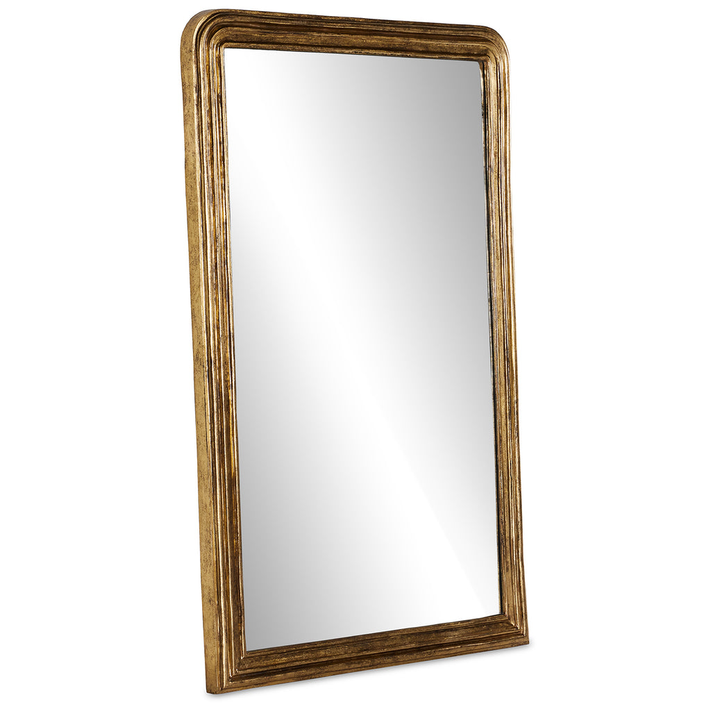 An art deco-inspired statement piece. An aged-gold leaf finish brings a vintage, found look to this large-scale floor mirror.