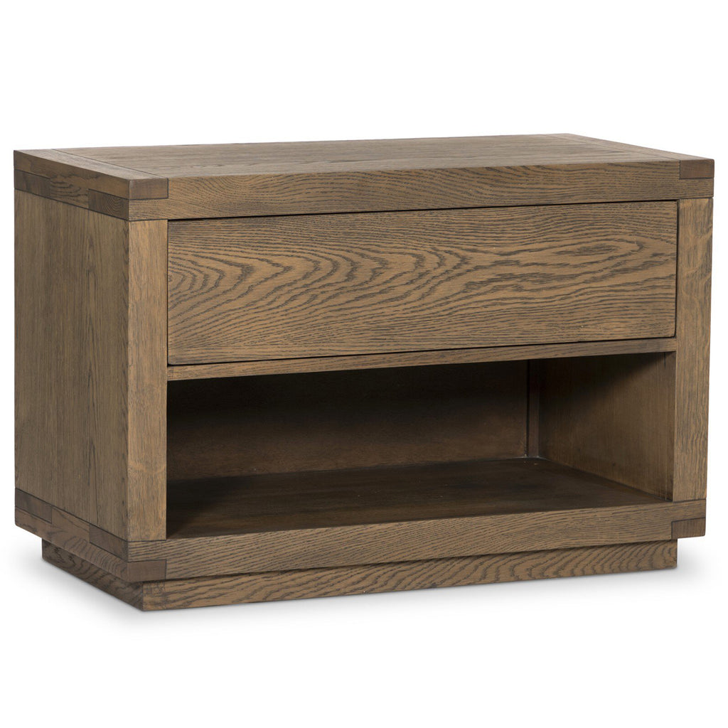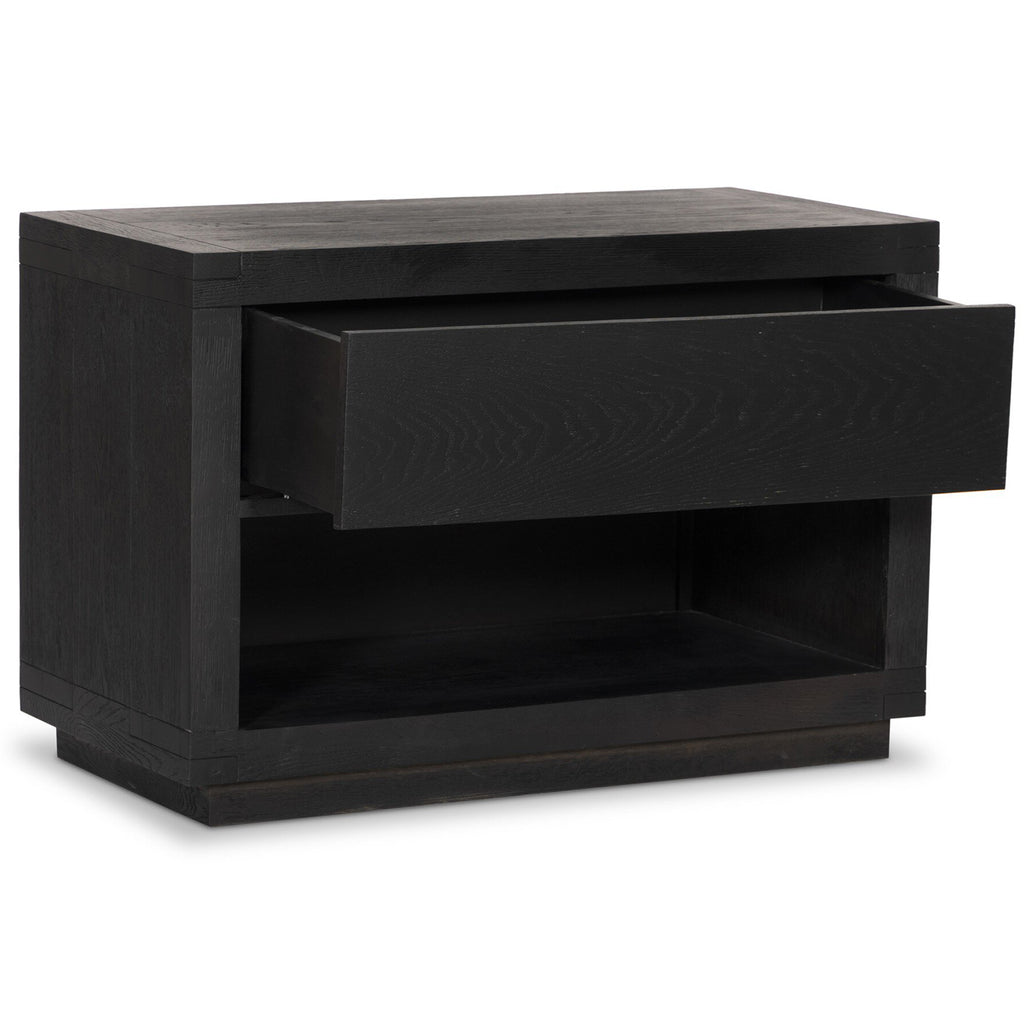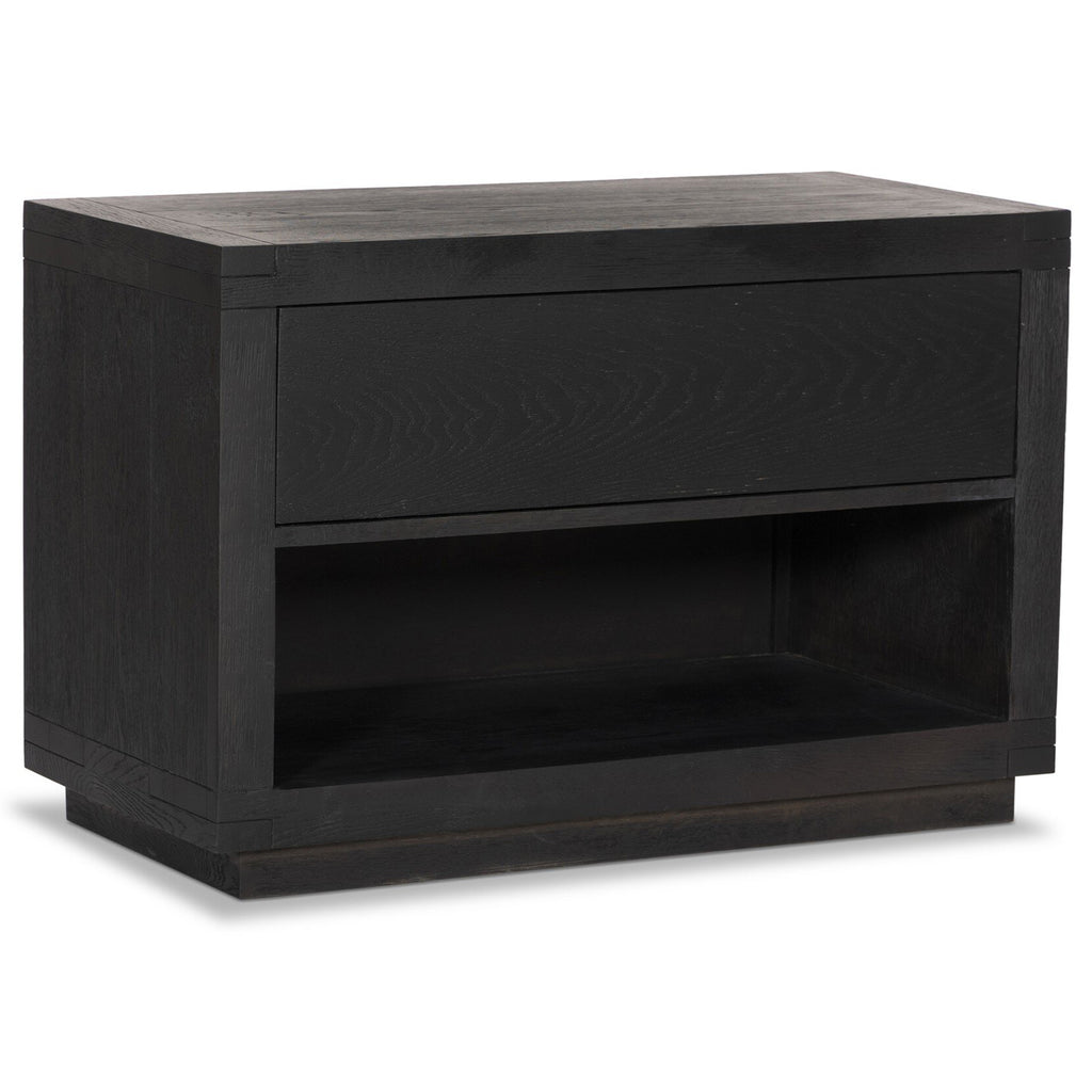 Solid acacia shapes a streamlined box-style nightstand, with lap joint corners for a detail-driven touch. Finished with smooth, push-latch drawer glides.