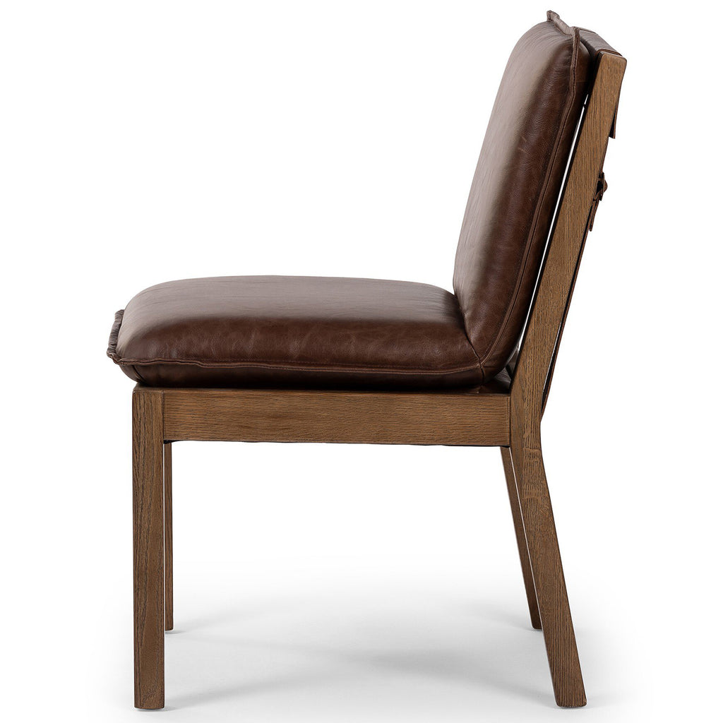 Inspired by the folded pillow form, the seat and back cushions of this oak dining chair are covered in brown top-grain leather. The chair back features leather strap details for a mixed material touch.