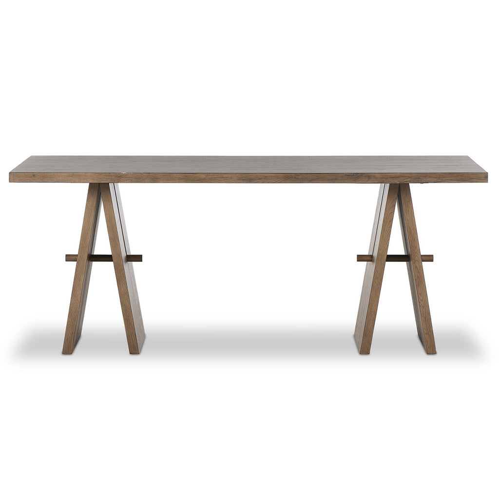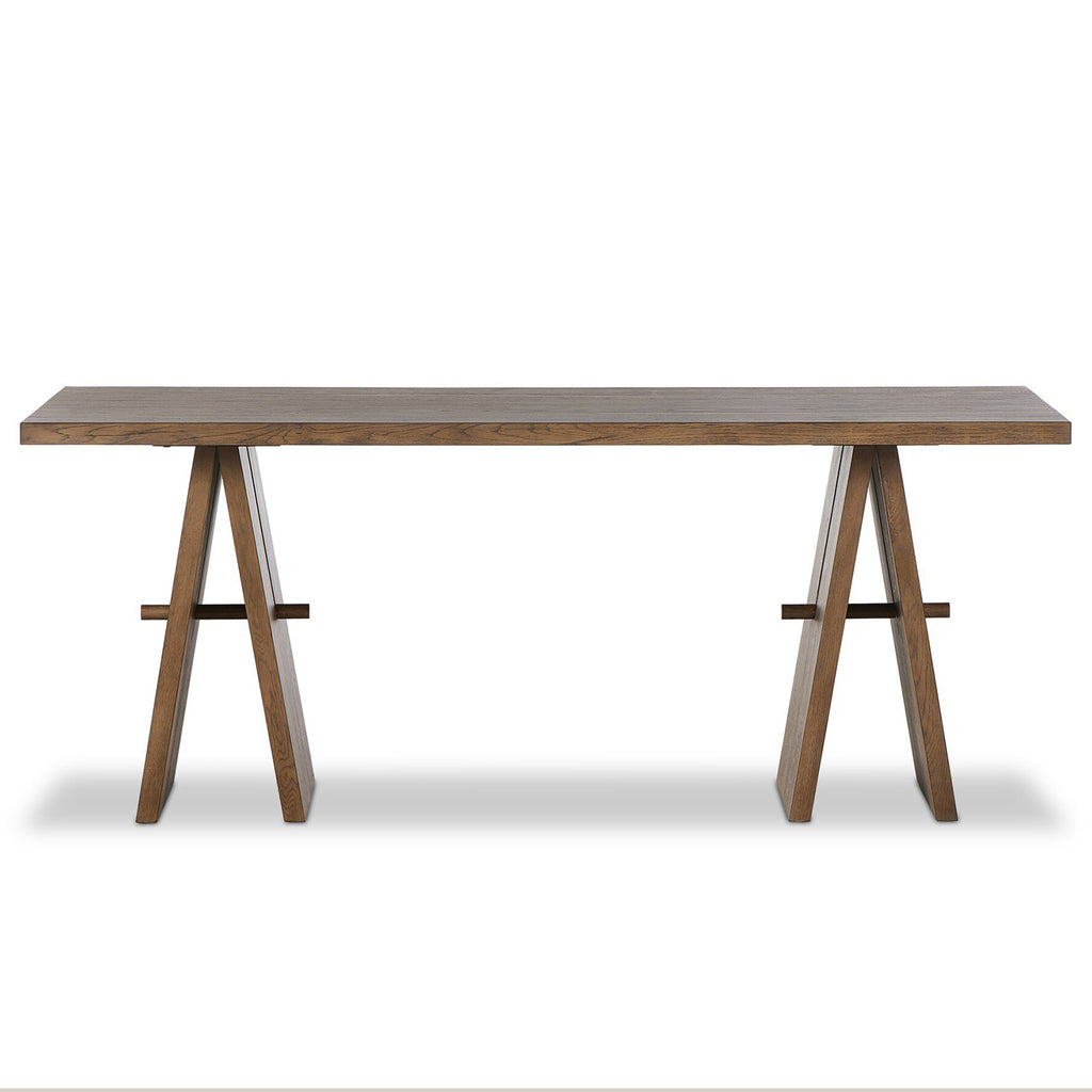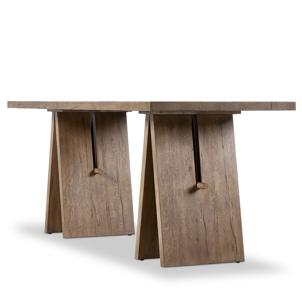 A minimalist frame on this large-scale desk lets the natural character of cracked oak take center stage. Designed with A-frame legs with exposed wood dowel joinery.