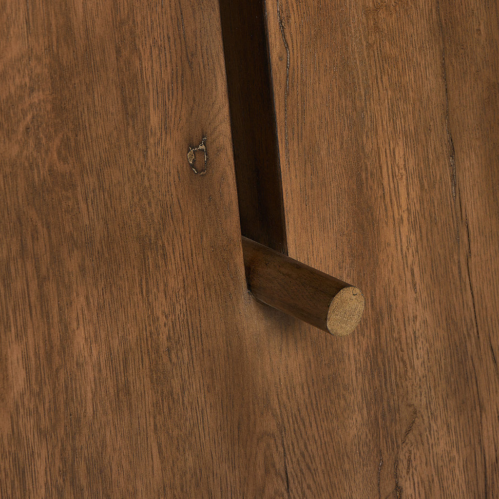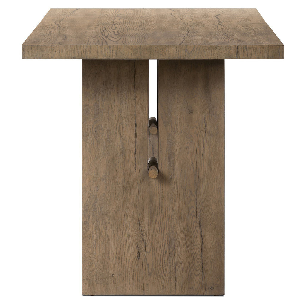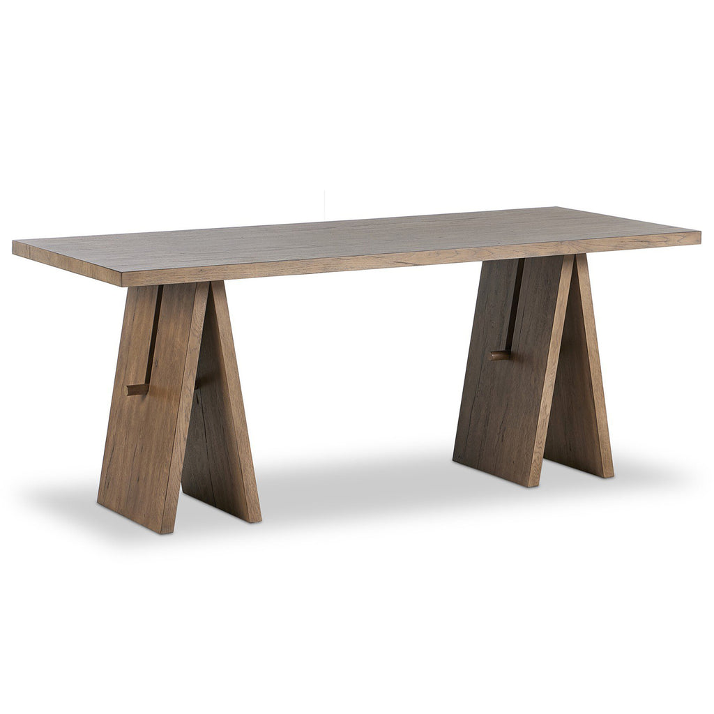 A minimalist frame on this large-scale desk lets the natural character of cracked oak take center stage. Designed with A-frame legs with exposed wood dowel joinery.