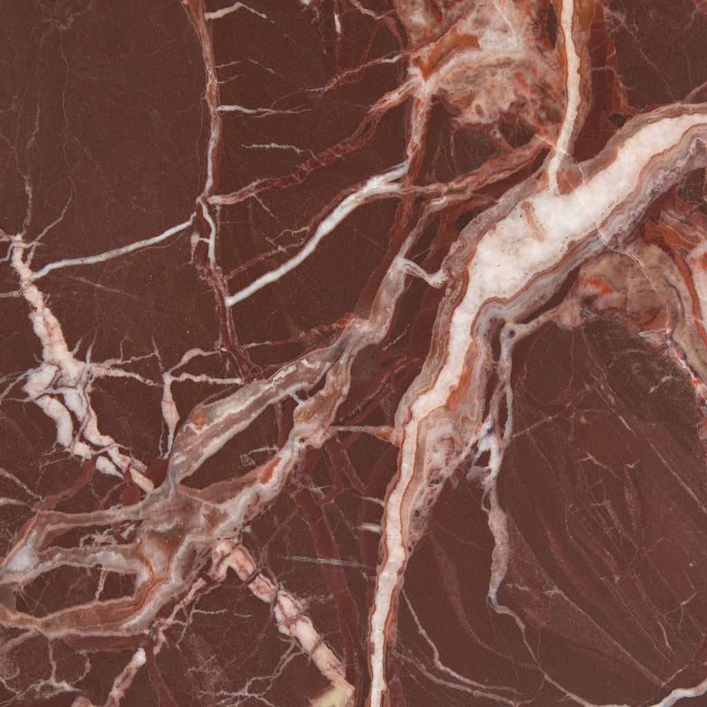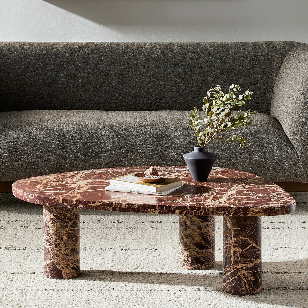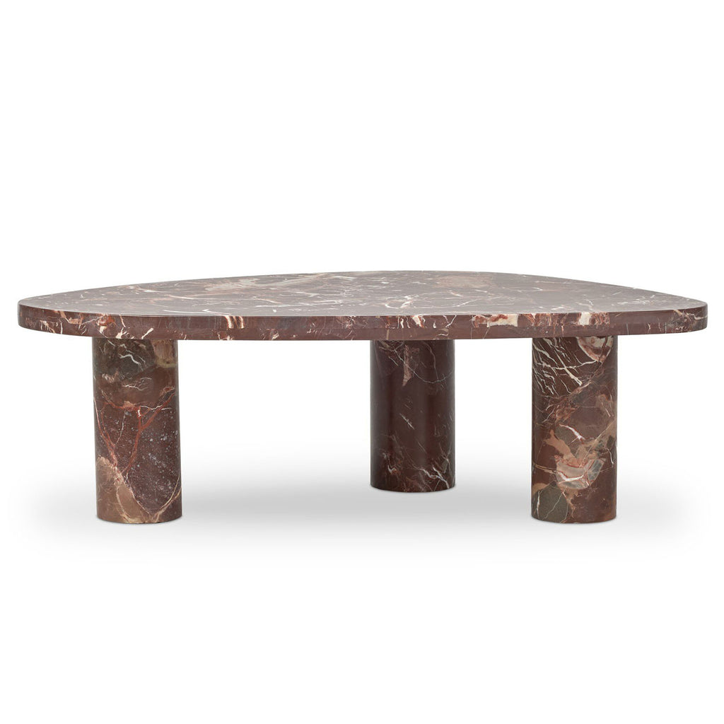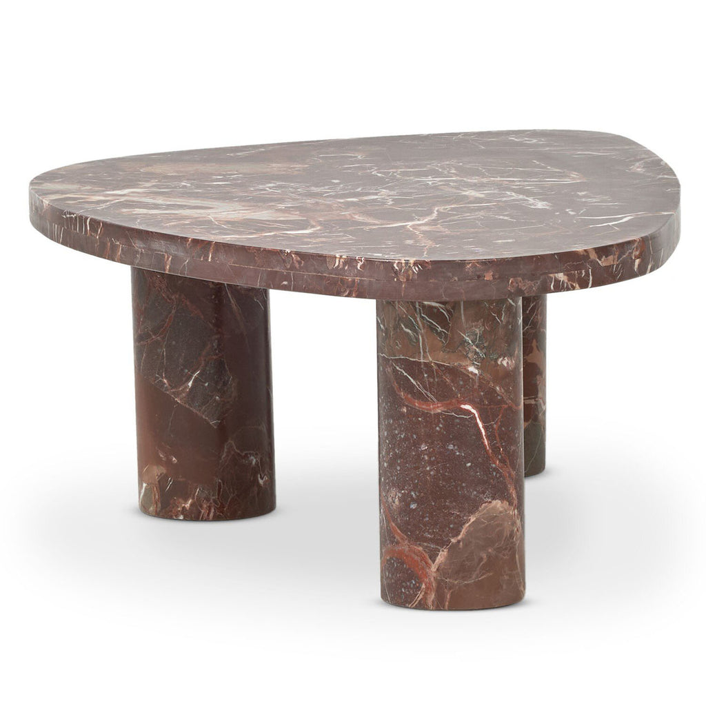 Shape and material share the spotlight in this tripod-style coffee table of solid marble. With turned, pillar legs and a rich merlot finish, with dramatic natural veining.