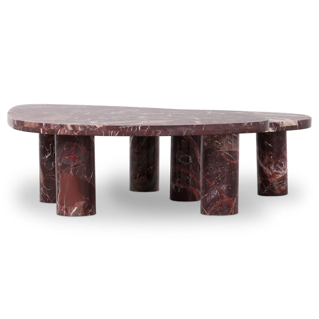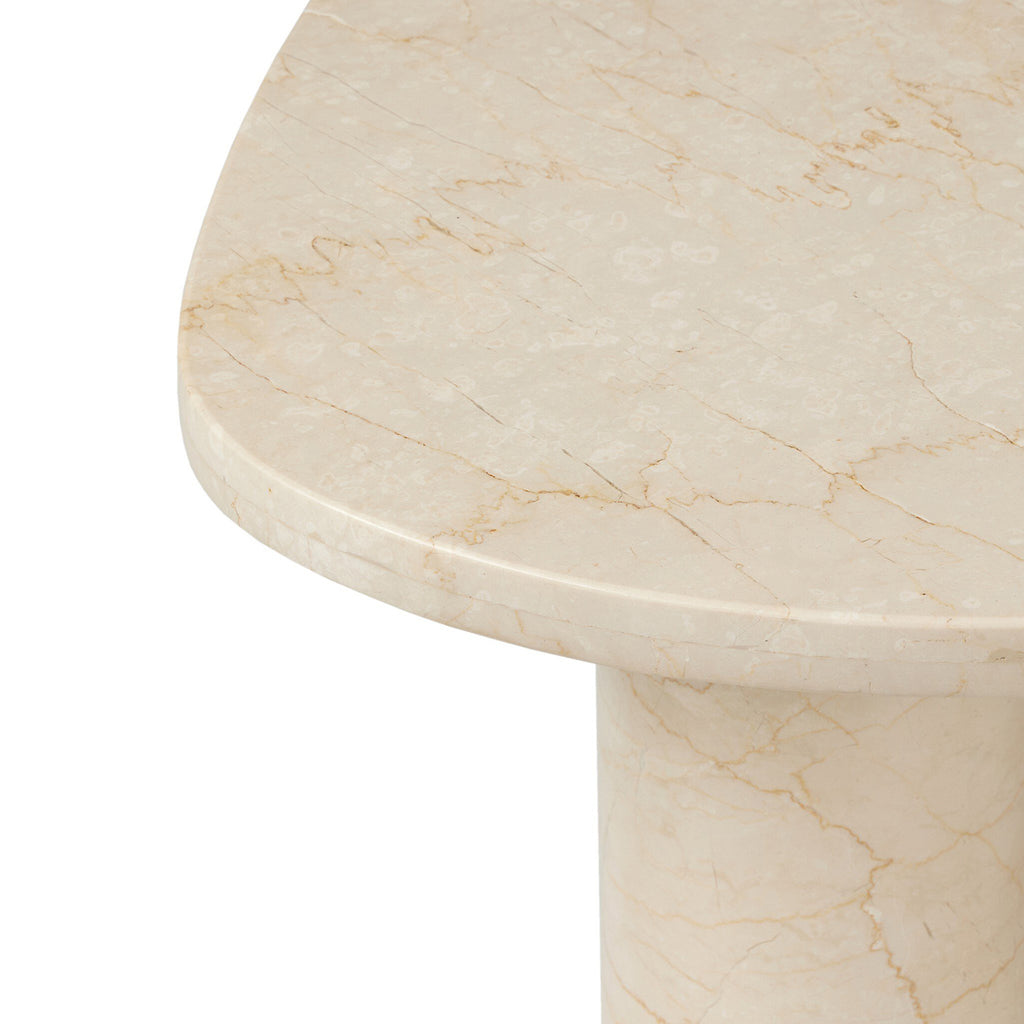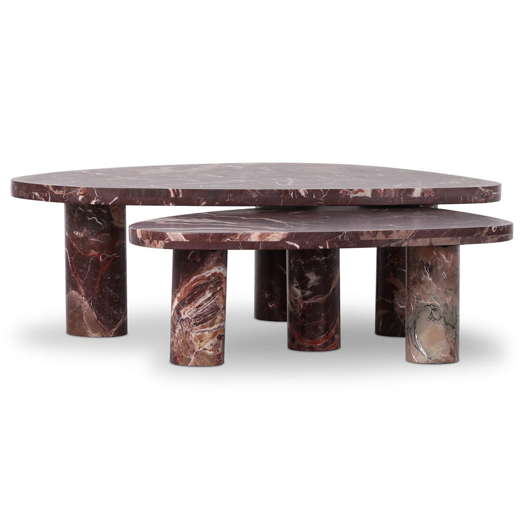 Made from solid marble with visible natural veining, turned pillar-style legs complement organically shaped tabletops, perfectly sized for nesting. Option to buy tables individually or together as a two-piece set.