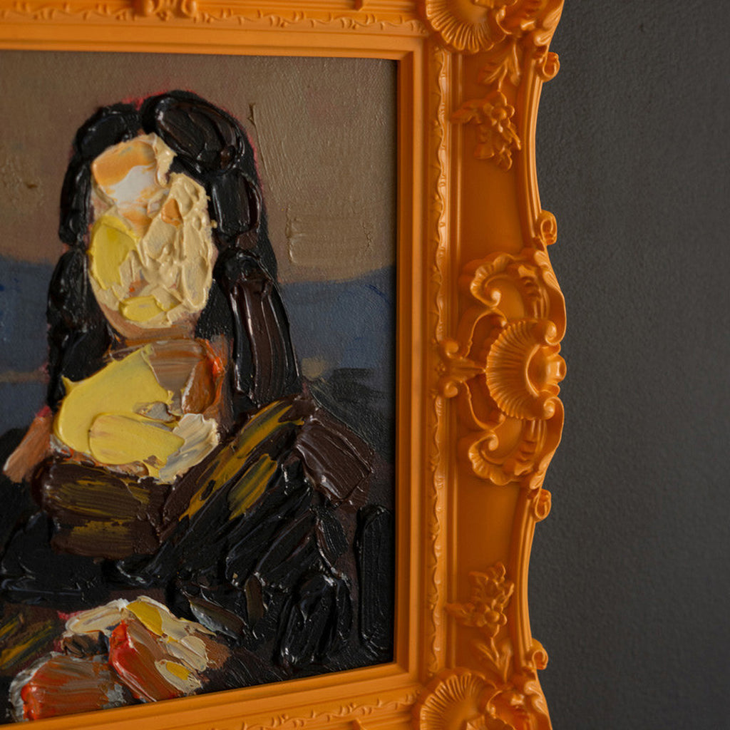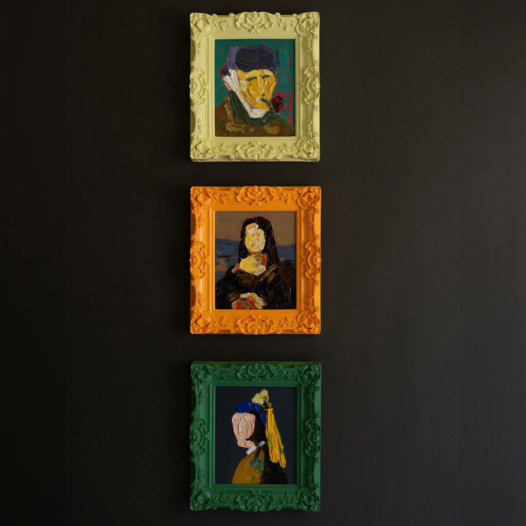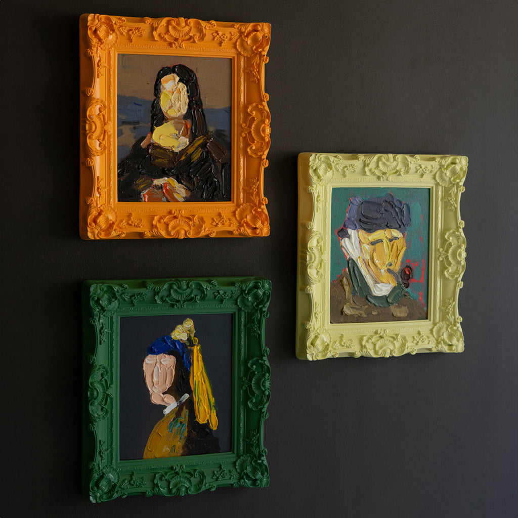 Bright frames in yellow, orange, and green define this set of three recognizable portraits that are just a little off. These make a great addition to artistic spaces of every stripe and add a bit of modern flair to stodgy walls. Grab a set for your mantle or gift shop decor.