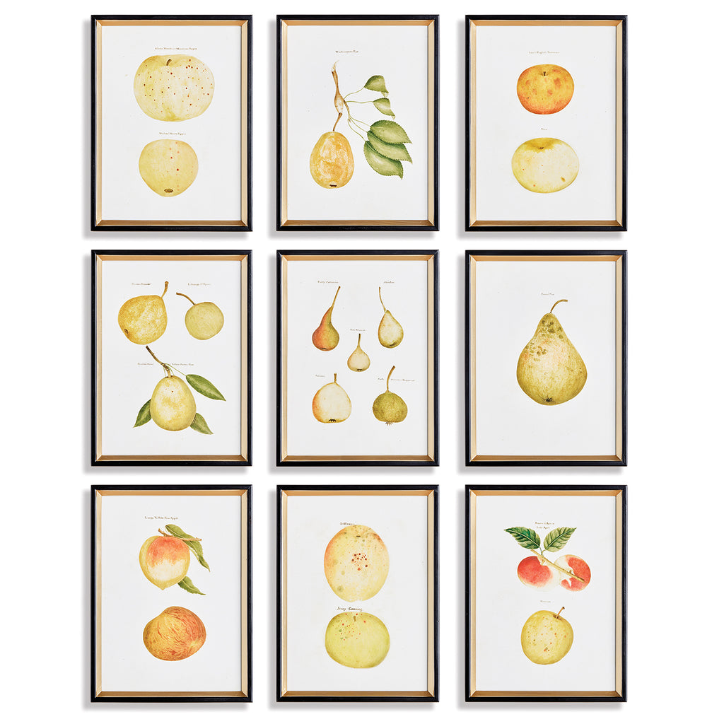 This set of nine assorted fruit studies offers a detailed look at the beauty of the artist's frequent subject. This extensive, yet simple set highlights the subtlety of color and form in these varieties. A darling set which can also be broken up into vignettes for the smaller space.